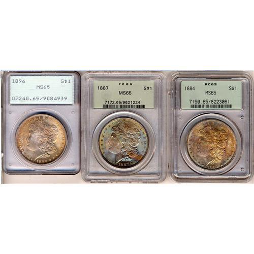 Lot of Three Mixed Dates Morgan Dollars. Splendid toning on: 1884, 1887, and 1896. (#7150)