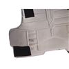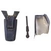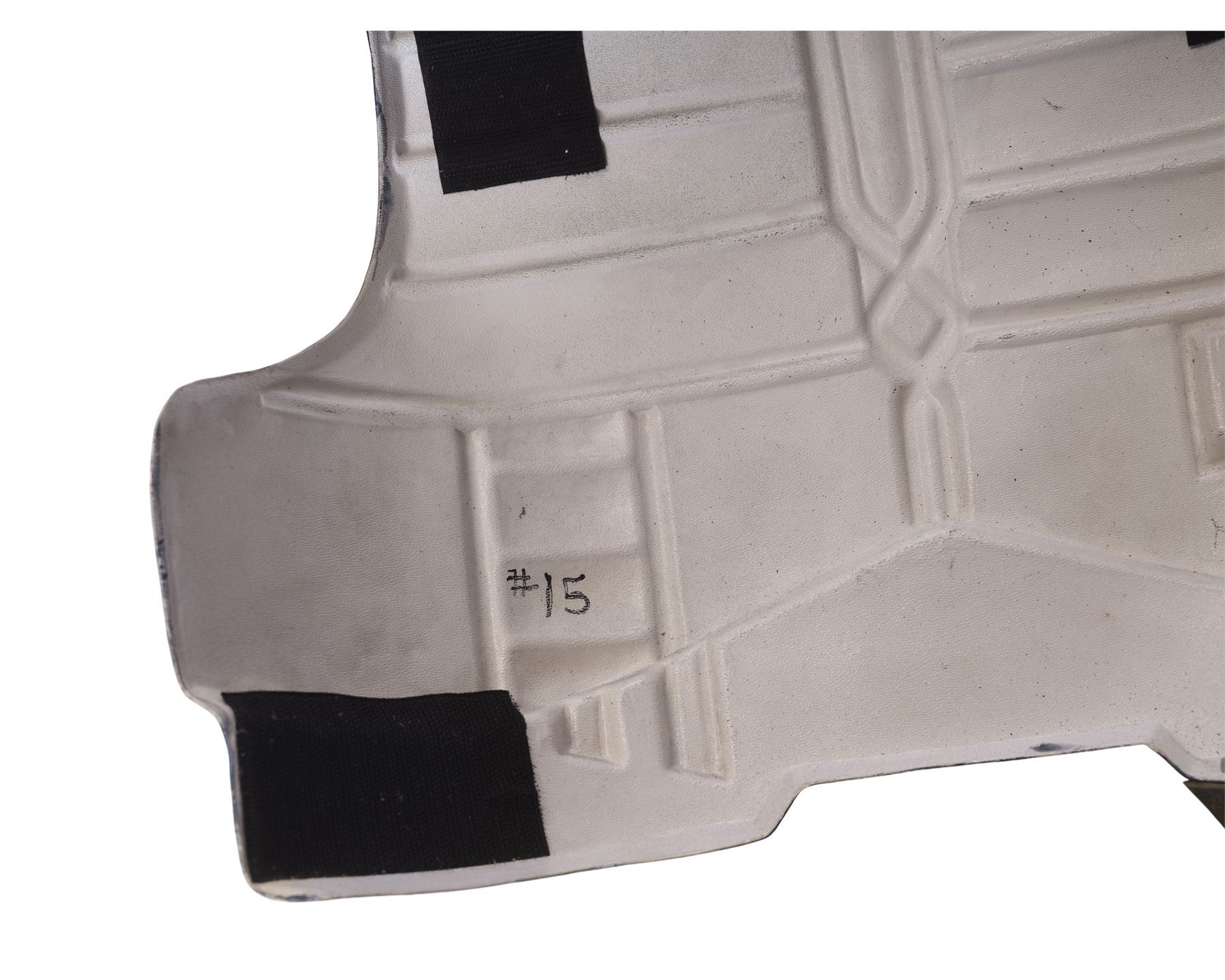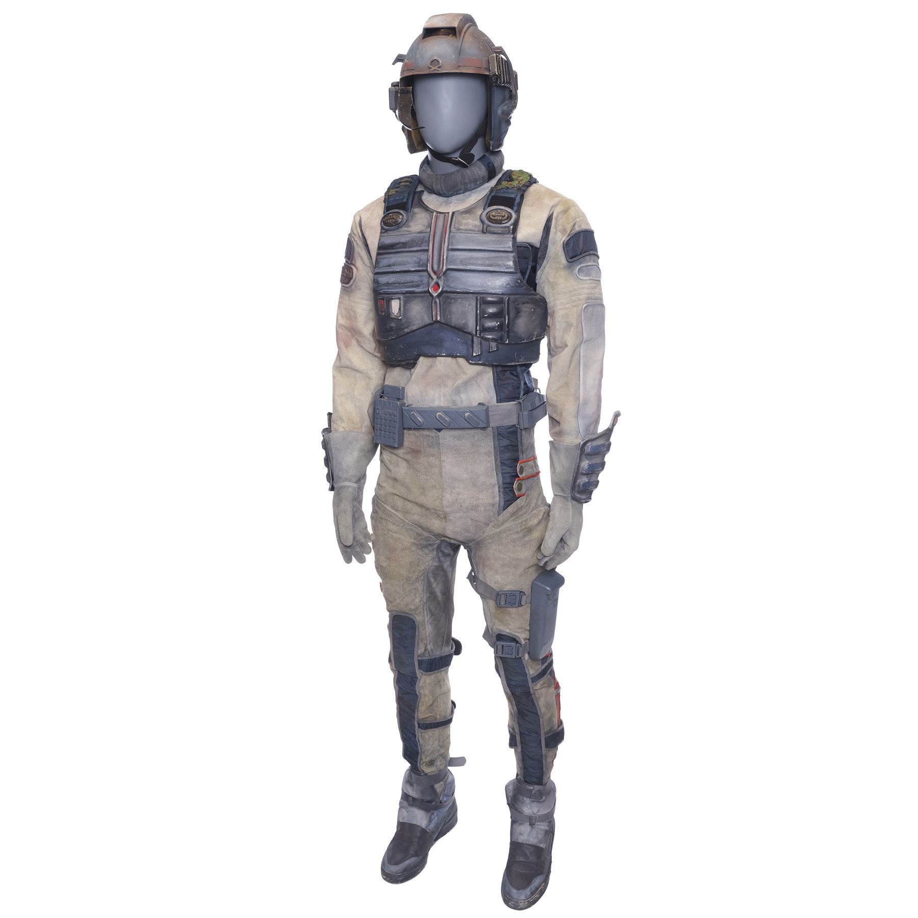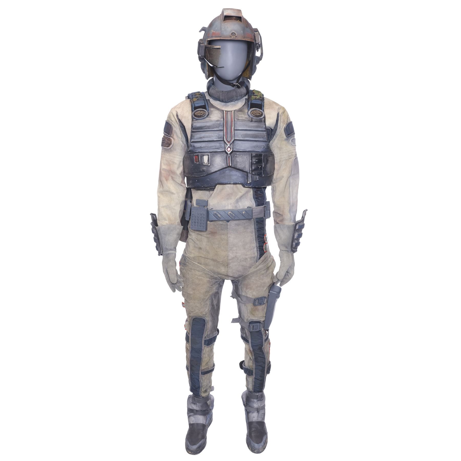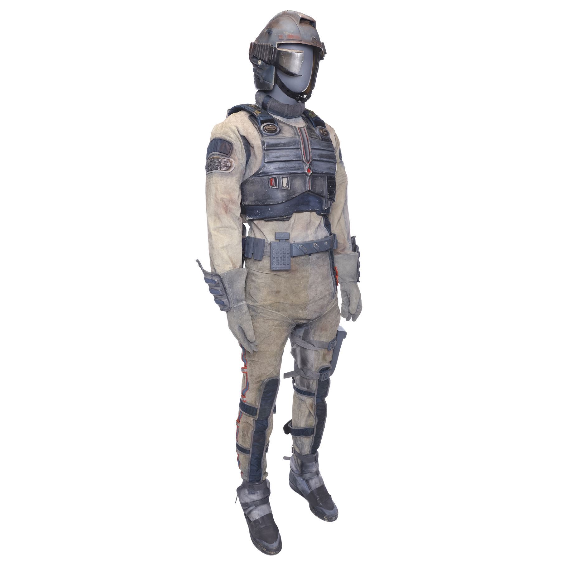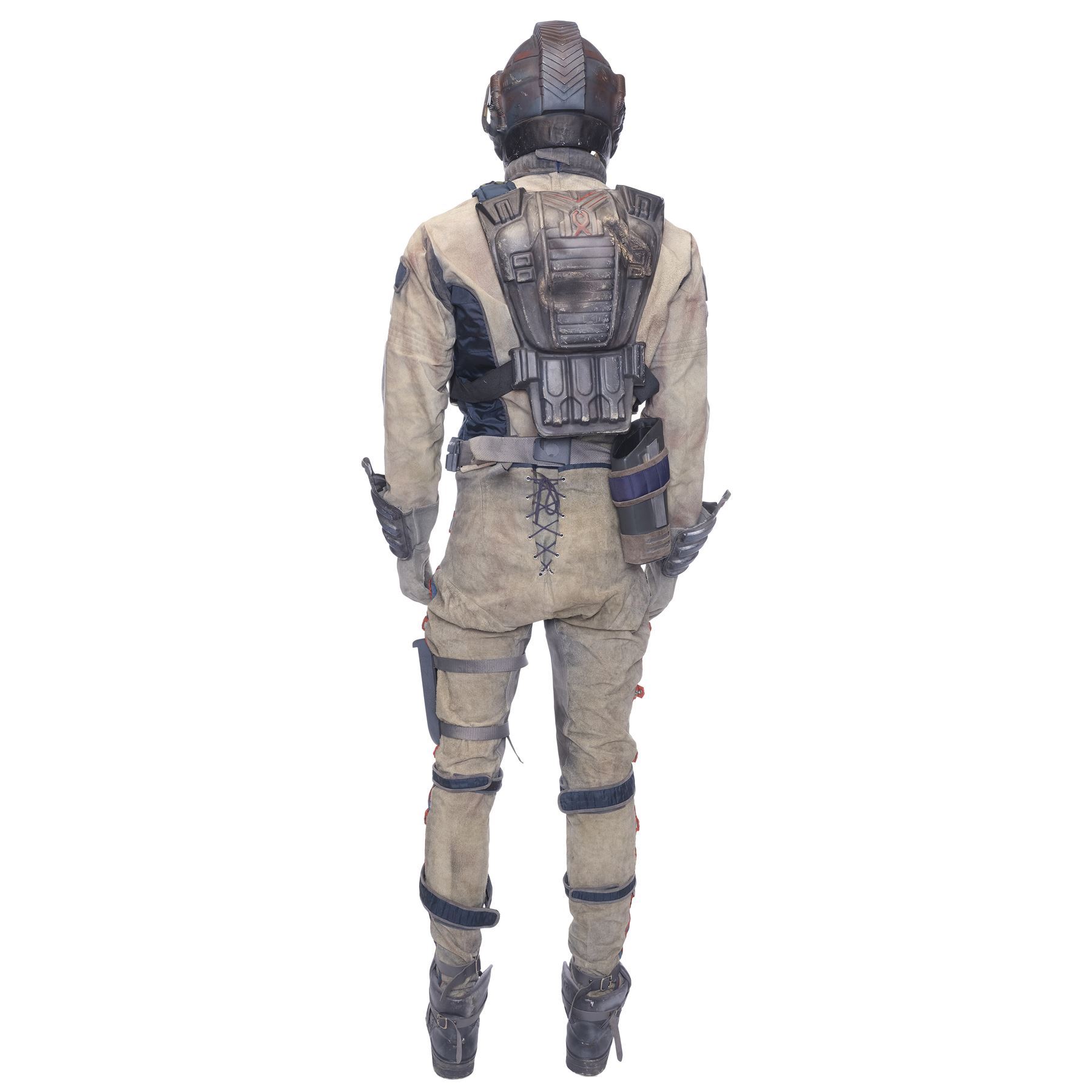 This costume consists of a black-painted fiberglass helmet with an acrylic visor; black- and red-painted plastic chest armor marked "#15" with padded straps; a gray and navy cotton, suede, and leather jacket labeled "2113-1 Stock 45 36"; matching trousers labeled "2048-1 Stock 36 33"; gray suede gloves (8 1/2) with gray and blue plastic accents; a gray nylon belt with gray-painted resin details, and a urethane holster wrapped in gray leather; and gray-painted Adidas (11 1/2) with production added details. The costume exhibits major discoloration, a broken visor, and broken armor accessories.