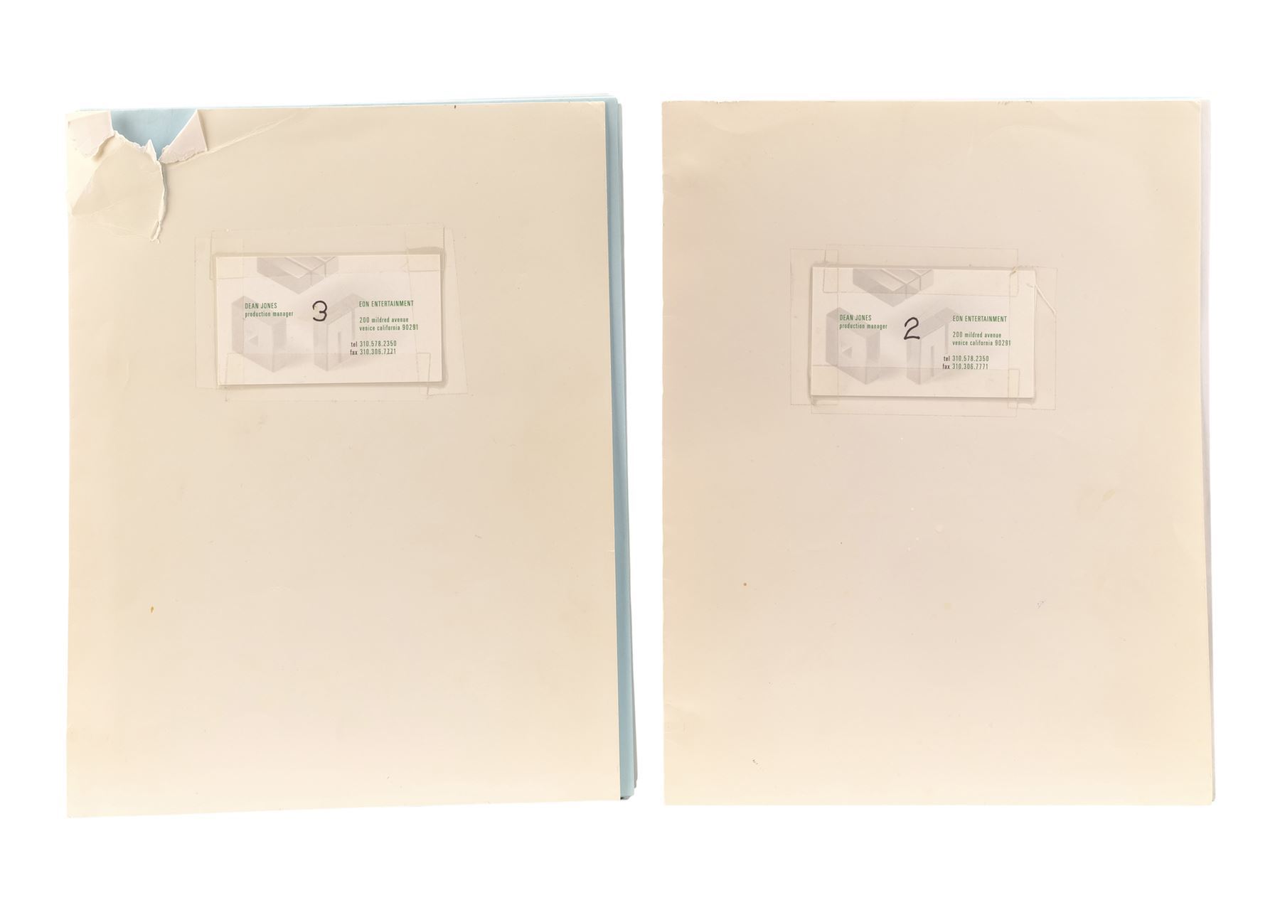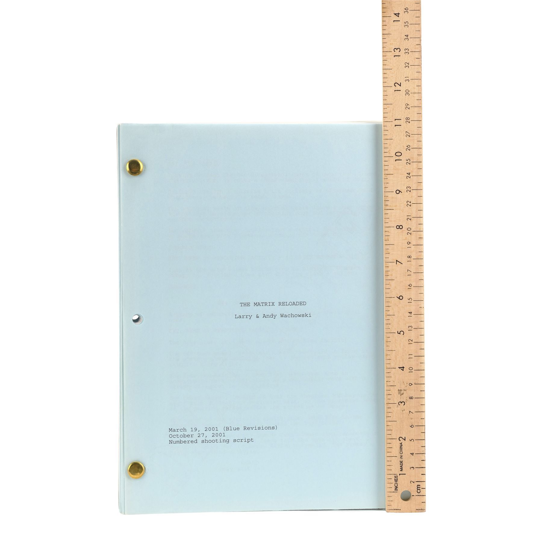 This lot comes from the collection of The Matrix Reloaded and Revolutions production manager L. Dean Jones, Jr. The 133-page numbered shooting script for Reloaded is dated "October 27, 2001," bound with brass brads, and watermarked throughout for Jones. The 133-page Revolutions script is dated "October 27, 2000," bound with brass brads, watermarked throughout for Jones, and hand-marked "Rec'd 11/17/00" on the front cover. Both exhibit minor edge wear from handling. Dimensions: (each) 11" x 9" x 1" (28 cm x 23 cm x 2.5 cm)