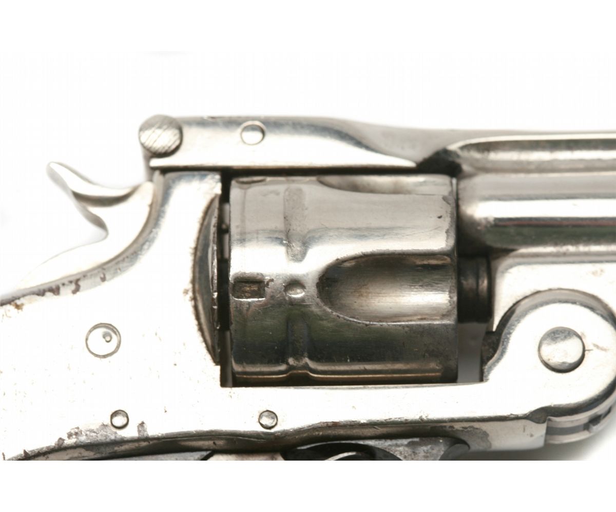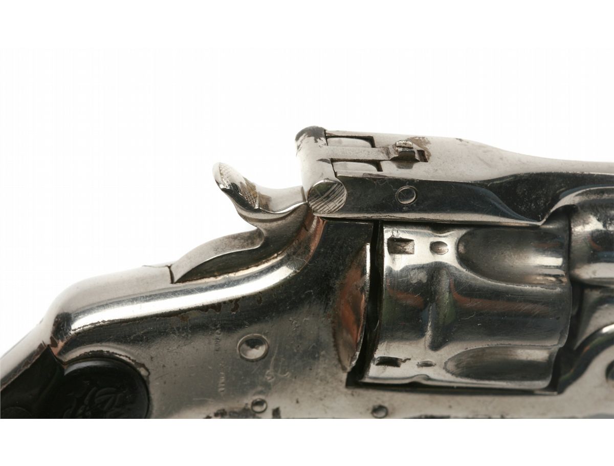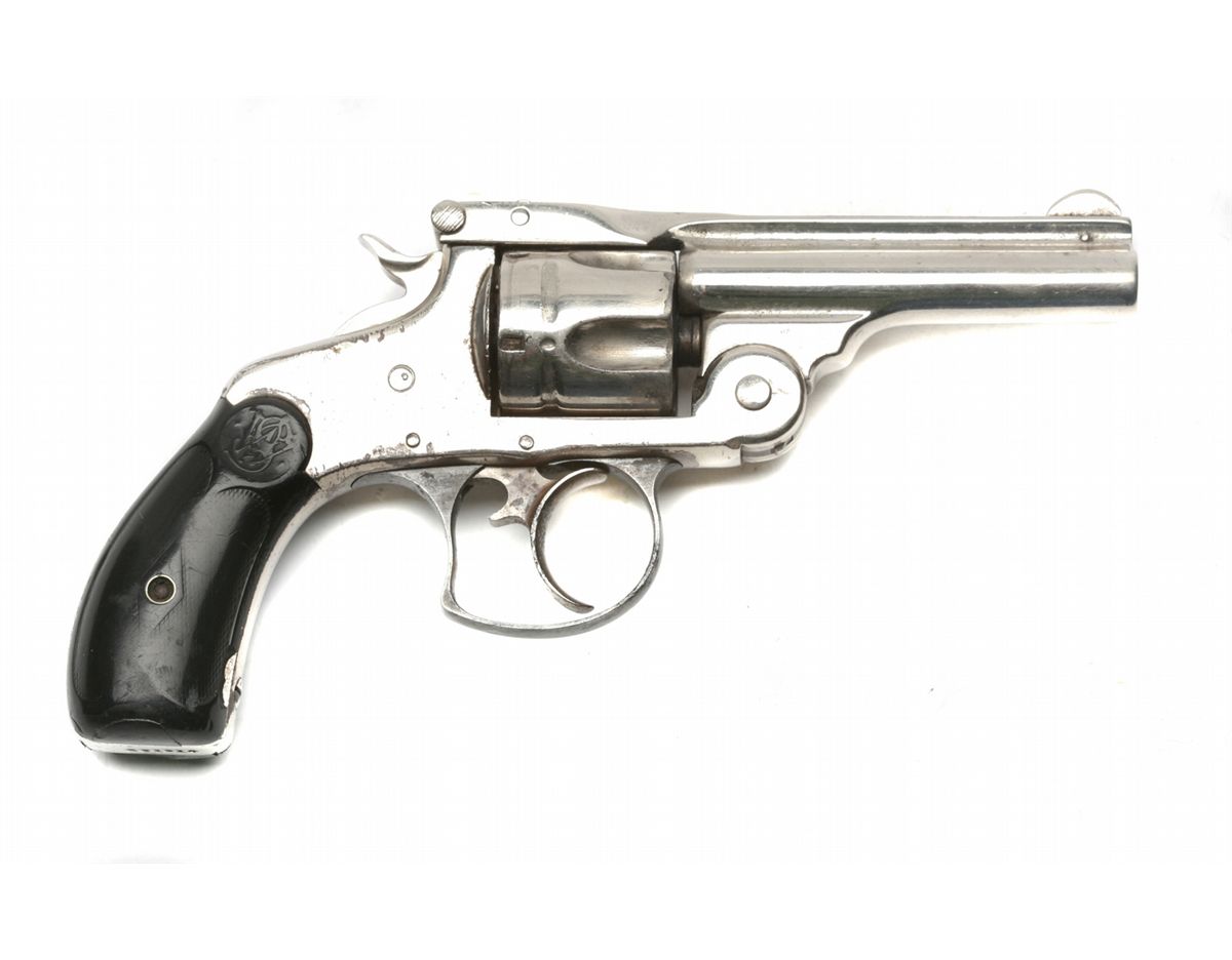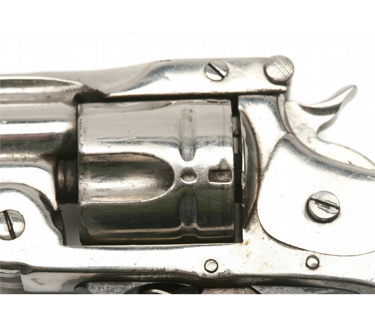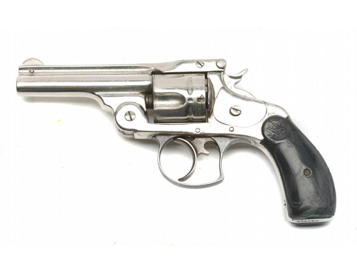 Very Good condition as refinished - 3.25" barrel - 87% remaining factory nickel, wear to grip straps/high edges - checkered hard rubber grips in worn, damaged S&W logo - front round pinned blade & rear notch sights - 2-line barrel address barely visible - 5-point star on butt - matching SN on butt/cylinder/barrel - American double-action top break - yr. mfg: 1880-1884 - SN 40191 - est. 200 - 400 - Antq - 25PMGKS003
