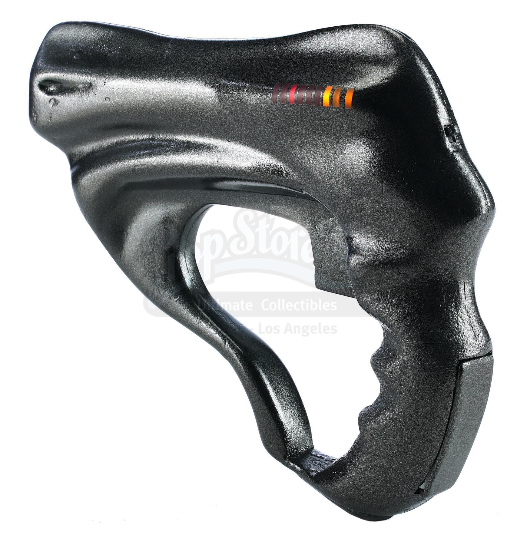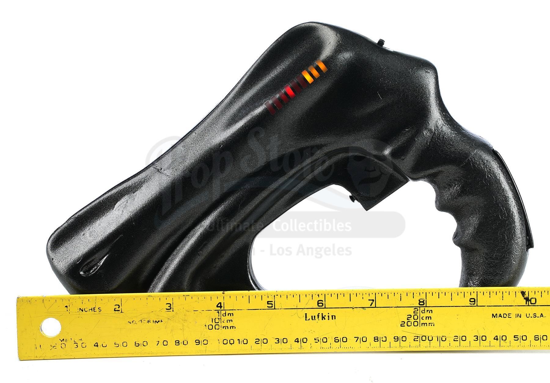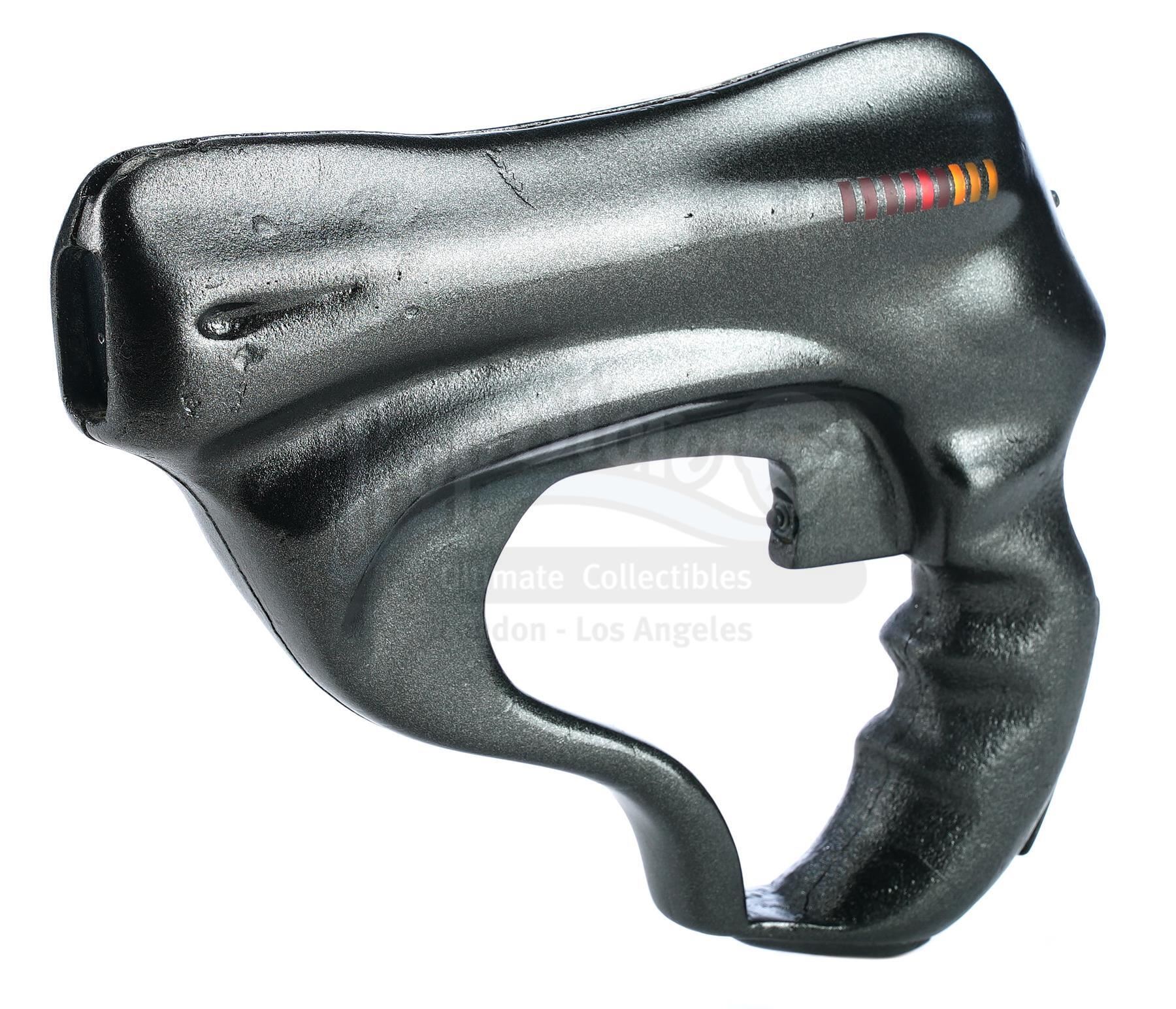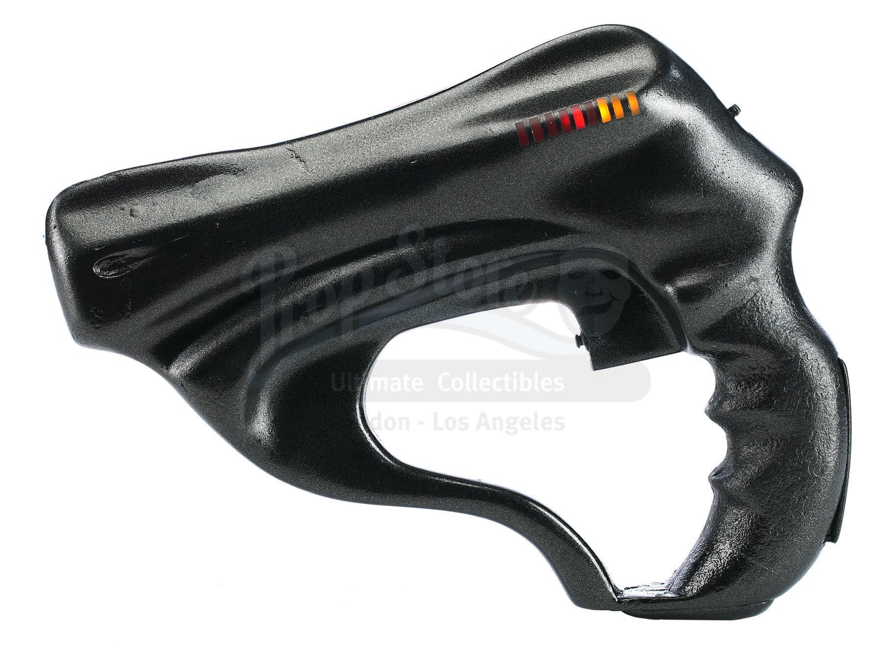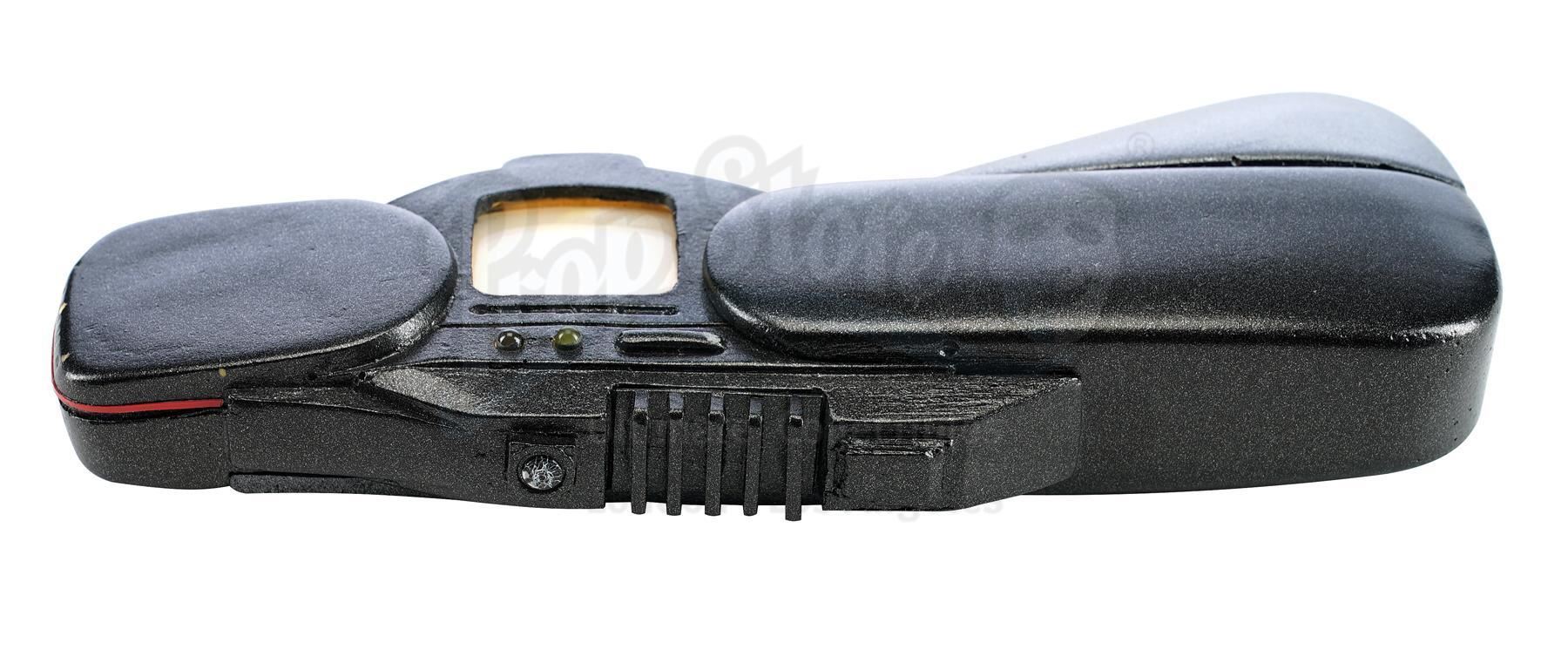 This lot will be auctioned on Thursday, July 1st. The auction will begin at 9:00am PDT and lots are sold sequentially via live auctioneer; tune in to the live streaming broadcast on auction day to follow the pace. Note other lots in the auction may close on June 29th or June 30th. A light-up VPAL communicator and pulse pistol from Seasons 2 and 3 of Rockne S. O'Bannon's sci-fi adventure seaQuest DSV. Crew aboard the SeaQuest DSV 4600 carried their regulation United Earth Oceans communication devices and pulse pistols. These contoured black resin and metal devices were both custom-built for the show. A switch on the communicator's side illuminates red and green lights and a white screen, while buttons on the pistol's trigger and hammer illuminate red and orange lights. The lot exhibits some scuffs and scratches from production use, but remains in good overall condition. Dimensions (communicator): 7" x 2.5" x 1" (17.75 cm x 6.5 cm x 2.5 cm); (pistol): 9" x 7" x 1" (23 cm x 17.75 cm x 2.5 cm) Contains electronic components; see notice in the Buyer's Guide. Estimate: $1,200 - 1,800