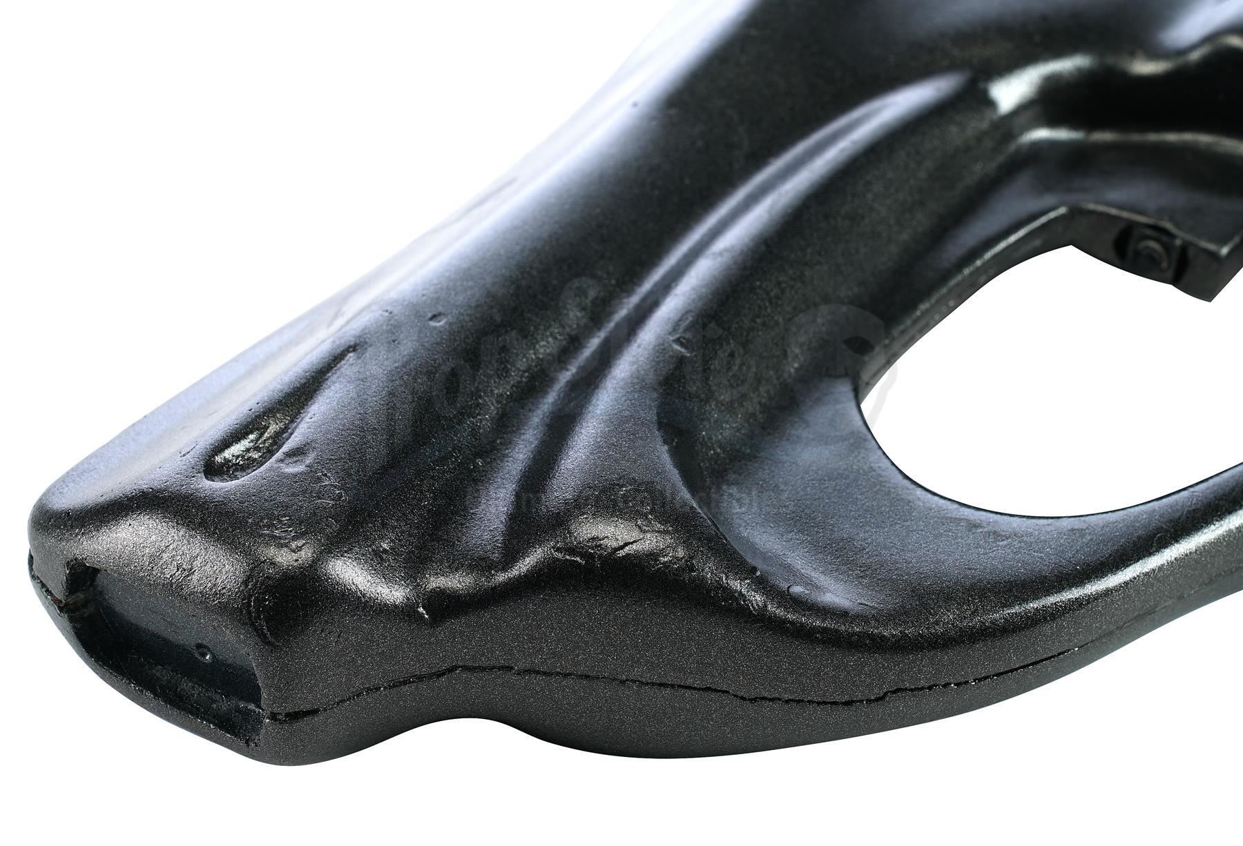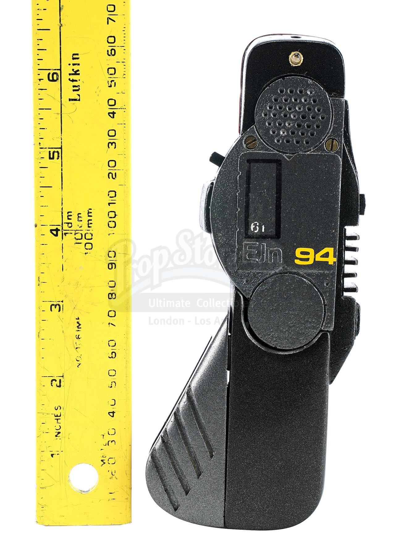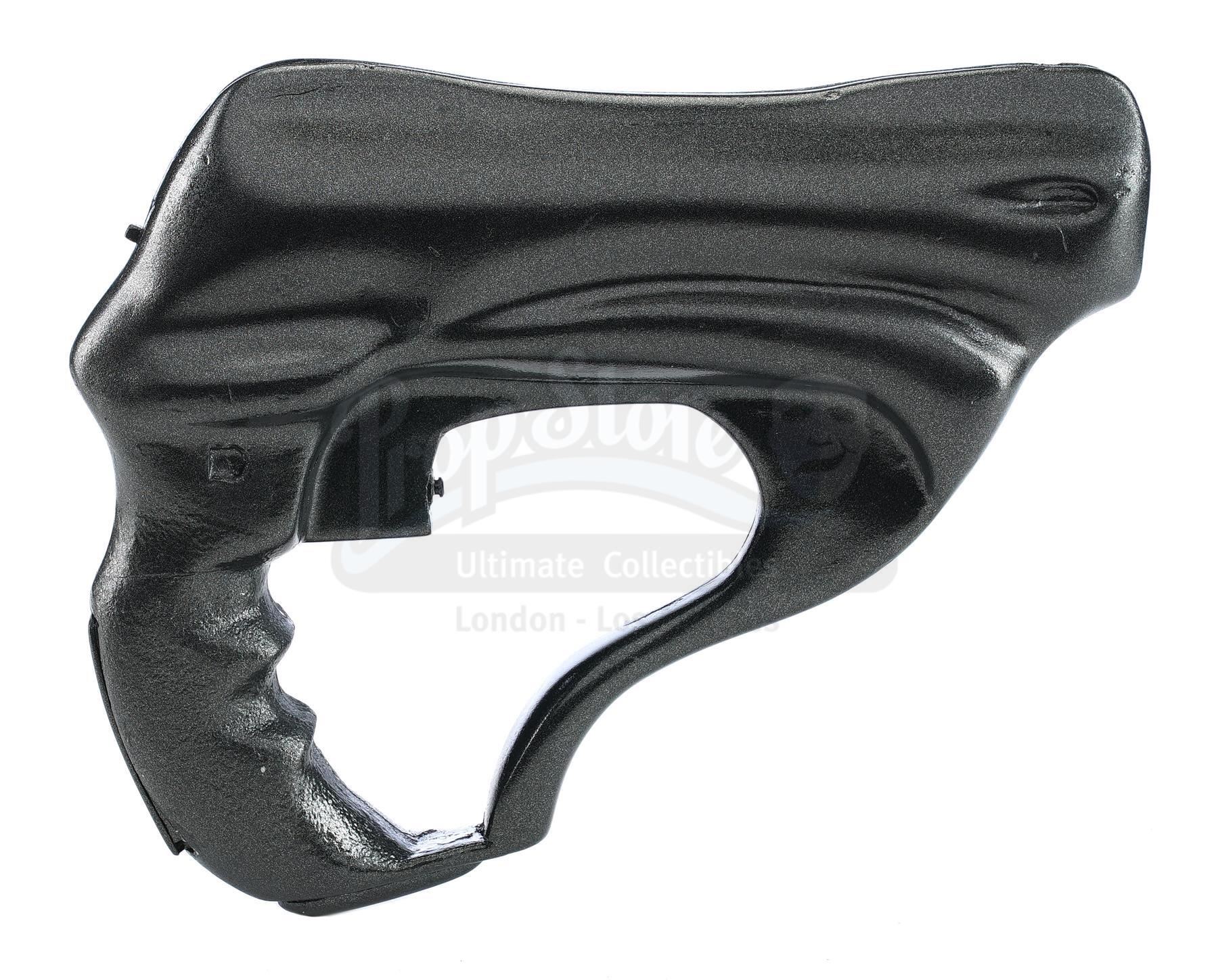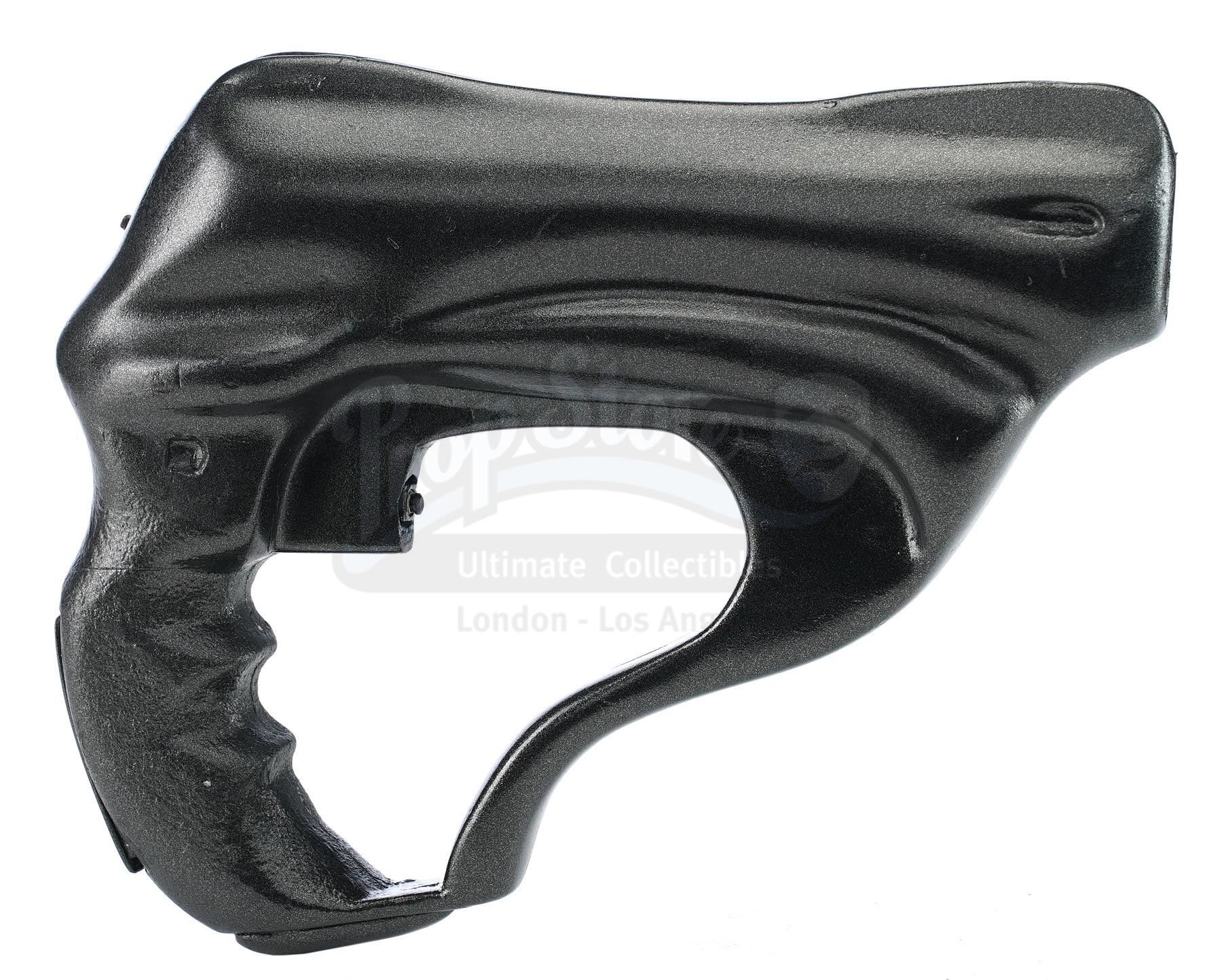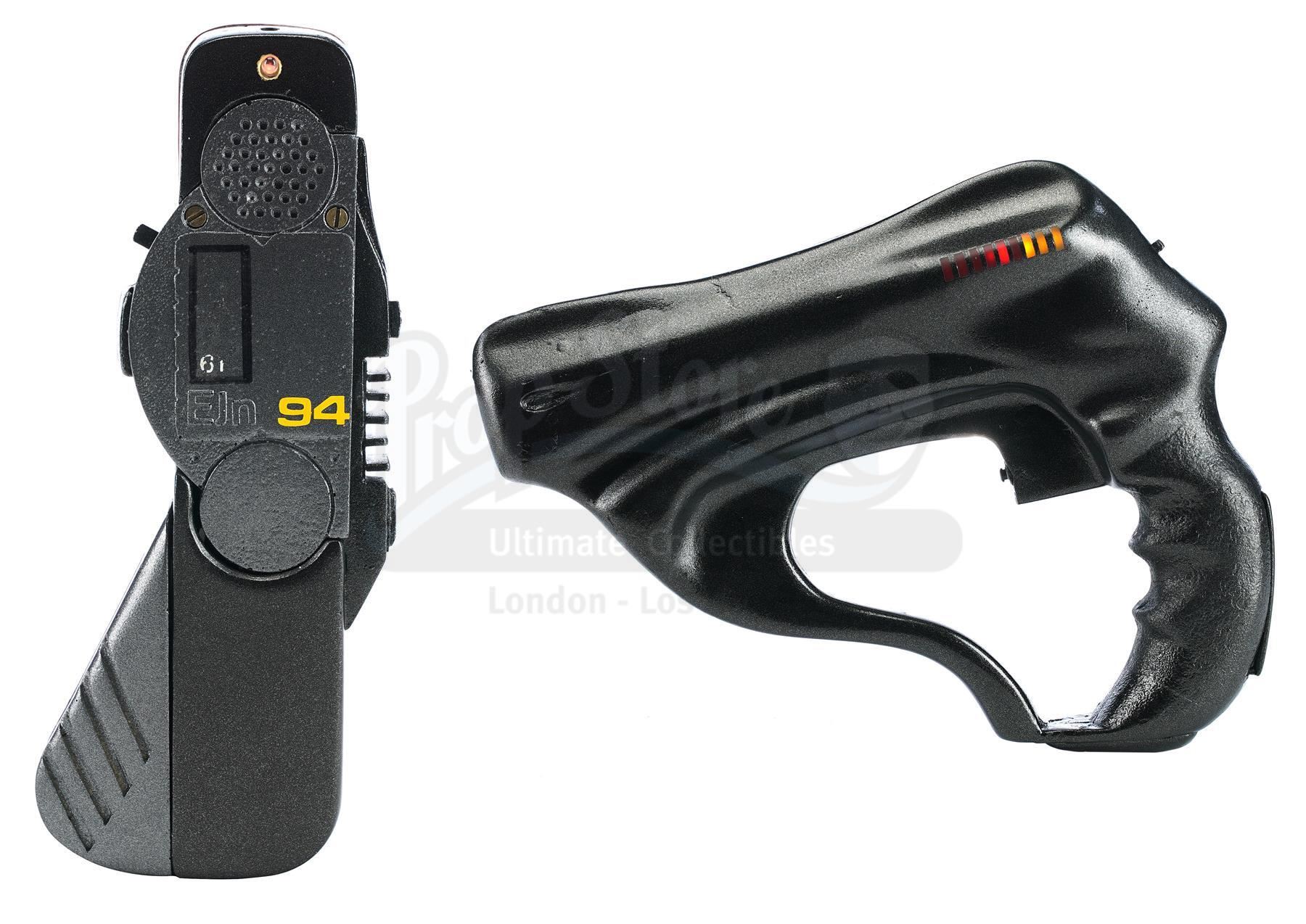 This lot will be auctioned on Thursday, July 1st. The auction will begin at 9:00am PDT and lots are sold sequentially via live auctioneer; tune in to the live streaming broadcast on auction day to follow the pace. Note other lots in the auction may close on June 29th or June 30th. A light-up VPAL communicator and pulse pistol from Seasons 2 and 3 of Rockne S. O'Bannon's sci-fi adventure seaQuest DSV. Crew aboard the SeaQuest DSV 4600 carried their regulation United Earth Oceans communication devices and pulse pistols. These contoured black resin and metal devices were both custom-built for the show. A switch on the communicator's side illuminates red and green lights and a white screen, while buttons on the pistol's trigger and hammer illuminate red and orange lights. The lot exhibits some scuffs and scratches from production use, but remains in good overall condition. Dimensions (communicator): 7" x 2.5" x 1" (17.75 cm x 6.5 cm x 2.5 cm); (pistol): 9" x 7" x 1" (23 cm x 17.75 cm x 2.5 cm) Contains electronic components; see notice in the Buyer's Guide. Estimate: $1,200 - 1,800