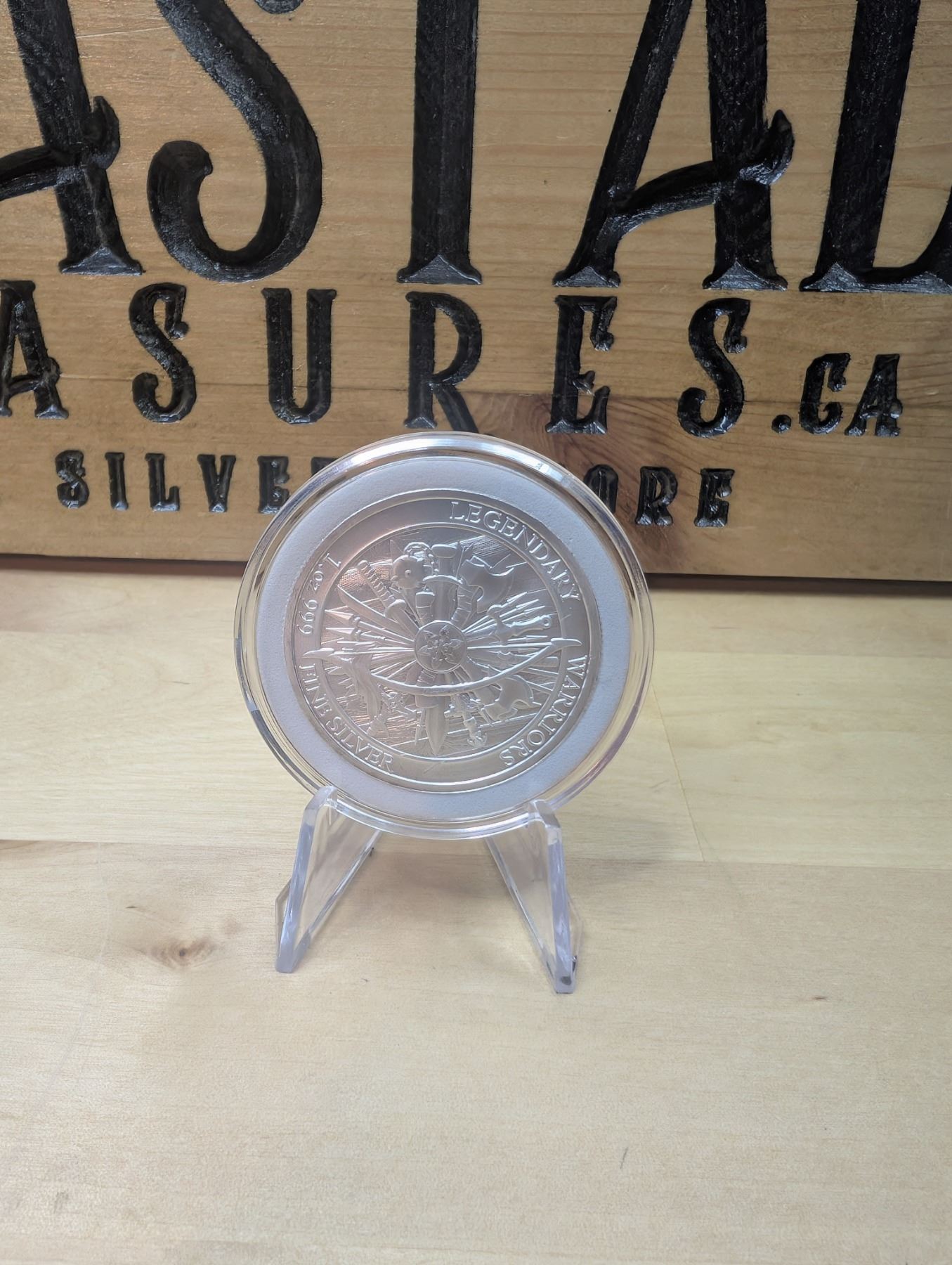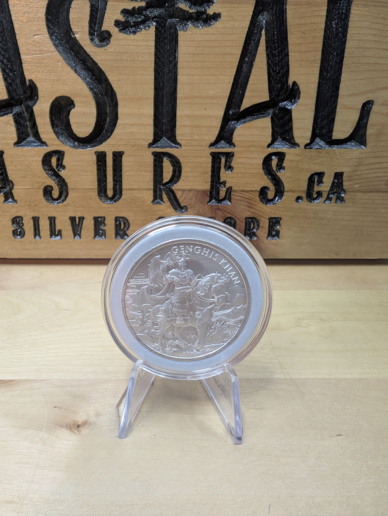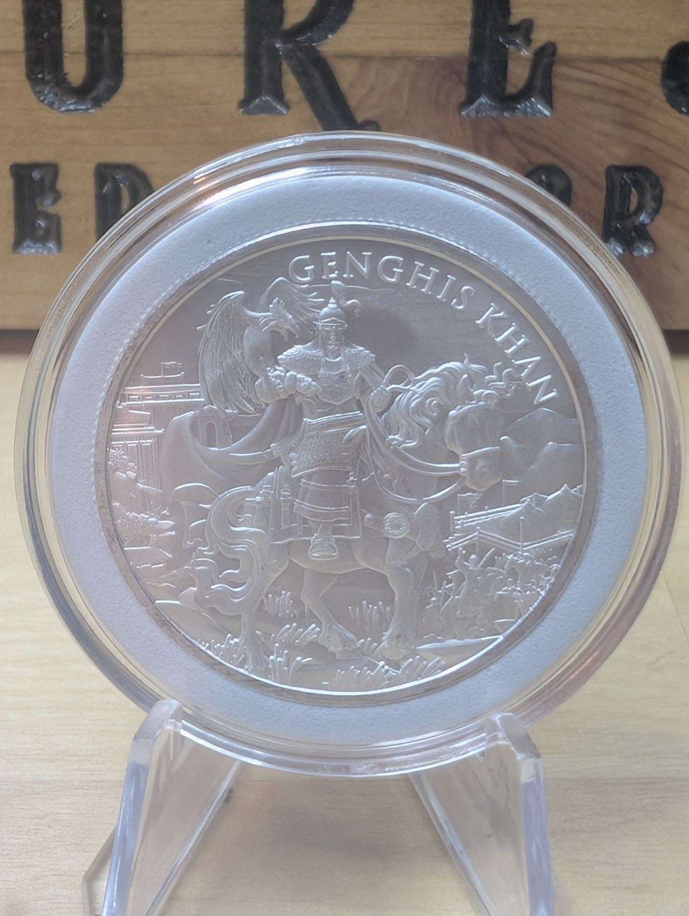 The 1 oz Genghis Khan Silver Coin typically features an image of Genghis Khan, the legendary Mongol emperor and military leader who founded the Mongol Empire. The coin contains 1 ounce of .999 fine silver and is often designed with a detailed portrait of Genghis Khan, sometimes accompanied by symbolic elements of Mongol culture, such as horses, arrows, or the Mongol banner. This coin is part of a series celebrating historical figures and is popular with collectors due to its combination of historical significance and silver content