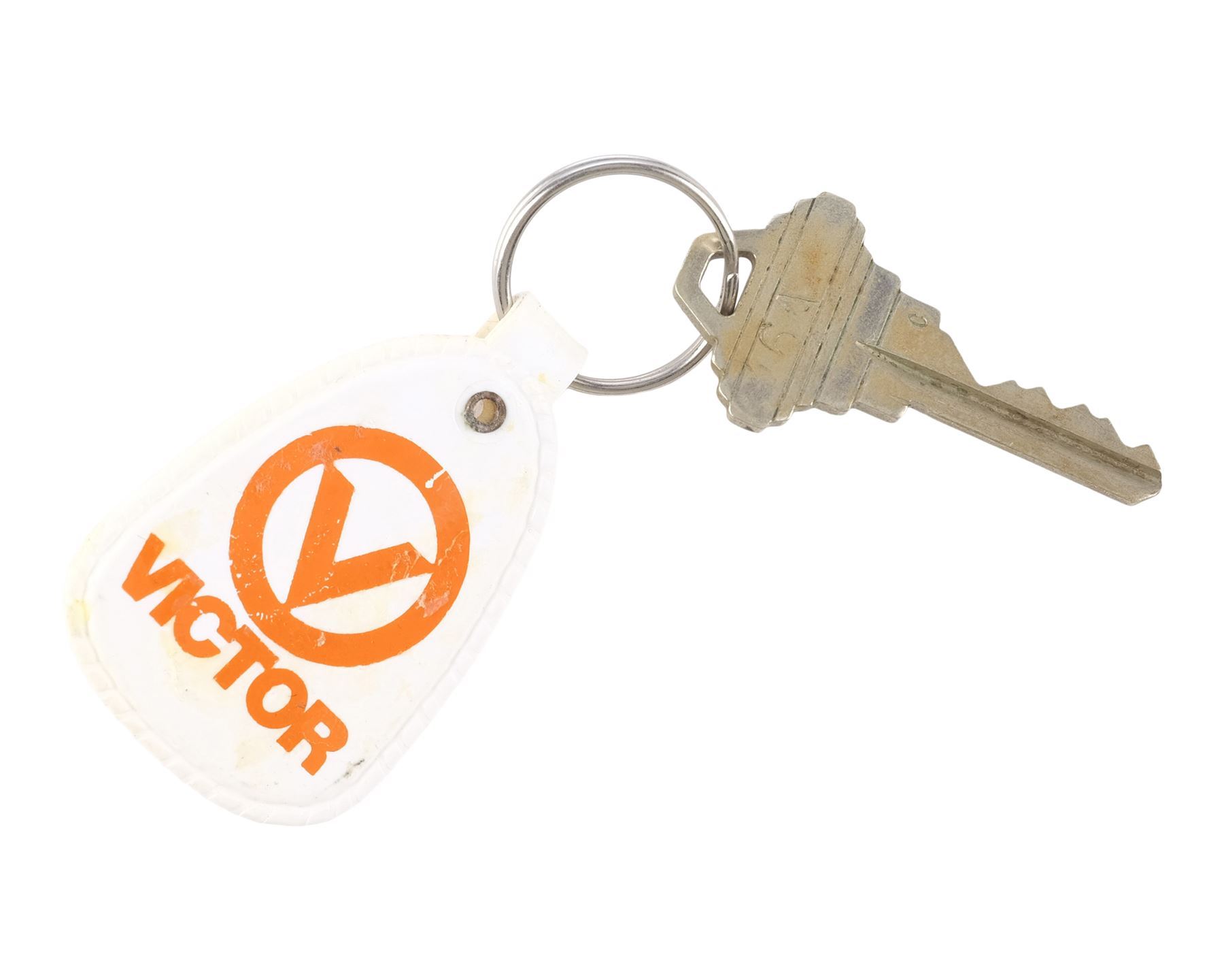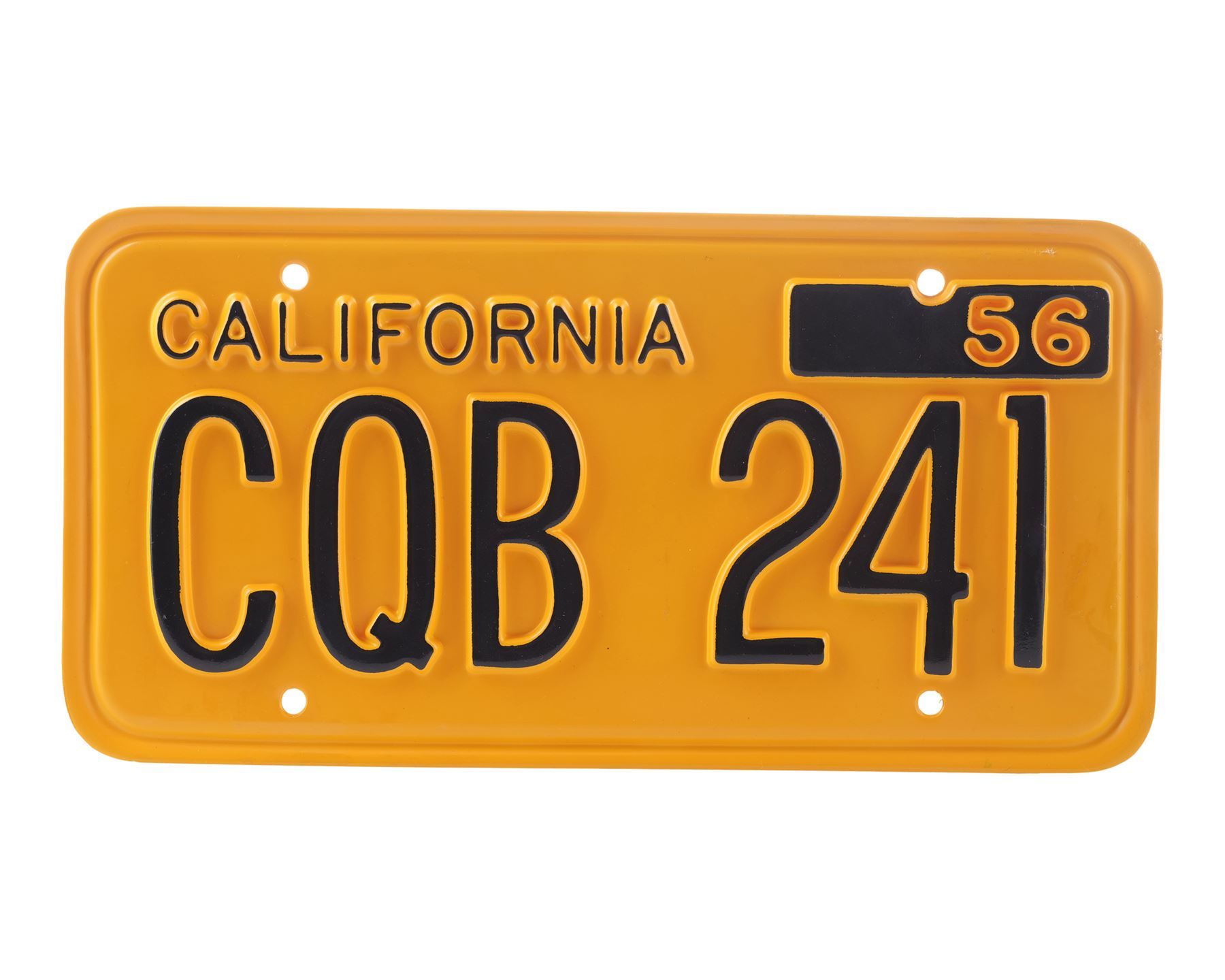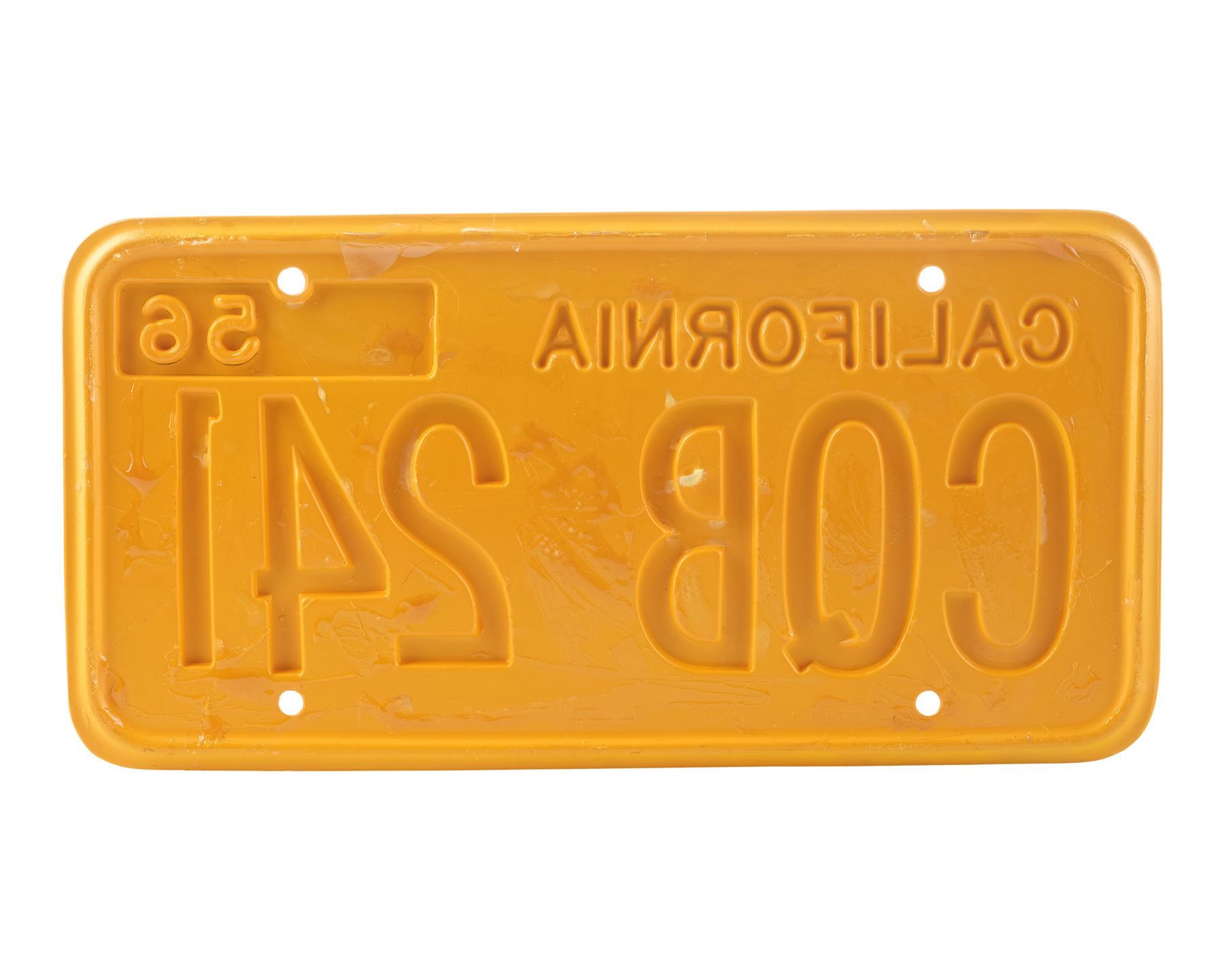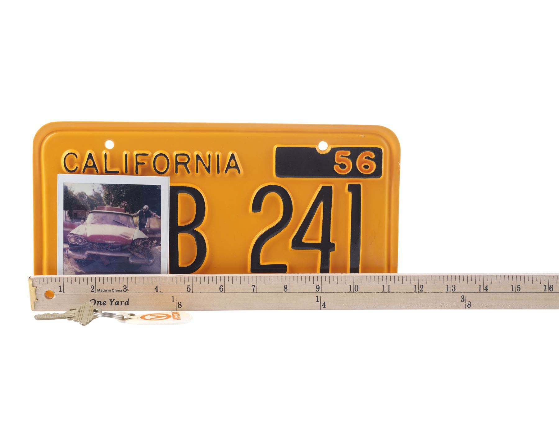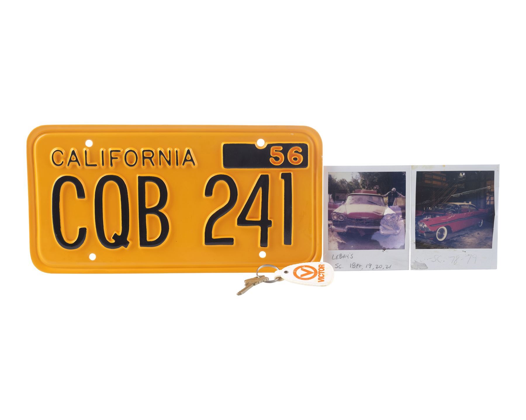 This lot consists of a yellow plastic California license plate with black lettering reading "CQB 241" and "56"; a metal key believed to be a house key attached to a white and orange plastic Victor keychain, and two color photos of the car hand-marked "SC 78-79" and "LeBay's Sc 18pt, 19, 20, 21" respectively. The plate exhibits minimal chipping to its finish and adhesive residue on the back; the keychain exhibits scuffing and staining; and the photos exhibit staining, crumpling to the borders, and tears in the back. Dimensions: (largest) 12" x 6" x 0.25" (30.5 cm x 15.25 cm x 0.75)