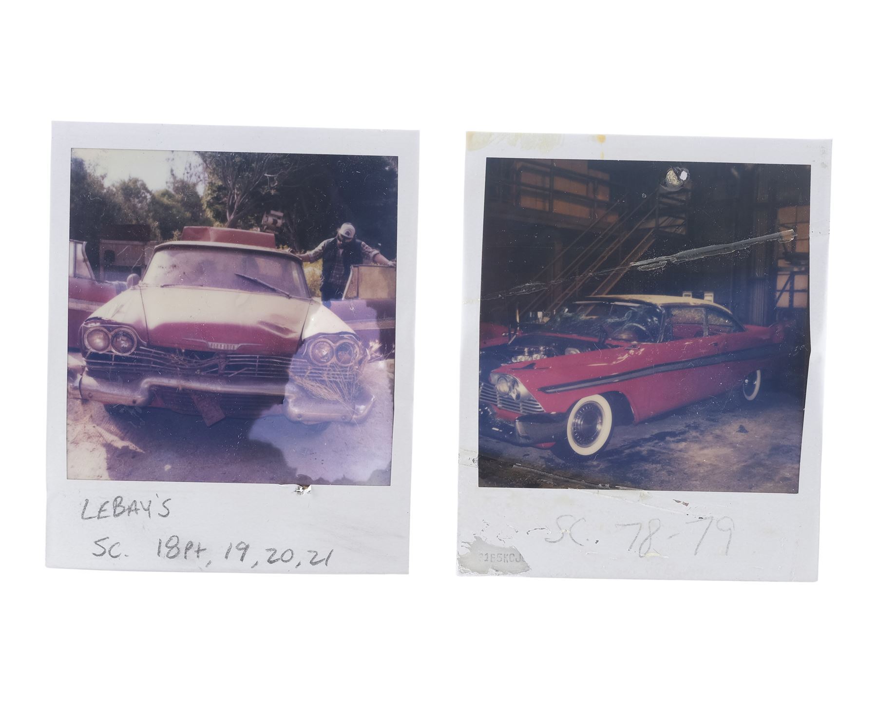 CHRISTINE (1983) - Christine's License Plate, Key, and Two Production Photos - Christine's license plate, key, and two production photos from John Carpenter's adaptation of Stephen King's supernatural horror Christine. Arnie Cunningham (Keith Gordon) purchased Christine, a 1958 Plymouth Fury, with the desire to fix it up, but Christine had other, darker intentions.