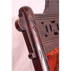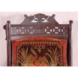 Collapsible Victorian Carpet Rocking Chair. Made of walnut, this old chair is missing a piece of molding off the crest and a stretcher off the base. It has original carpet and finish. Nice East Lake style carving. American, Ca. 1880. 37.5"h x 20"w x 30.5"d. Est. $60 - $100.