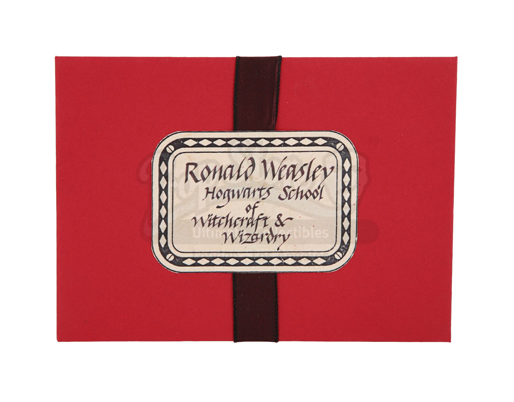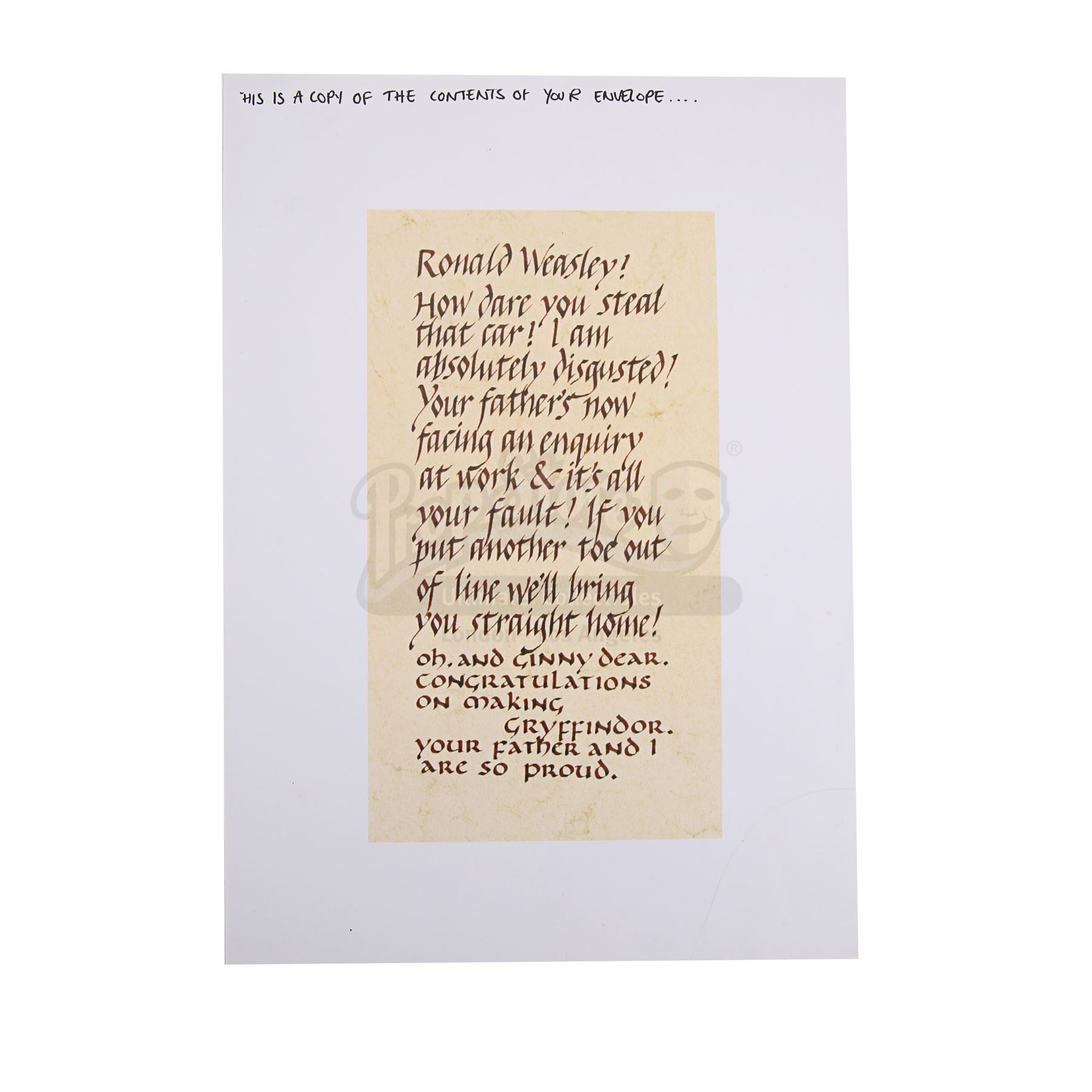 This lot will be auctioned on Tuesday, June 29th. The auction will begin at 9:00am PDT and lots are sold sequentially via live auctioneer; tune in to the live streaming broadcast on auction day to follow the pace. Note other lots in the auction may close on June 30th or July 1st. A howler letter used in Chris Columbus' fantasy-adventure sequel Harry Potter and the Chamber of Secrets. Ron Weasley (Rupert Grint) received a letter enchanted to shout at him after he and Harry (Daniel Radcliffe) stole Mr. Weasley's flying Ford Anglia to get to school. The envelope is made of heavy stock red paper with a cream-color printed address label. Metallic burgundy ribbon is wrapped vertically around it and fixed at the back with a gold-colored wax seal bearing a "W" for Weasley, which is still intact. Also included is a facsimile copy of the letter that was howled by Mrs Weasley (Julie Walters) and a charity donation letter from Warner Bros. The envelope remains in excellent overall condition. Dimensions: (envelope) 6" x 4" (15 cm x 11 cm) Estimate: $4,000 - 6,000