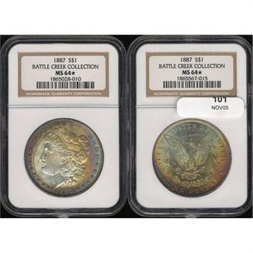 Lot of Two Toned Battle Creek Morgans.. Obverse toned 1884 NGC MS64* & Reverse toned 1887 NGC MS64*.<p><i>from The Battle Creek Collection, Part III</i>