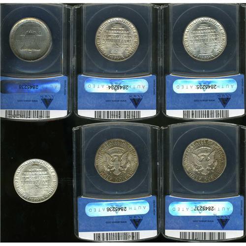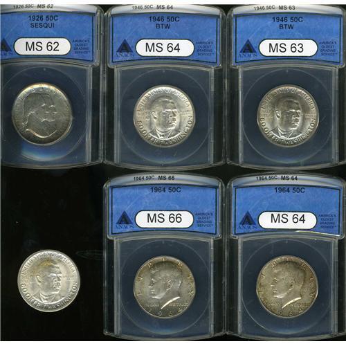 Includes four Commemorative Half Dollars (1926 Sesqui 50c ANACS MS62, 1946 BTW 50c ANACS MS64, 1946 BTW ANACS MS63, 1946-D BTW 50c XF-AU, raw) plus two 1964 Kennedy Half Dollars (ANACS MS66 and ANACS MS64). Lot of 6 coins.