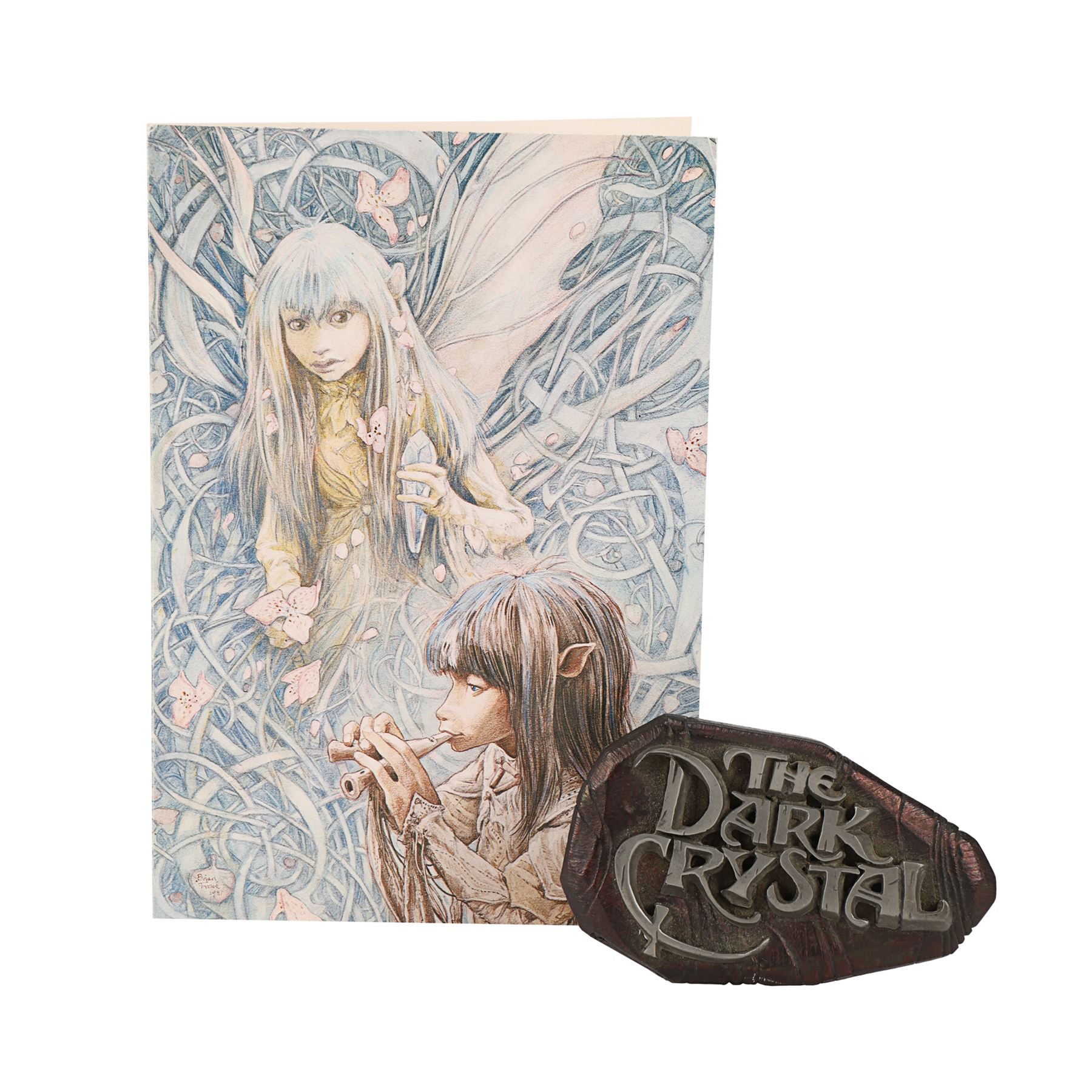 A Christmas card and crew belt buckle from the production of Jim Henson and Frank Oz's fantasy The Dark Crystal. The Christmas card features the printed message "Seasons Greetings and Best Wishes for the New Year" and has been signed by Henson, Oz and producer Gary Kurtz. The belt buckle is made of metal and features the film title in raised lettering. Dimensions (buckle): 6 cm x 9 cm x 1 cm (2 1/4" x 3 1/2" x 1/2")