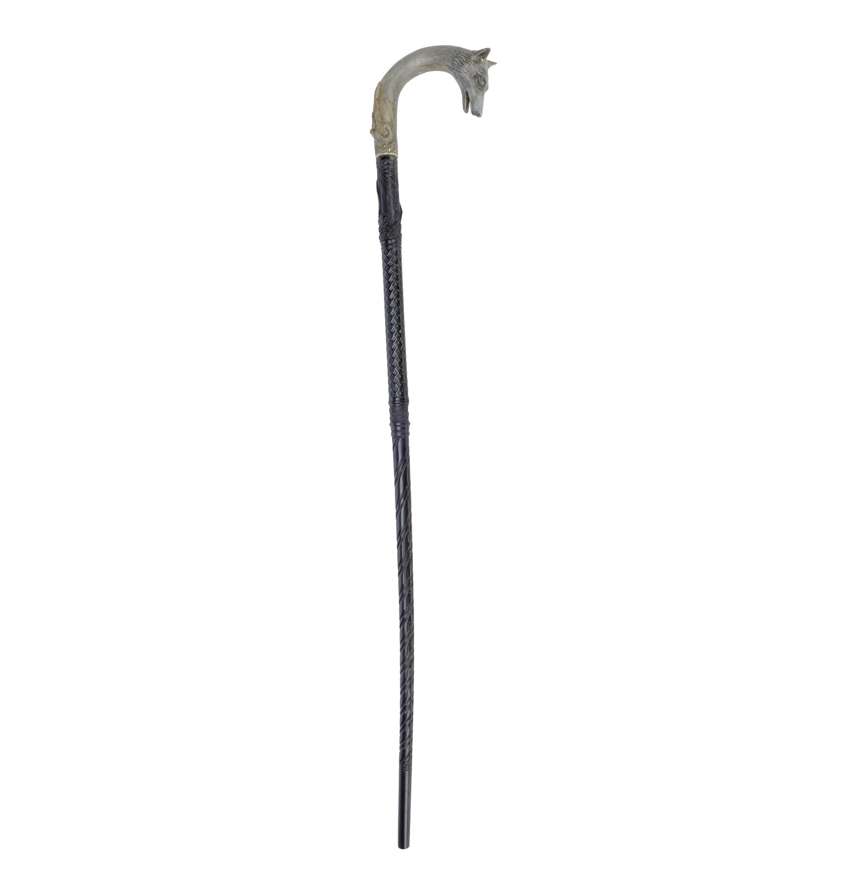 This lot consists of a carved black flexible rubber cane with an enforced base and a white acrylic wolf handle. This lot exhibits a glue residue and a loose handle. Dimensions: 94 cm x 15.25 cm x 5 cm (37" x 6" x 2")
