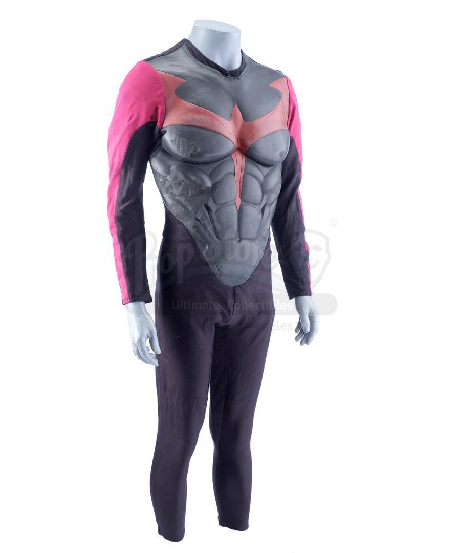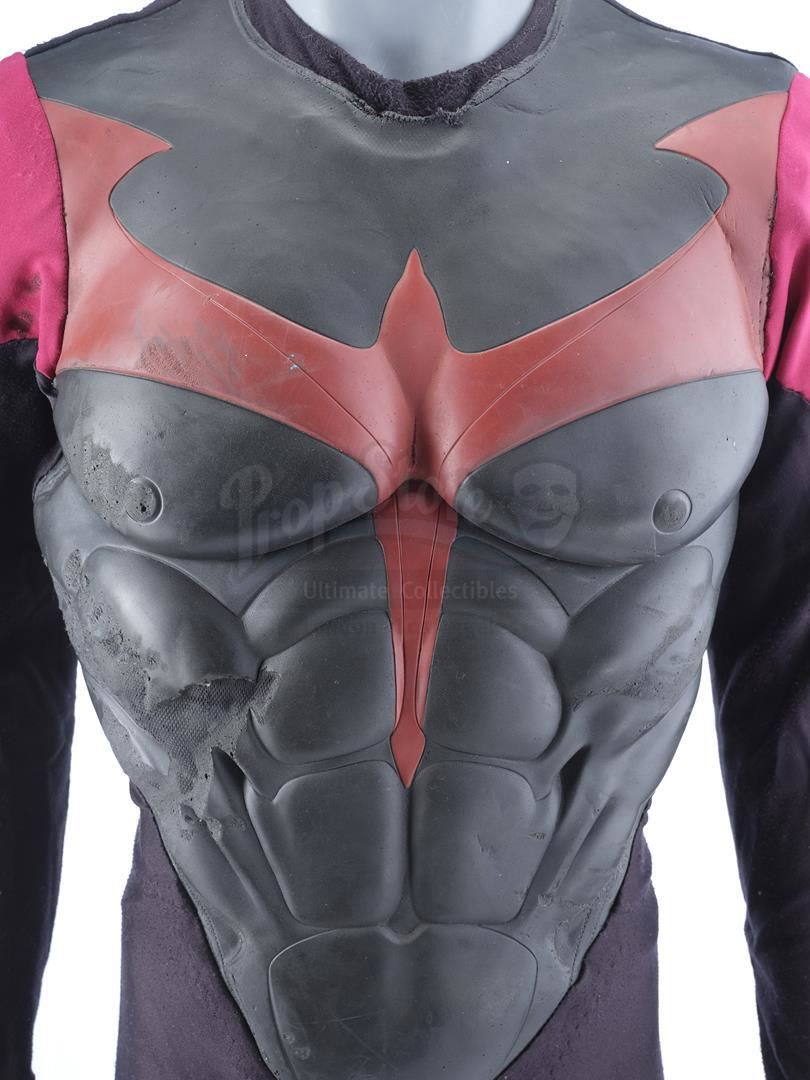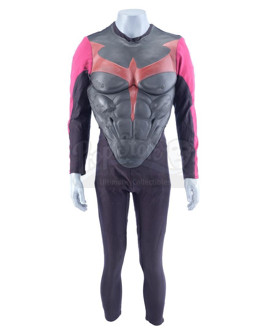 This lot will be auctioned on Thursday, July 1st. The auction will begin at 9:00am PDT and lots are sold sequentially via live auctioneer; tune in to the live streaming broadcast on auction day to follow the pace. Note other lots in the auction may close on June 29th or June 30th. Robin's breastplate and bodysuit from Universal Studios theme parks. Universal Studios employees wore authorized costumes from Warner Bros. films, including the Batman franchise. This lot consists of a muscular black rubber breastplate with a red stylized bird silhouette and a black and red elastane-blend zippered bodysuit with a sewn-in Six Flags tag labeled "ALT Robin." Both pieces were made from the original molds for Robin's (Chris O'Donnell) costume in Joel Schumacher's Batman & Robin. The lot is in fair overall condition with some wear from use and age, including deep scuffing and tearing to the breastplate and general wear to the bodysuit. Estimate: $600 - 800