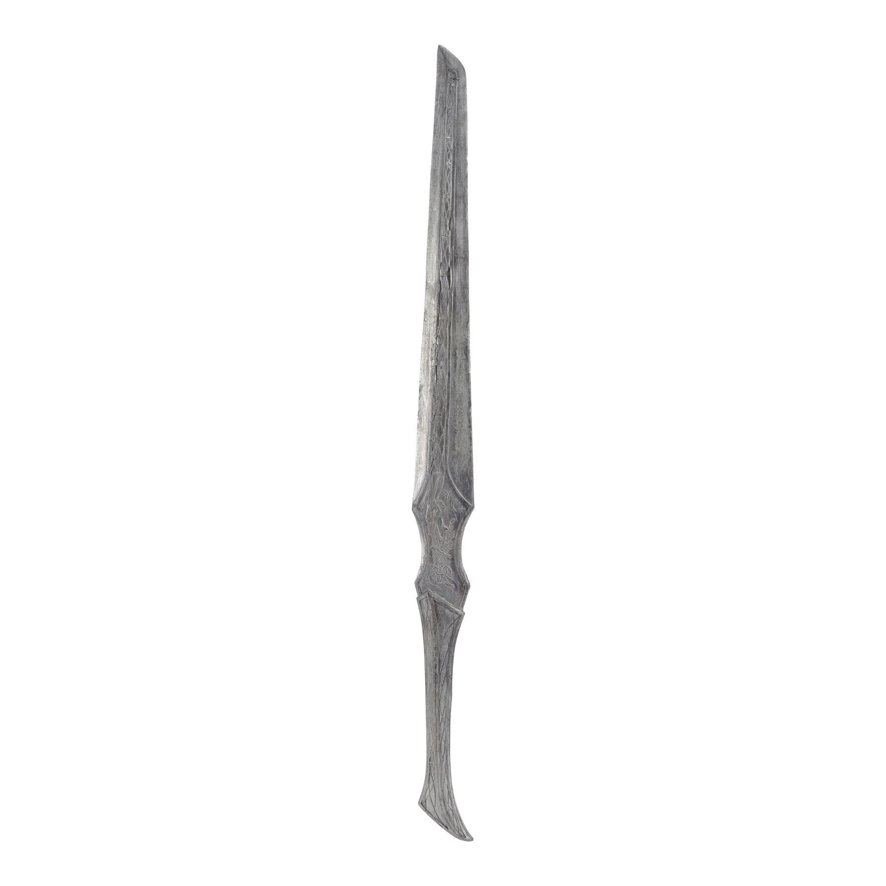 This dense rubber version of the broadsword was created for fight sequences where the blade was already extended. It is hand-painted silver-color and engraved down the center with runes of the Gods hunting alongside Apollo's chariot and down the handle with criss-cross patterns. The sword exhibits cracked rubber and paint flaking throughout from use and age. Dimensions: 33.25" x 2.75" x 1.25" (84 cm x 7 cm x 3 cm)