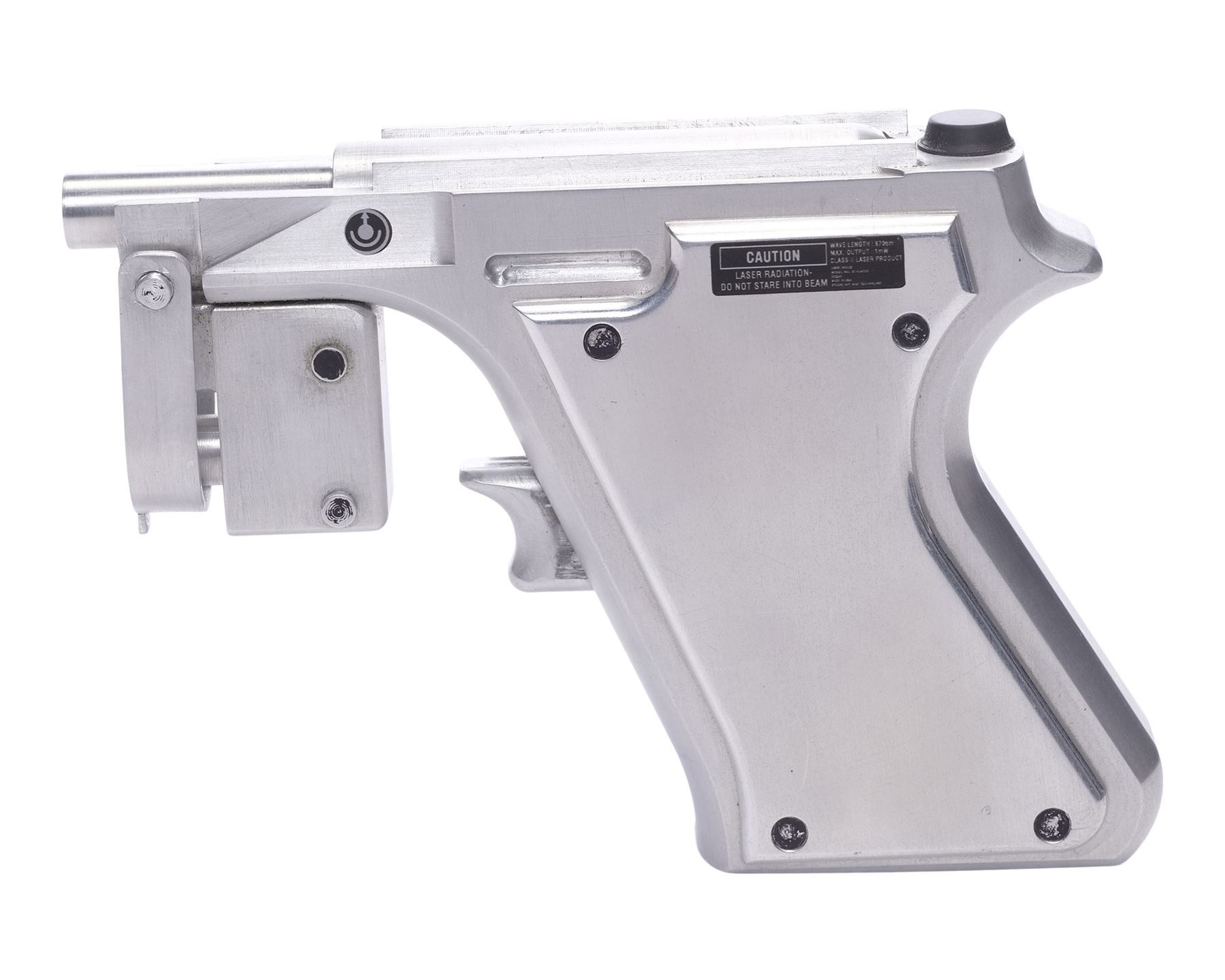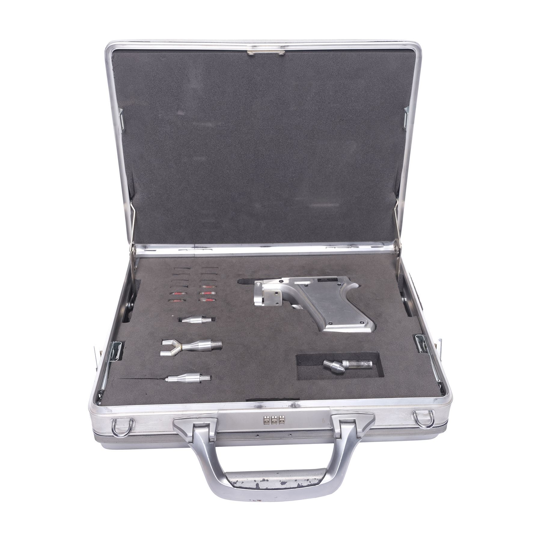 Housed in an aluminum briefcase with custom foam inserts, this lot consists of one stainless steel gun. The case also contains one hollow needle; a two-pronged attachment; two additional attachments; five resin charges; and a resin vial. This lot exhibits scuffing on the case and gun, and a yellowing of the resin components. Dimensions: 14" x 12" x 4" (35.5 cm x 30.5 cm x 10.25 cm)