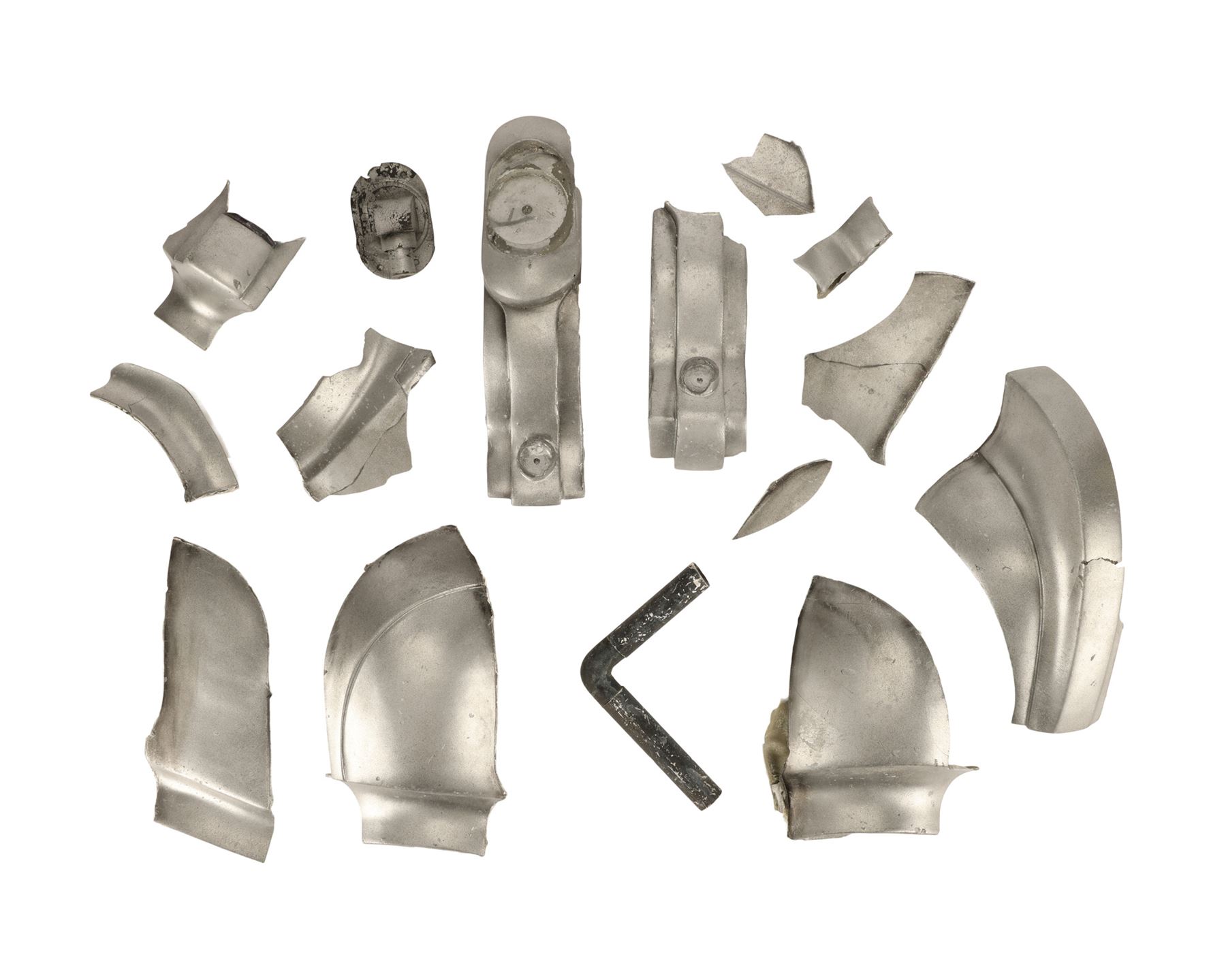Made of silver resin and rubber, the lot comprises several broken pieces of various shapes and sizes. Some of these are recognisable components of a Cyberman helmet, including a side handle, a section of a face plate, a chin and a lower mouth slit. In addition to being intentionally distressed, the lot shows signs of production wear, including scuffs and chips on the resin. Dimensions: 23 cm x 20 cm x 5 cm (9" x 8" x 2")