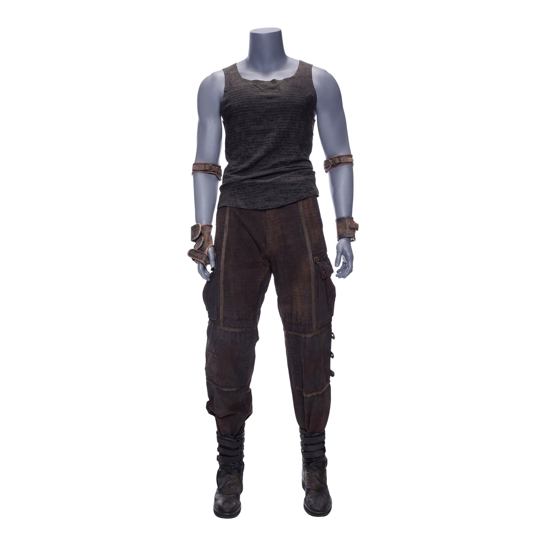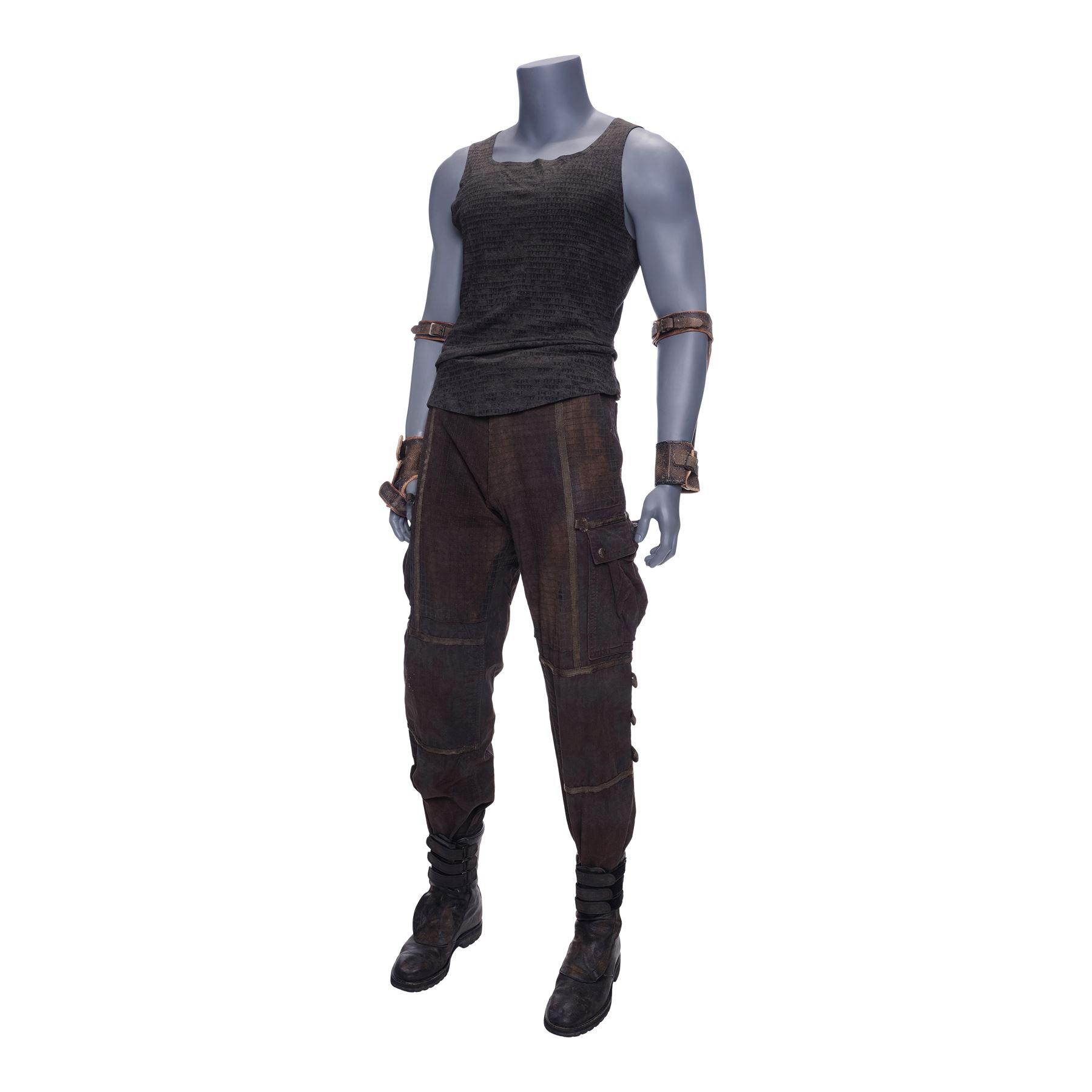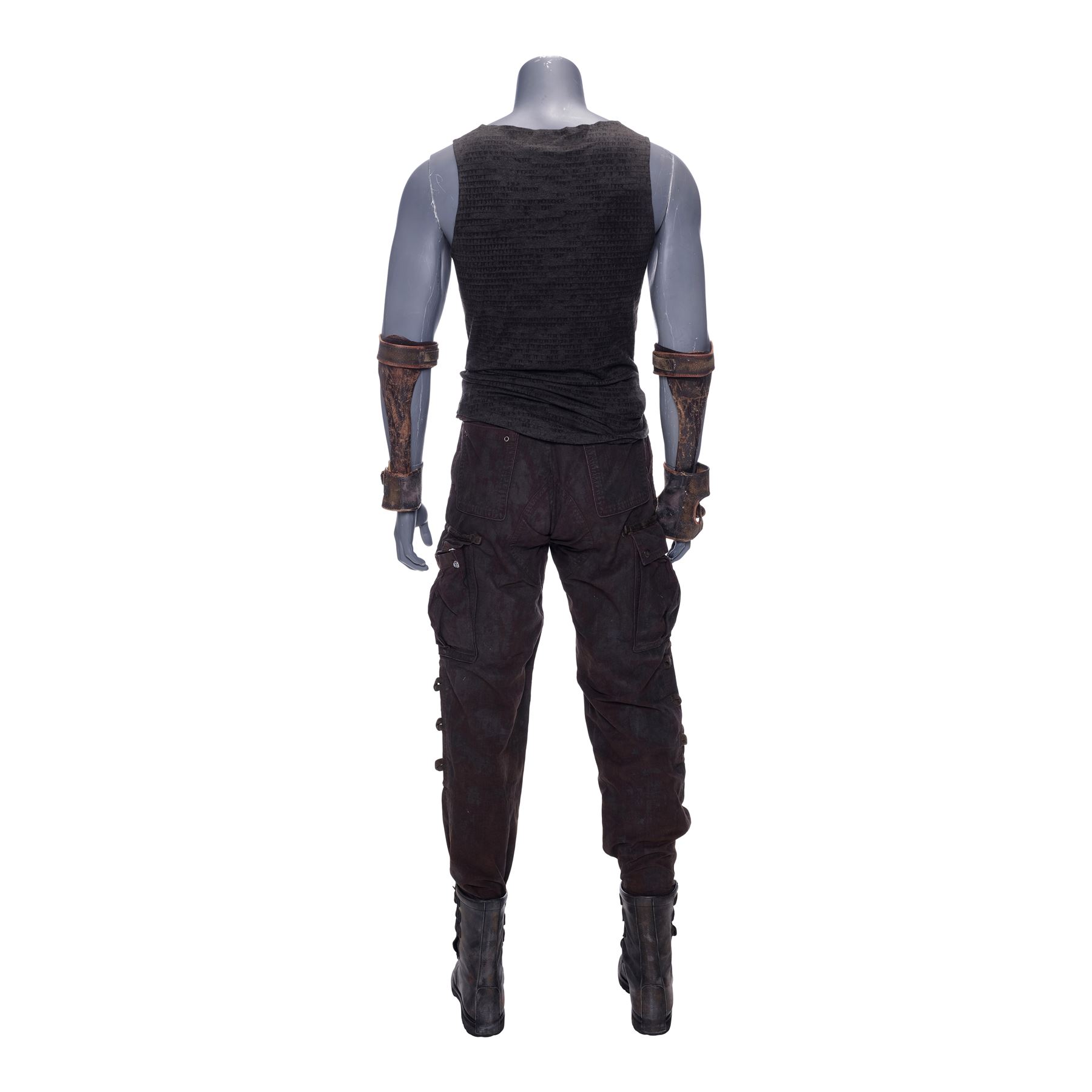 This costume is composed of a custom-made grey sleeveless shirt with a hand-marked "C" label; a pair of faux leather, foam-backed gauntlets with hand-marked interior labels for "R Riddick" and "L Riddick"; a webbed canvas belt; brown combat trousers with an interior tag handmarked "34" as well as stirrups; and a pair of black boots. Production intentionally distressed this costume. This lot exhibits notable white marks on the knee as well as snagged threads.