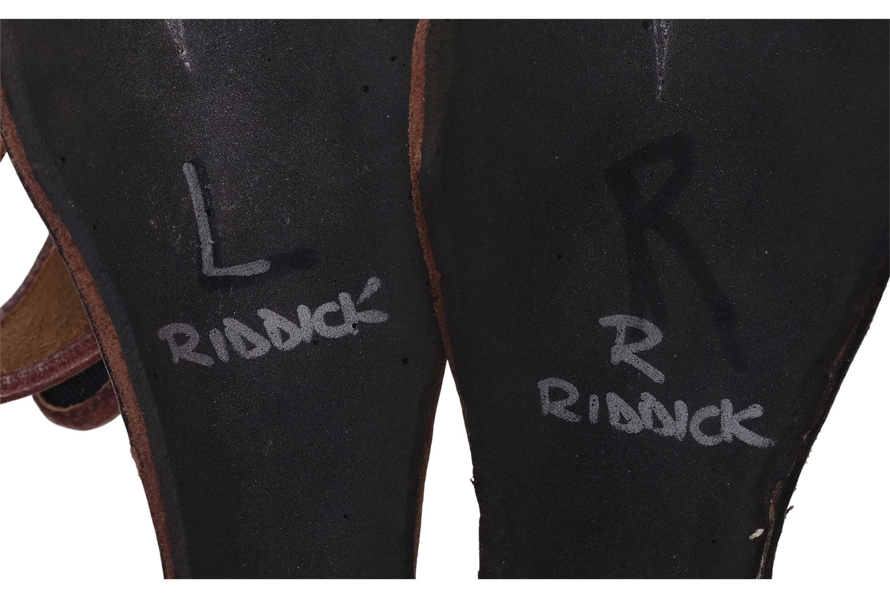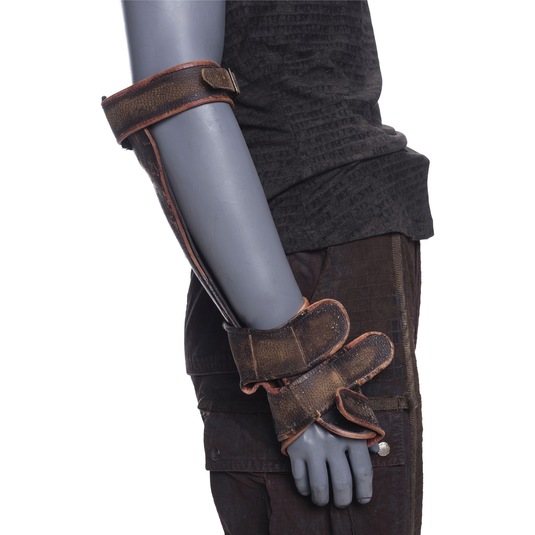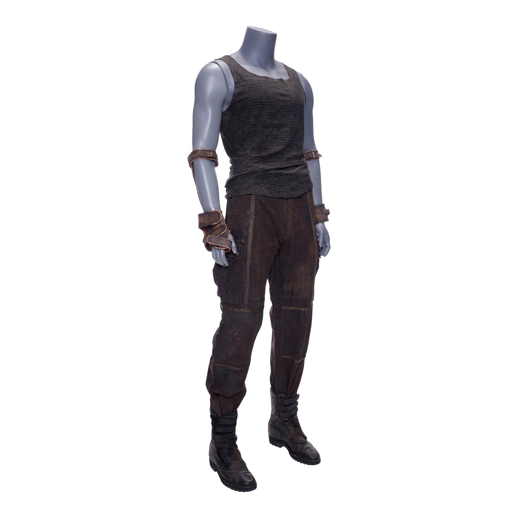 This costume is composed of a custom-made grey sleeveless shirt with a hand-marked "C" label; a pair of faux leather, foam-backed gauntlets with hand-marked interior labels for "R Riddick" and "L Riddick"; a webbed canvas belt; brown combat trousers with an interior tag handmarked "34" as well as stirrups; and a pair of black boots. Production intentionally distressed this costume. This lot exhibits notable white marks on the knee as well as snagged threads.