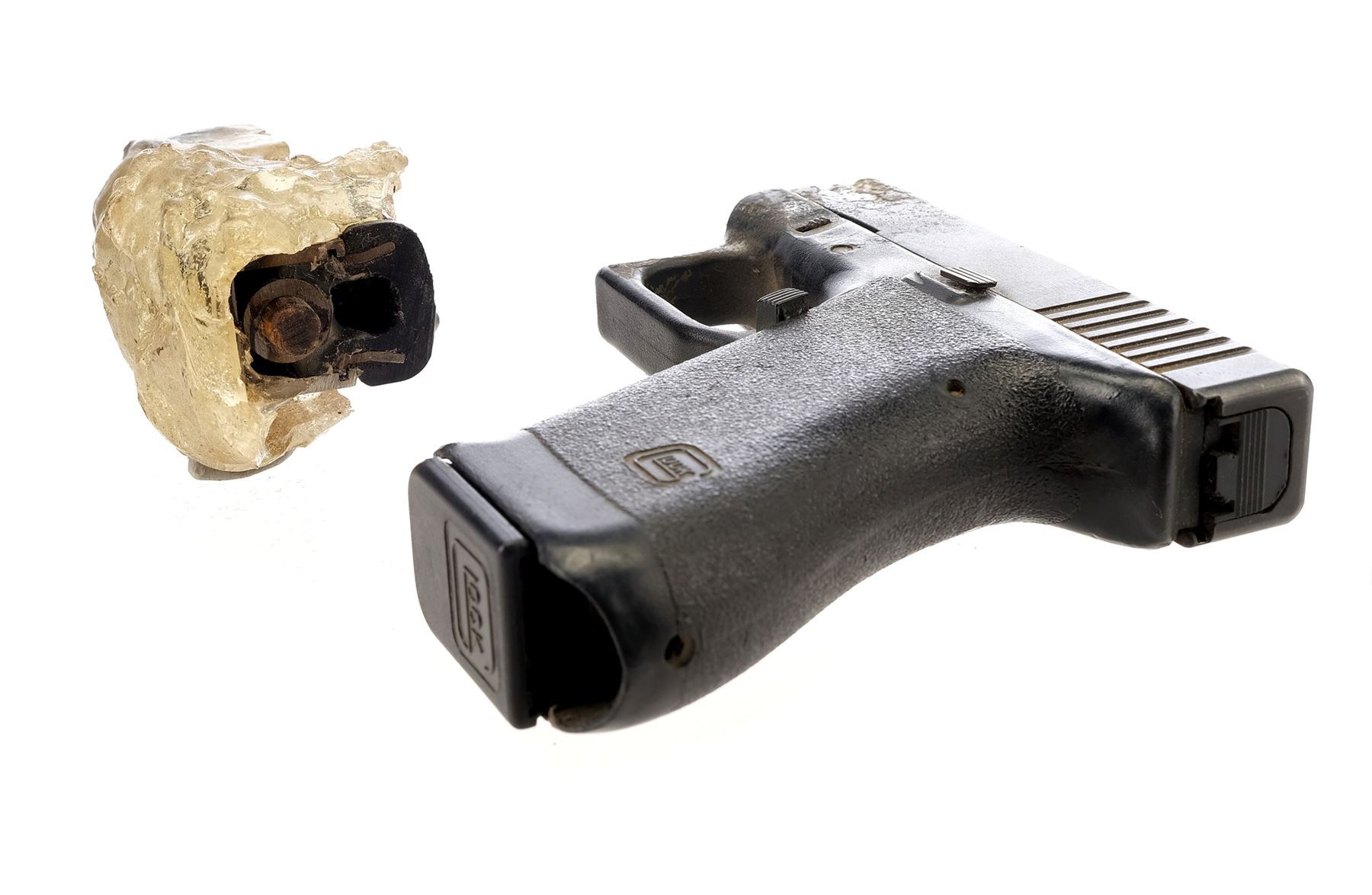 This lot consists of a two-piece metal and plastic Sonya Blade Glock 17L applied with clear resin resembling ice; a rubber Reptile mask attached to a black nylon balaclava; a foam Scorpion spear tip painted to resemble a creature's head with an internal metal rod; and a tabloid newspaper cover headlined "Johnny Cage a Fake!" with an image of Cage in front of a bluescreen. This lot exhibits chipping, folded corners, minor rips and tears, and blemishes on the gun barrel. Dimensions: 12" x 10" x 12" (30.5 cm x 25.5 cm x 30.5 cm)