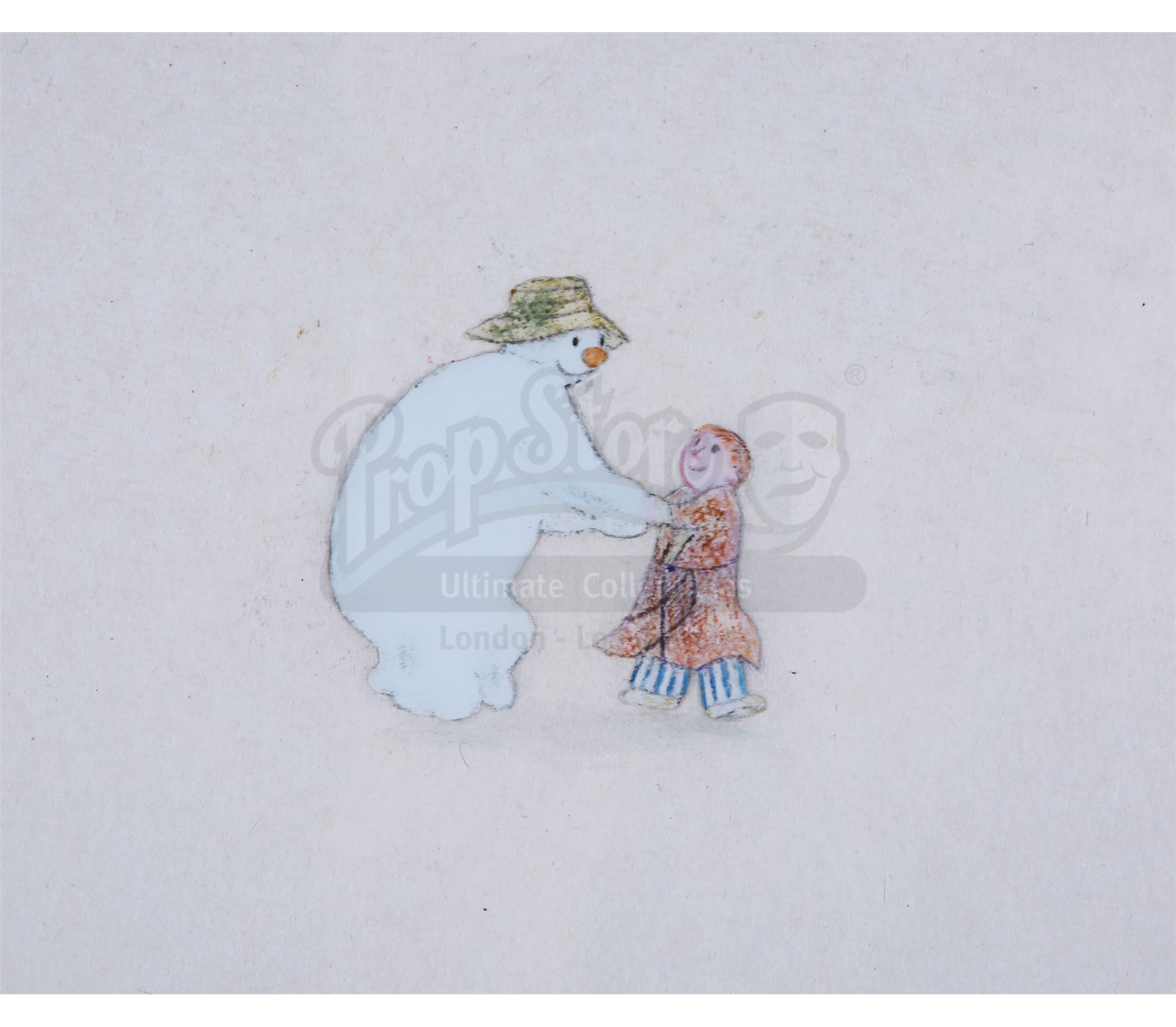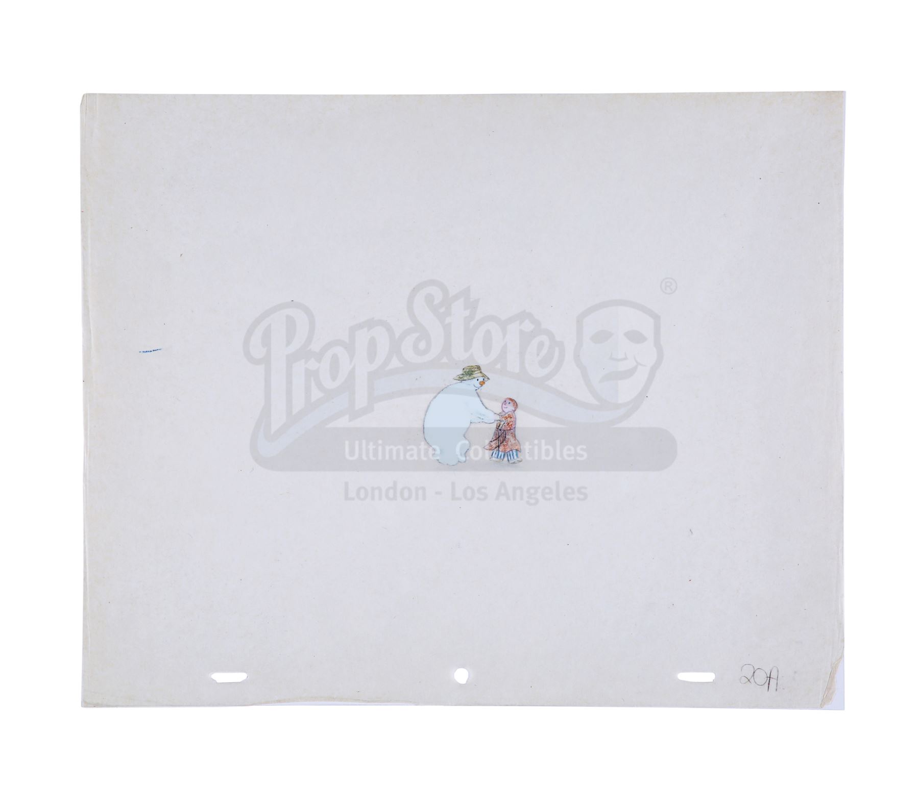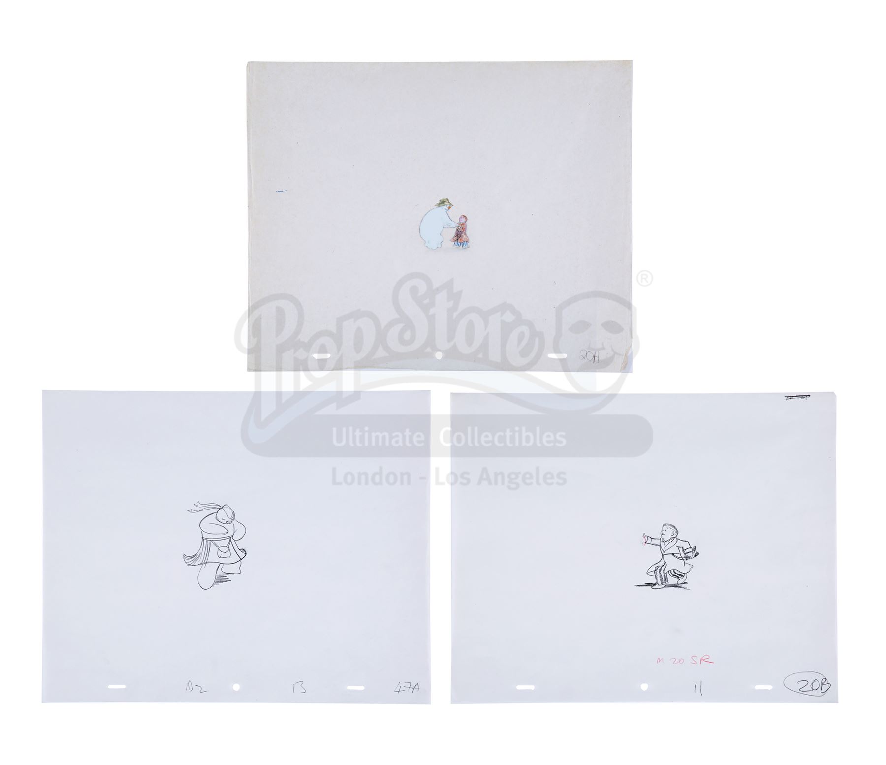 This lot will be auctioned on Thursday, July 1st. The auction will begin at 9:00am PDT and lots are sold sequentially via live auctioneer; tune in to the live streaming broadcast on auction day to follow the pace. Note other lots in the auction may close on June 29th or June 30th. A dance sequence animation hand-painted cel and two pencil sketches from Dianne Jackson and Jimmy T. Murakami's Academy Award-nominated animation The Snowman. The painted cel features James and the Snowman and is marked "20A." One sketch shows James (labeled "20B, M 20 SR"), and the final drawing shows the kilted Snowman (labeled "102, 13, 47A"). Protective tissue paper has been placed behind the acetate cel. The set remains in good overall condition, with light creasing and minor fading to the painted colors. Dimensions (each sheet): 10.75" x 13" (27 cm x 33 cm) Sold without copyright; see notice in the Buyer's Guide. Estimate: $1,000 - 1,500