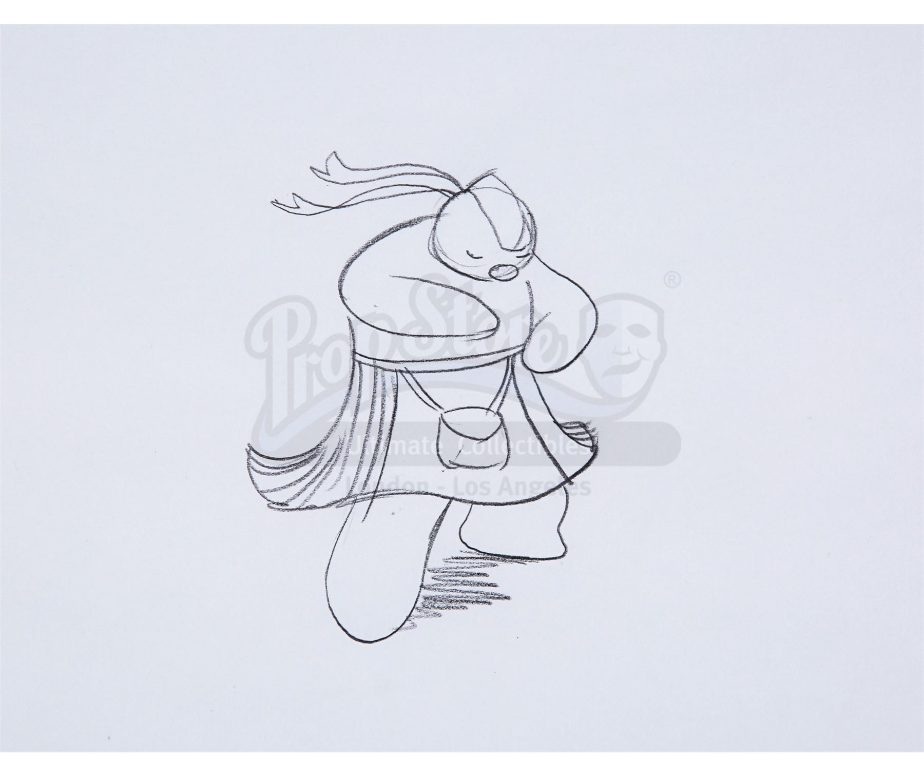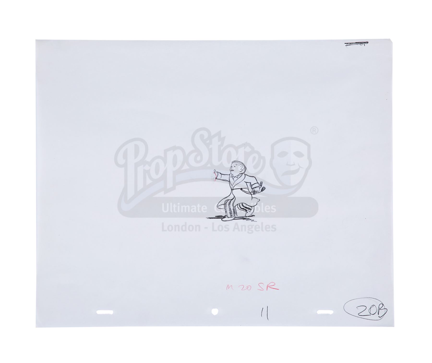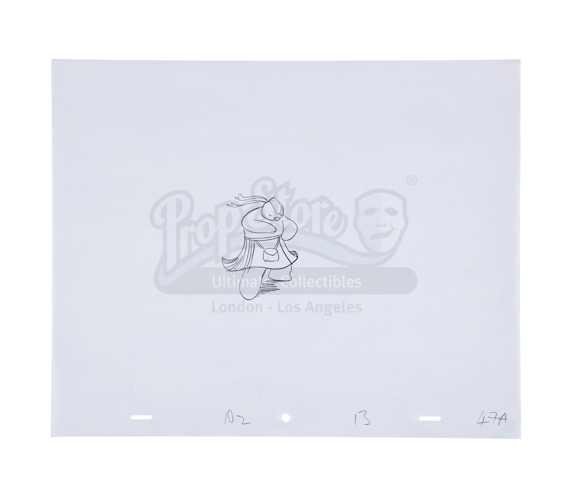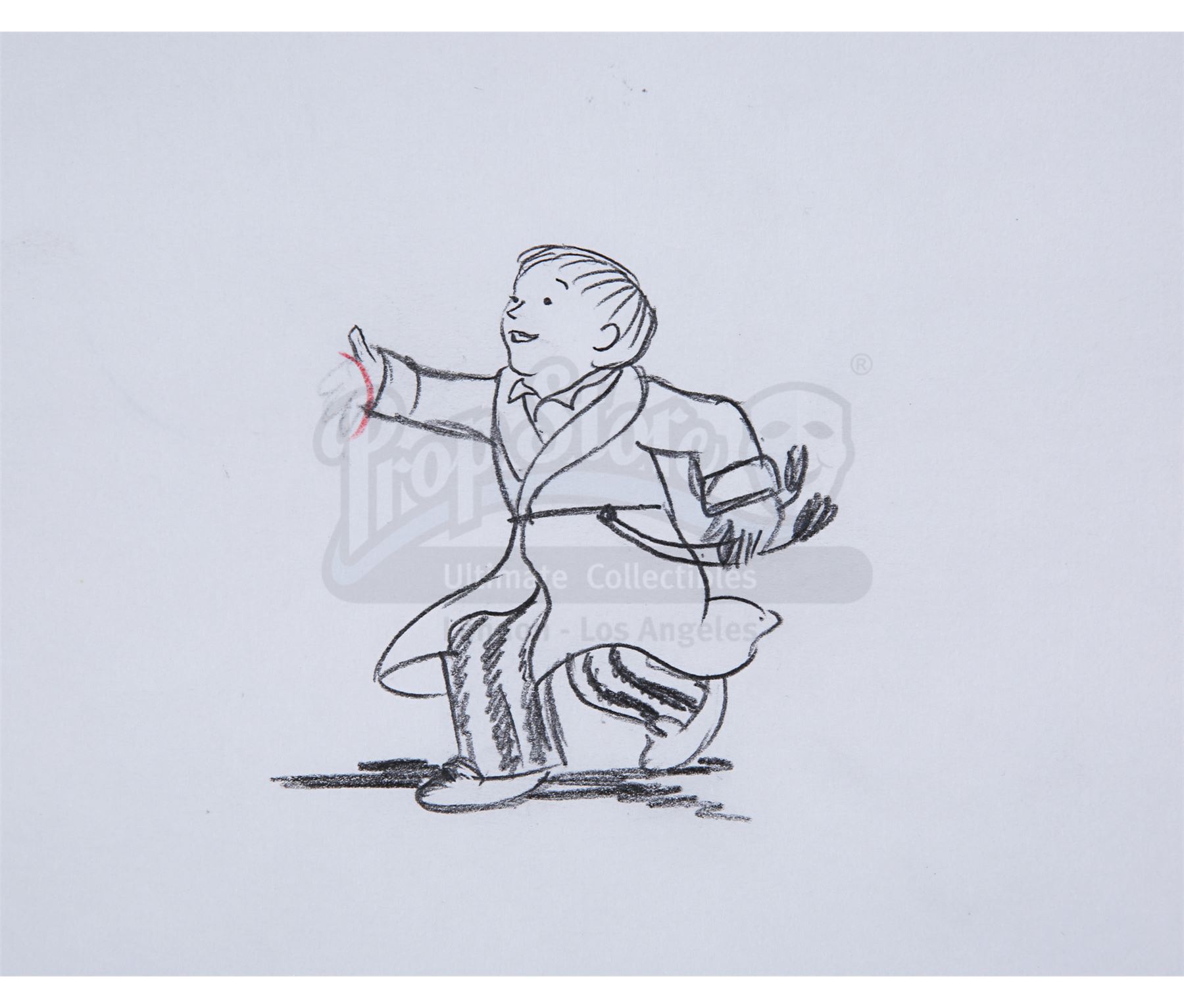 This lot will be auctioned on Thursday, July 1st. The auction will begin at 9:00am PDT and lots are sold sequentially via live auctioneer; tune in to the live streaming broadcast on auction day to follow the pace. Note other lots in the auction may close on June 29th or June 30th. A dance sequence animation hand-painted cel and two pencil sketches from Dianne Jackson and Jimmy T. Murakami's Academy Award-nominated animation The Snowman. The painted cel features James and the Snowman and is marked "20A." One sketch shows James (labeled "20B, M 20 SR"), and the final drawing shows the kilted Snowman (labeled "102, 13, 47A"). Protective tissue paper has been placed behind the acetate cel. The set remains in good overall condition, with light creasing and minor fading to the painted colors. Dimensions (each sheet): 10.75" x 13" (27 cm x 33 cm) Sold without copyright; see notice in the Buyer's Guide. Estimate: $1,000 - 1,500