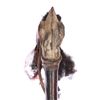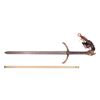 The sword comprises a long steel blade with the engraving "LA" on either side; a leather grip; and a foam-covered hilt guard and pommel, which have been painted to imitate bone. It is embellished with a plume of synthetic brown hair, with coils of wire and strips of fabric attached to the top of the pommel and strips of light brown leather wrapped around the guard. The blade exhibits rusting from age, and there are a few tears in the foam hilt guard and pommel, revealing the metal beneath. Dimensions: 122.5 cm x 29 cm x 7 cm (48 1/4" x 11 1/2" x 2 3/4")