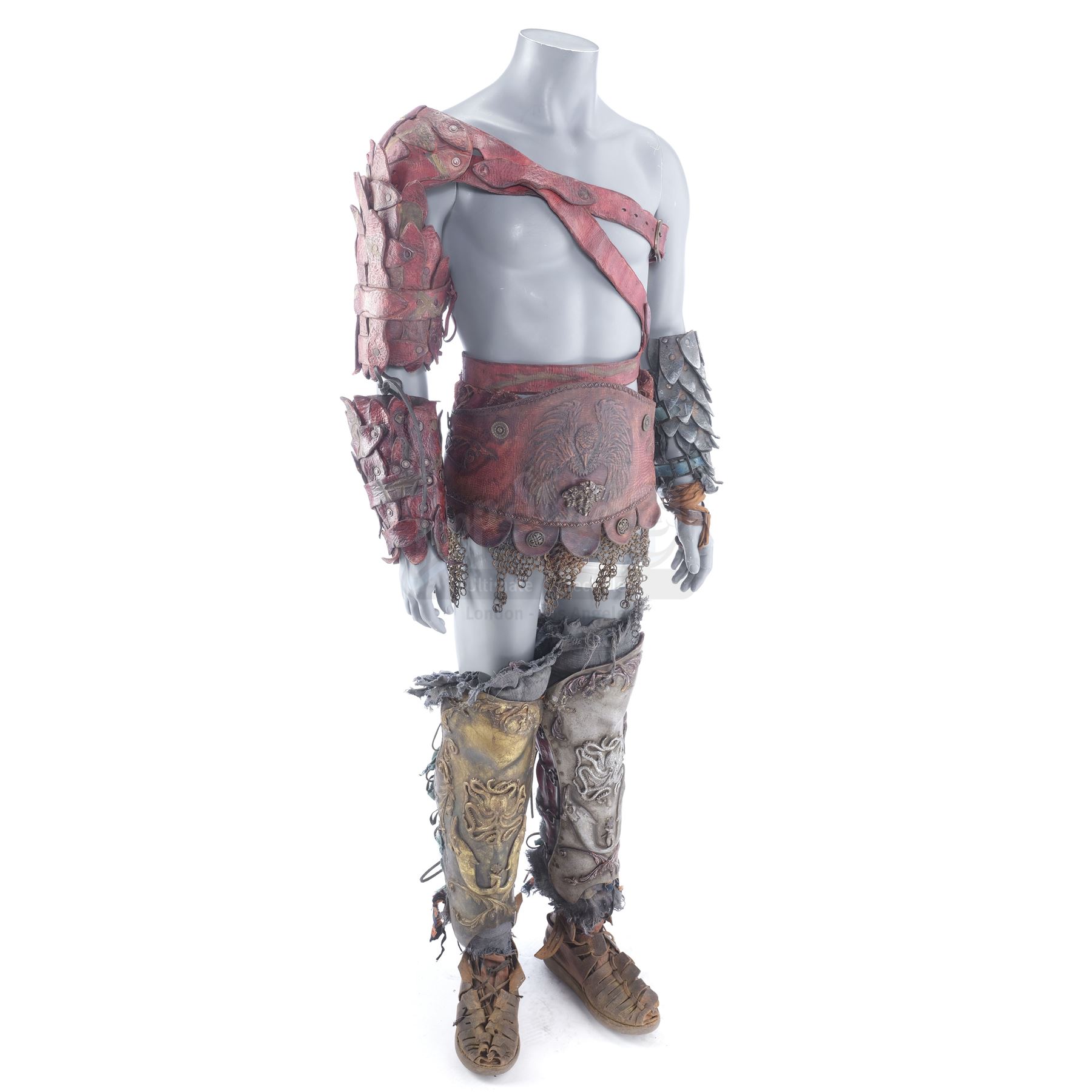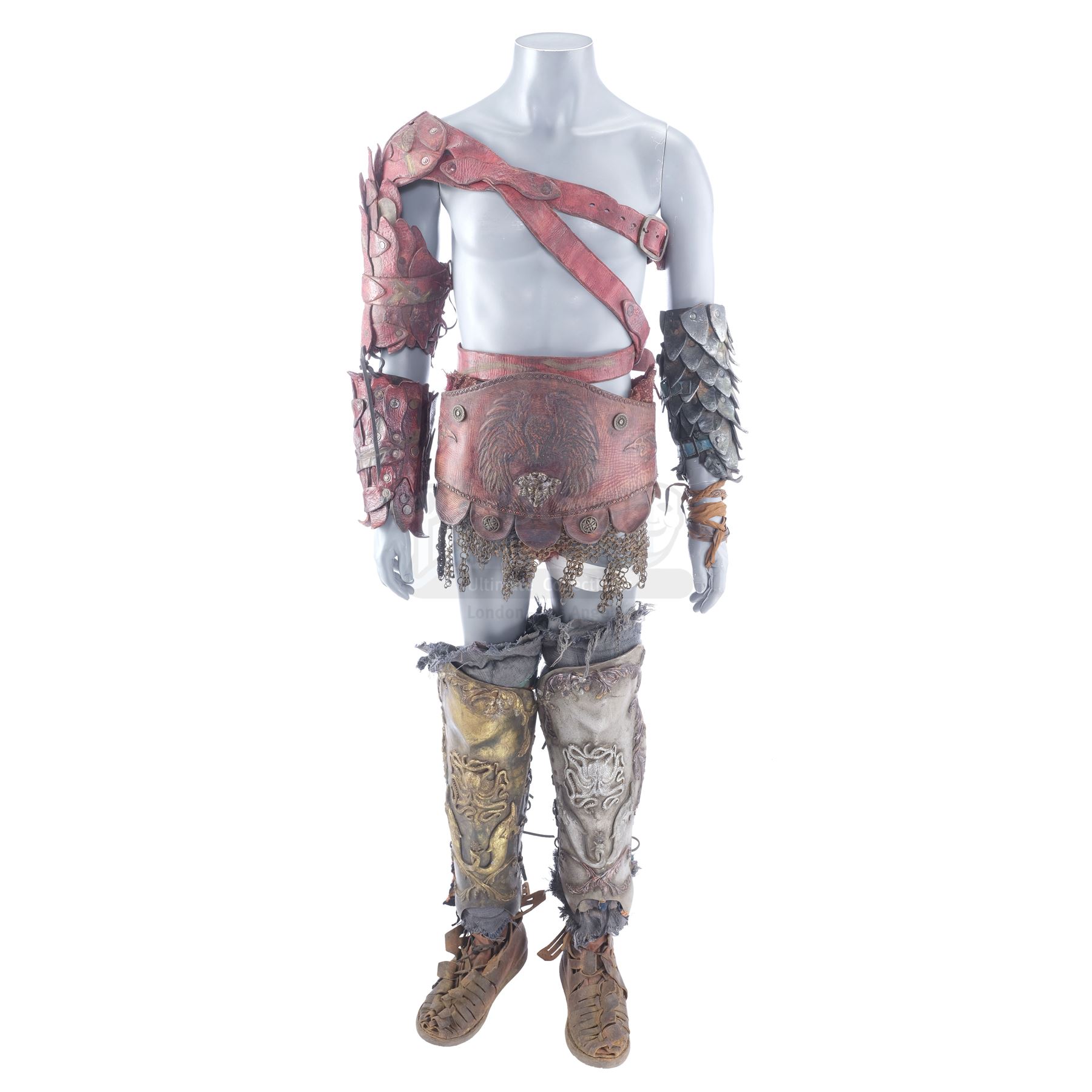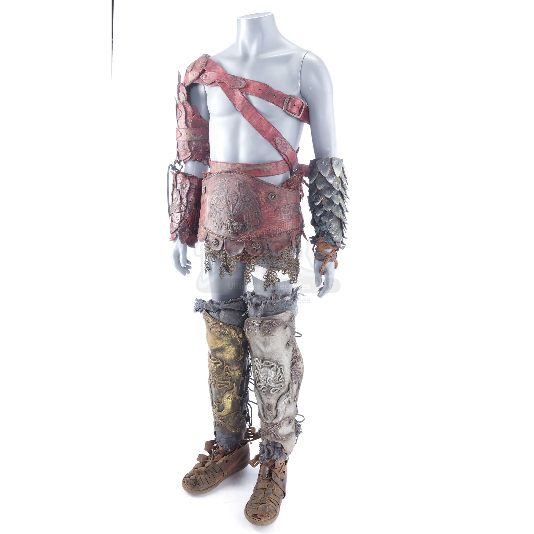 This lot will be auctioned on Thursday, July 1st. The auction will begin at 9:00am PDT and lots are sold sequentially via live auctioneer; tune in to the live streaming broadcast on auction day to follow the pace. Note other lots in the auction may close on June 29th or June 30th. Crixus' (Manu Bennett) battle armor from Steven S. DeKnight's historical action series Spartacus. Champion fighter Crixus wore his costume while he battled alongside fellow warrior Spartacus (Andy Whitfield/Liam Mcintyre) in the gladiatorial arena. This costume consists of a crimson leather manica with metal details, a silver-colored leather and metal gauntlet, a brown lace-up stunt leather belt with metal details, a brown cotton loincloth, a pair of gold-color and silver-color metal greaves with decorative accents throughout, a pair of blue cotton pads with decorative tassels, and a pair of brown leather sandals. Also included are three certificates of authenticity. The lot exhibits signs of use and wear, but remains in excellent overall condition Estimate: $2,000 - 3,000