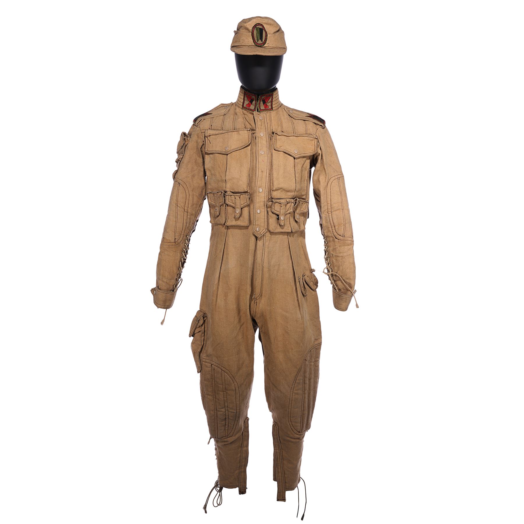 Accompanying the uniform is a cap made from the same canvas material, with a House Atreides banner patch fastened to the front and red blots of stage blood on the back. The costume exhibits broken zips at the front opening and the right ankle, along with loose threads, minor torn seams and broken elastic ankle straps.