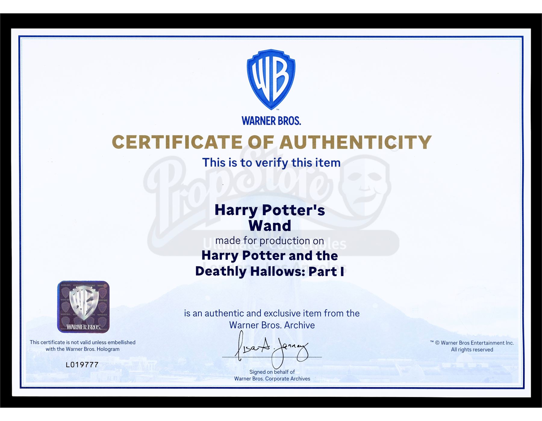 This lot will be auctioned on Tuesday, June 29th. The auction will begin at 9:00am PDT and lots are sold sequentially via live auctioneer; tune in to the live streaming broadcast on auction day to follow the pace. Note other lots in the auction may close on June 30th or July 1st. Harry Potter's wand made for Daniel Radcliffe during production on Harry Potter and the Deathly Hallows - Part 1, directed by David Yates. Harry's wand is his quintessential accessory throughout the film series, and this auction lot is the first example of the memorable prop ever offered from the Warner Bros. Archive. The wand is made of resin, and is finished to resemble natural wood. The handle is rough and has a bark-like texture, while the rest of the wand is straight and brown with a faux-wood grain pattern on it. The wand is in excellent overall condition with minimal wear. The piece is attributed to Harry Potter and the Deathly Hallows- Part 1 as it was used on that production and part of the wrap of that production. It may also have been part of the production of earlier films going back to the third film in the series, Harry Potter and the Prisoner of Azkaban, where this style of wand was first seen. Prop wands were frequently re-used from film to film during the making of the Potter series. The lot also includes a cream-color drawstring storage bag from the Warner Bros. Archive and a Warner Bros. Certificate of Authenticity confirming the piece is an authentic and exclusive item from the Warner Bros. Archives attributed to Harry Potter and the Deathly Hallows- Part 1. Dimensions: 14" x 1" x 1" (35.75 cm x 2.75 cm x 2.75 cm) 100% of the Hammer Price proceeds from this sale will go to Lumos Foundation USA. Estimate: $30,000 - 50,000