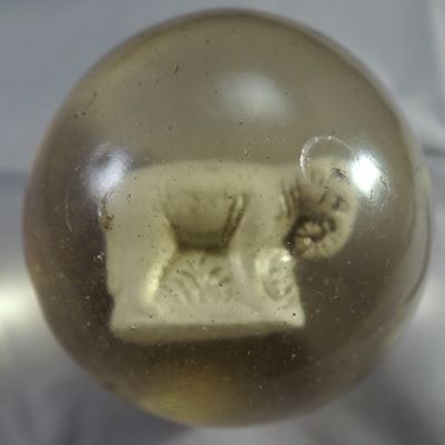Very nice Elephant Sulphide. Excellent detail to the figure. Well centered, perhaps a little low. No air bubbles on the figure. Really nice. Large marble. Some small subsurface moons. Germany, circa 1860-1920. 2-3/8". Near Mint(-) (8.1).