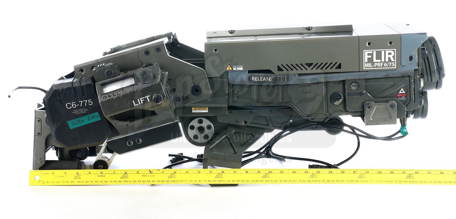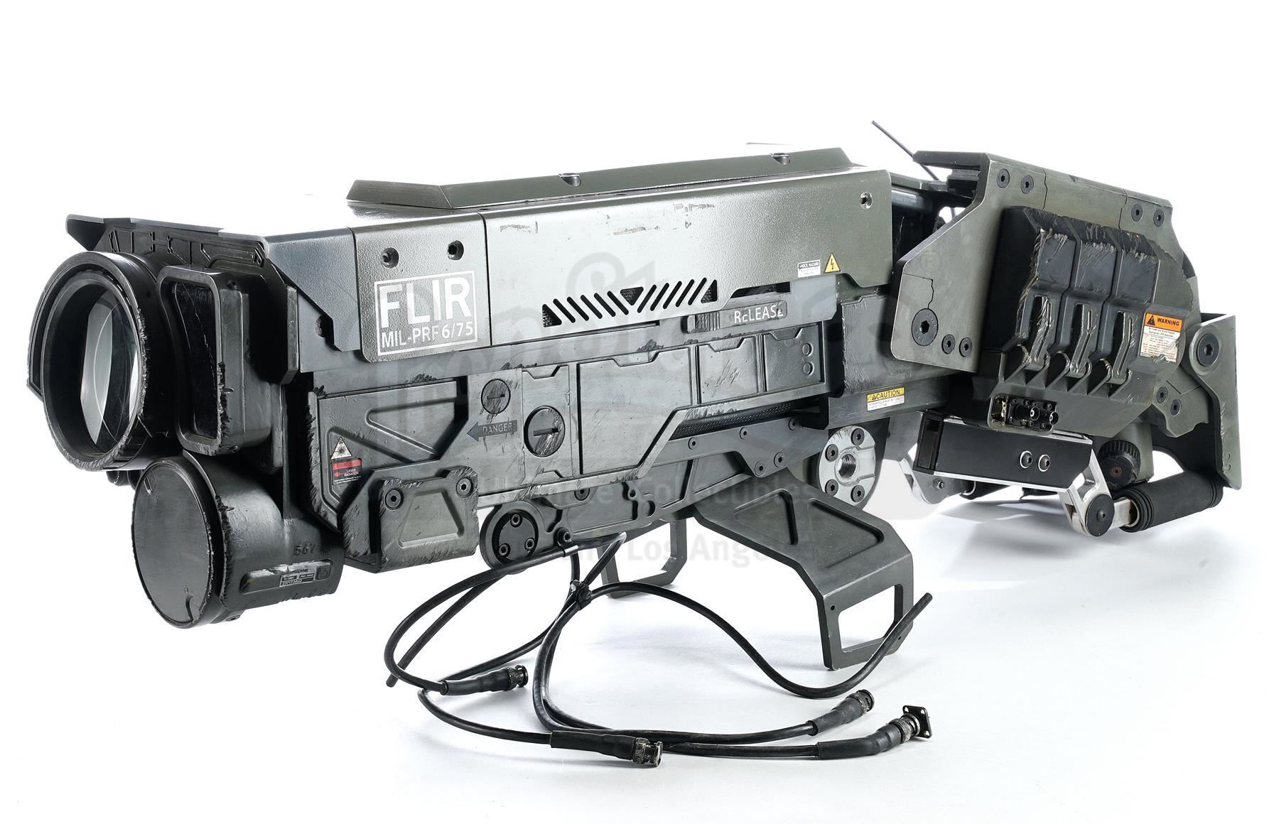 This lot will be auctioned on Thursday, July 1st. The auction will begin at 9:00am PDT and lots are sold sequentially via live auctioneer; tune in to the live streaming broadcast on auction day to follow the pace. Note other lots in the auction may close on June 29th or June 30th. Mark Clyne's (James Badge Dale) hyperspectral camera shell from Nic Mathieu's sci-fi action adventure Spectral. DARPA specialist Clyne brought a hyperspectral camera to Moldova to record hyperspectral anomalies on the battlefield. Custom-built by effects house Weta Workshop, this black, gray, and olive-color camera shell is constructed of dense urethane with metal and resin detailing. It features a pair of black grips on the back and detailing at the end of the barrel, including a circular lens attachment, a flip-up display with static knobs, buttons, a blank acrylic monitor marked "FAKE SCREEN," and cables throughout with resin plugs attached to either side. It exhibits signs of wear from production throughout, including paint chipping and scraping, but remains in good overall condition. Dimensions: 37" x 16" x 9" (94 cm x 40.5 cm x 23 cm) Ownership may be restricted in some countries; see replica firearm notice in Buyer's Guide. Estimate: $2,000 - 3,000