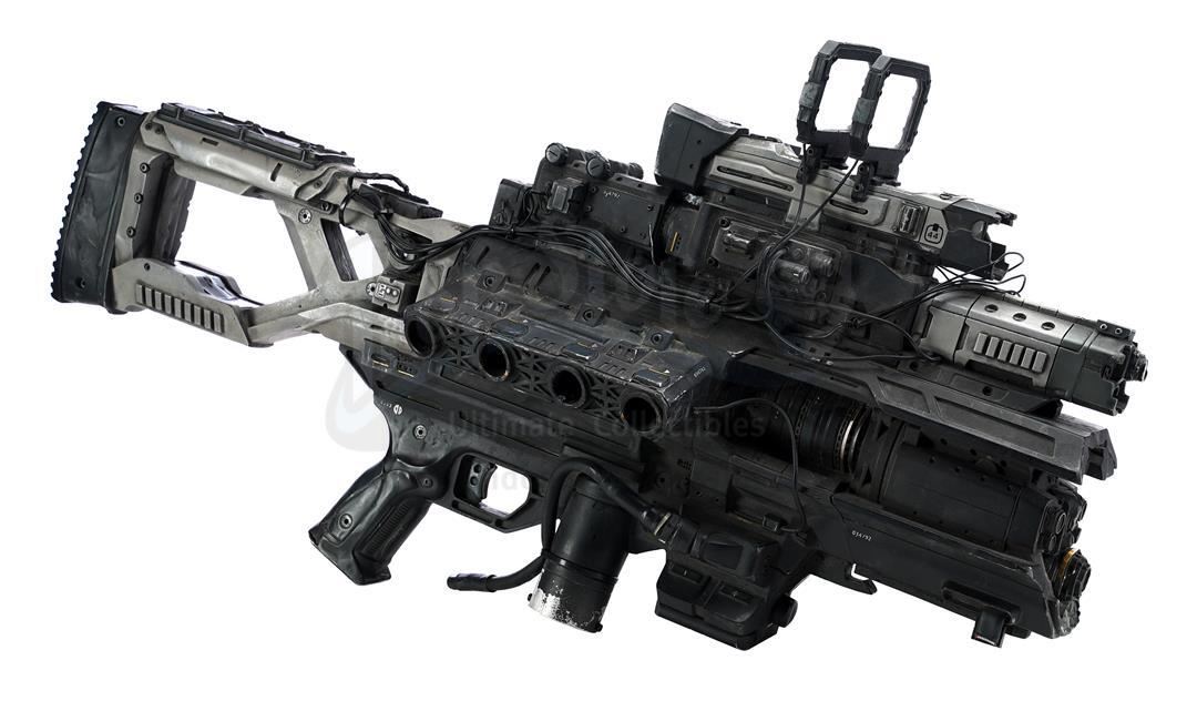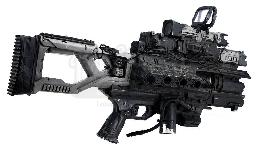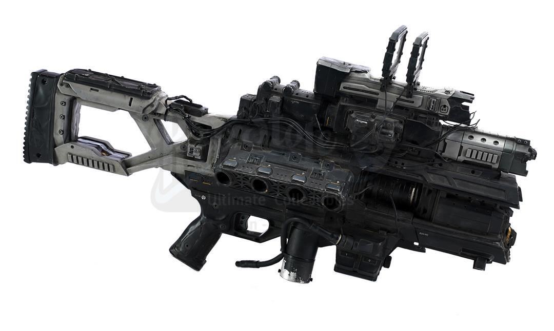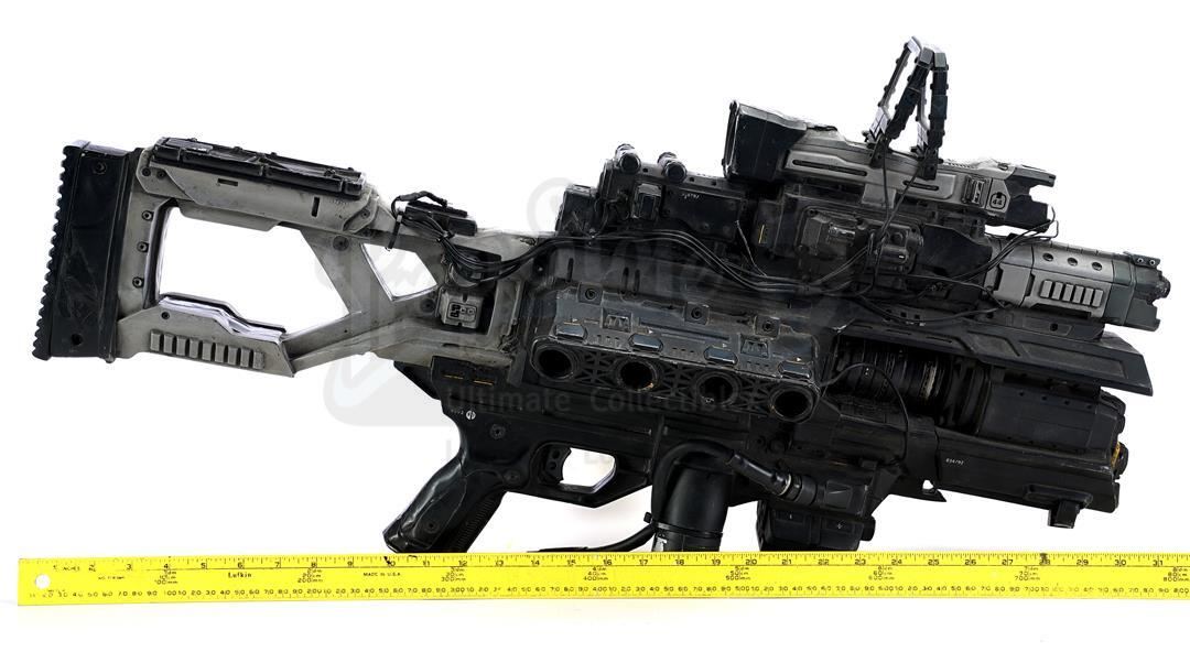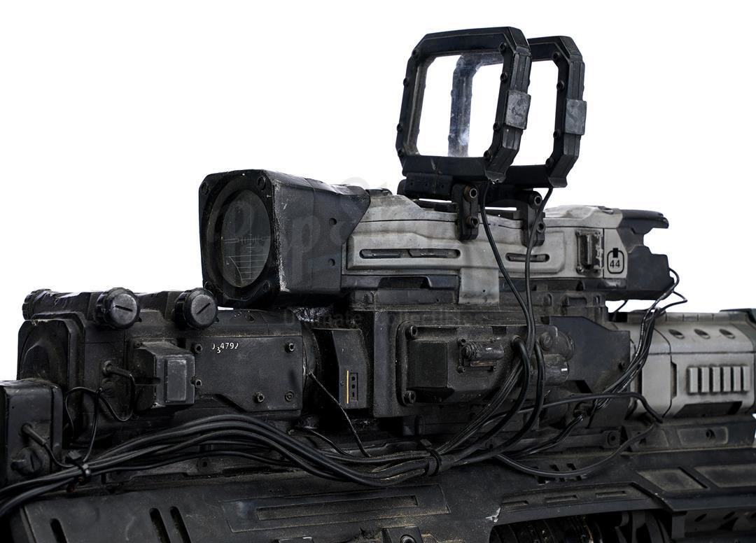 This lot will be auctioned on Thursday, July 1st. The auction will begin at 9:00am PDT and lots are sold sequentially via live auctioneer; tune in to the live streaming broadcast on auction day to follow the pace. Note other lots in the auction may close on June 29th or June 30th. A plasma rifle from Nic Mathieu's sci-fi action adventure Spectral. The Delta team used plasma rifles in their final battle with the hyperspectral anomalies. Custom-built by effects house Weta Workshop, the black and dark gray plasma rifle is made of urethane and resin painted dark weathered gray with black wires running throughout. It features a metal mount at the base, a series of decorative exhaust ports on the side, and a pair of flip-up monitor-like sights on the top. It exhibits signs of wear from production throughout, including paint chipping and scraping, but remains in good overall condition. Dimensions: 31" x 16.25" x 7.25" (78.75 cm x 41.5 cm x 19.25 cm) Ownership may be restricted in some countries; see replica firearm notice in Buyer's Guide. Estimate: $2,000 - 3,000