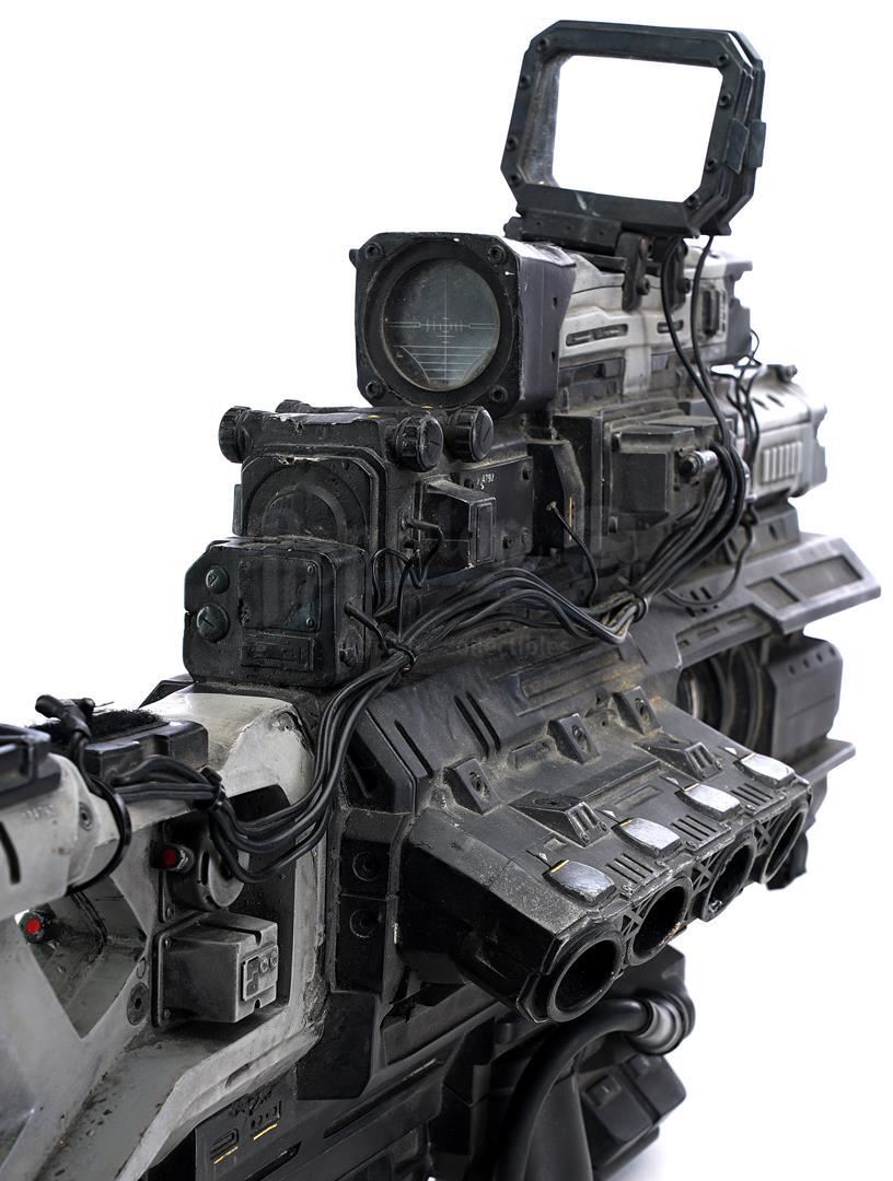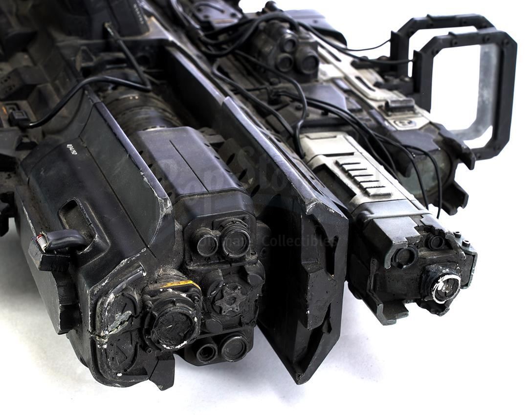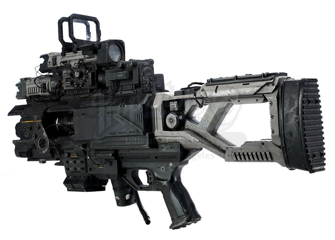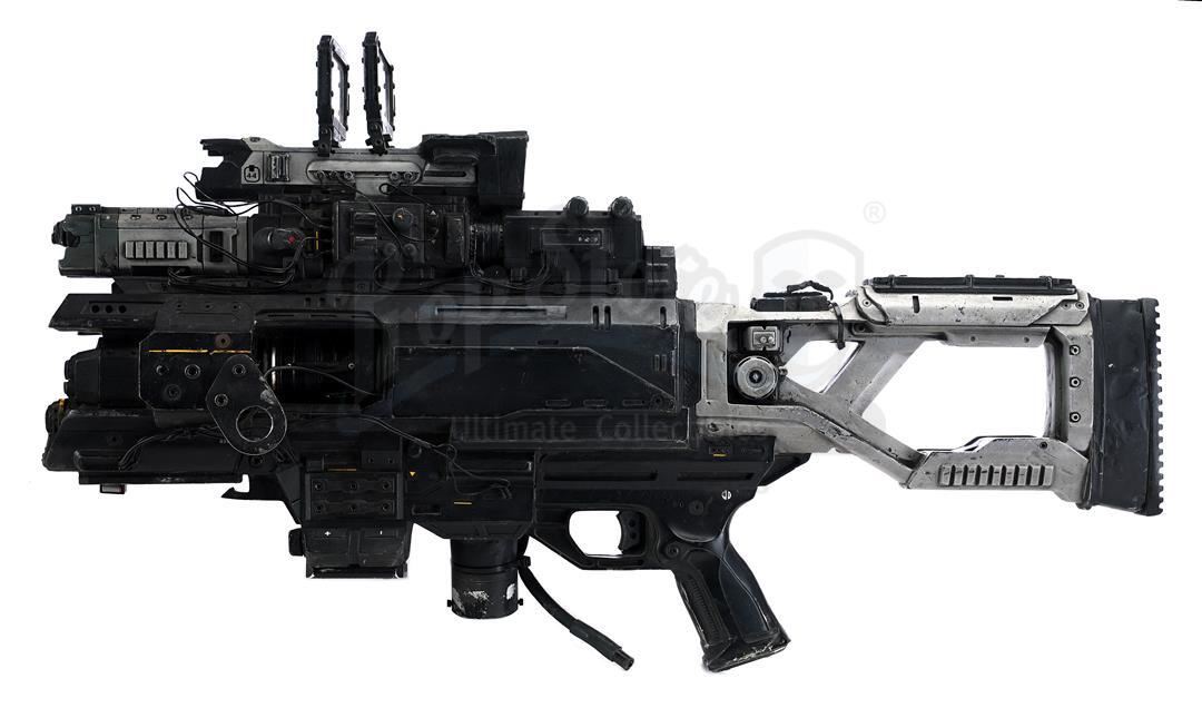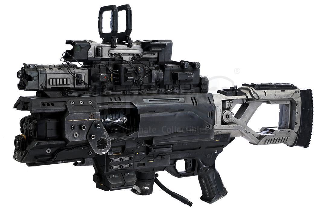 This lot will be auctioned on Thursday, July 1st. The auction will begin at 9:00am PDT and lots are sold sequentially via live auctioneer; tune in to the live streaming broadcast on auction day to follow the pace. Note other lots in the auction may close on June 29th or June 30th. A plasma rifle from Nic Mathieu's sci-fi action adventure Spectral. The Delta team used plasma rifles in their final battle with the hyperspectral anomalies. Custom-built by effects house Weta Workshop, the black and dark gray plasma rifle is made of urethane and resin painted dark weathered gray with black wires running throughout. It features a metal mount at the base, a series of decorative exhaust ports on the side, and a pair of flip-up monitor-like sights on the top. It exhibits signs of wear from production throughout, including paint chipping and scraping, but remains in good overall condition. Dimensions: 31" x 16.25" x 7.25" (78.75 cm x 41.5 cm x 19.25 cm) Ownership may be restricted in some countries; see replica firearm notice in Buyer's Guide. Estimate: $2,000 - 3,000