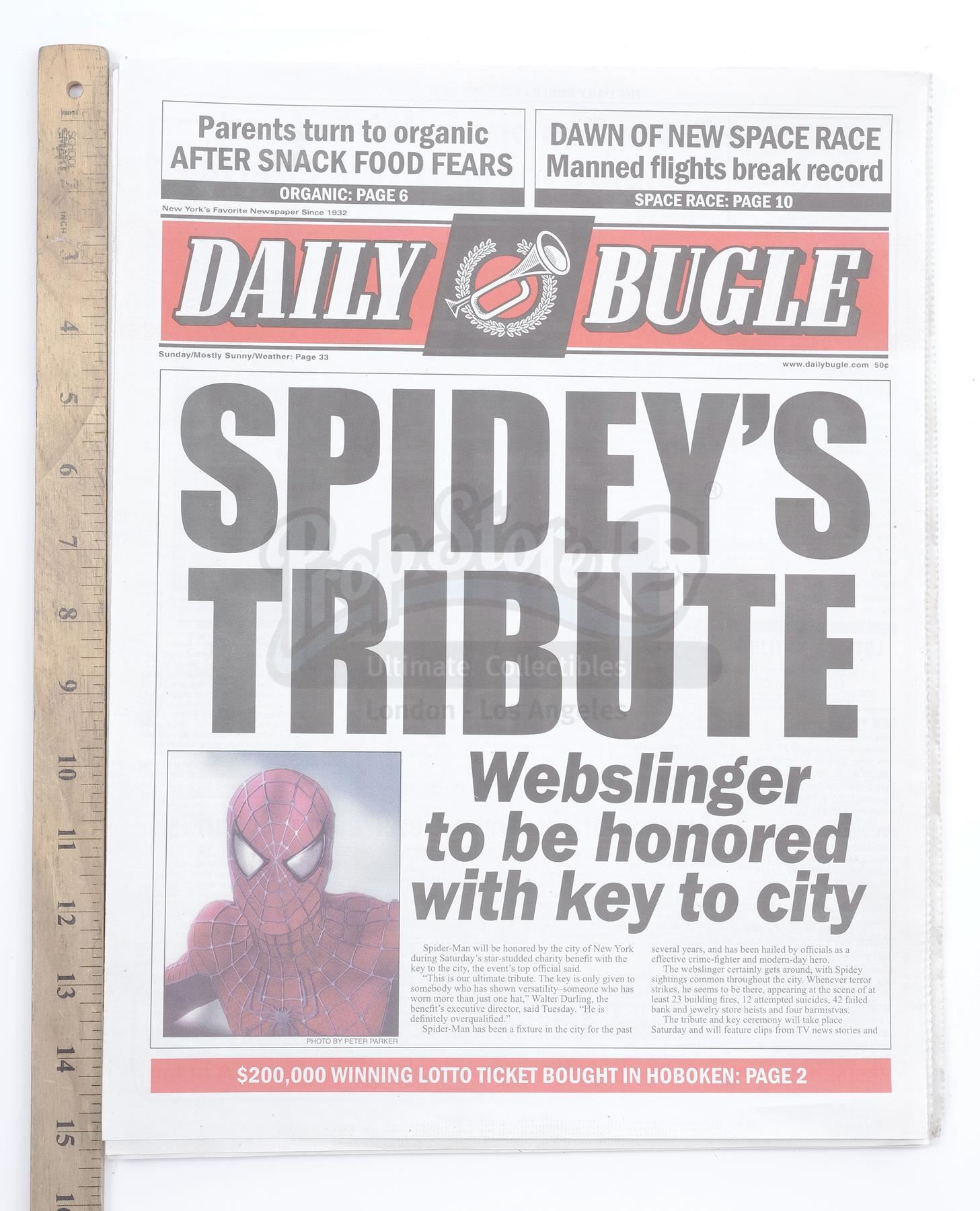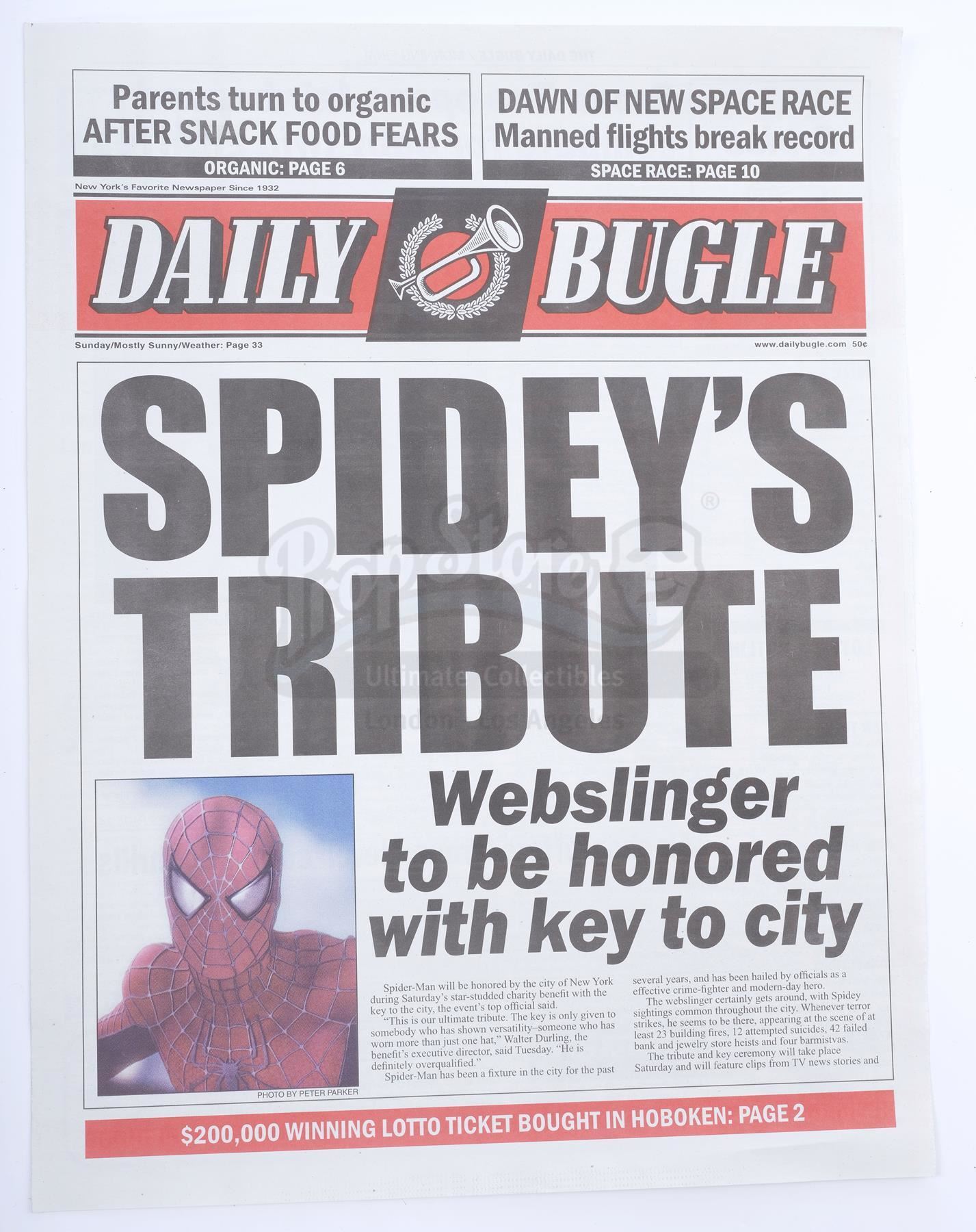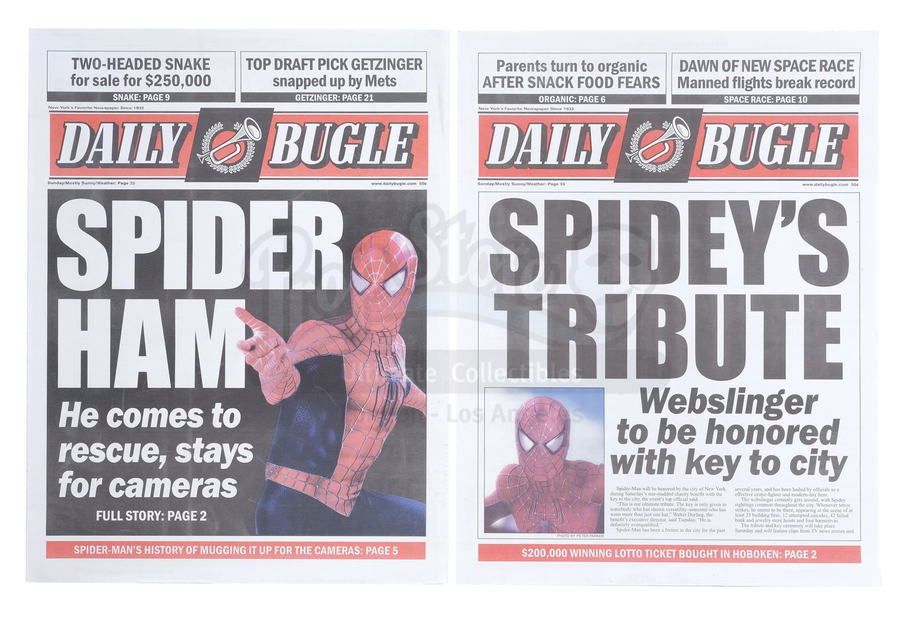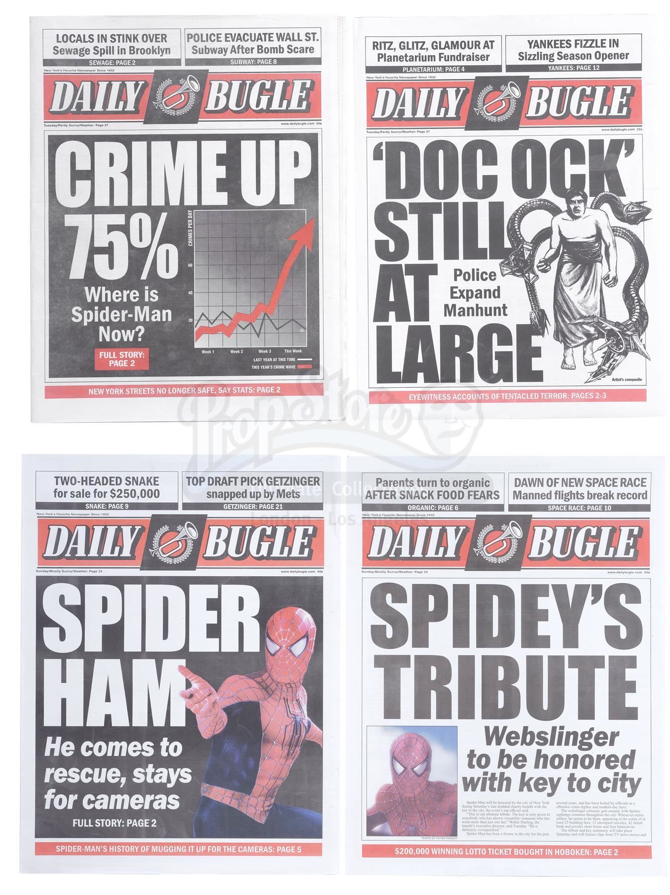 This lot will be auctioned on Thursday, July 1st. The auction will begin at 9:00am PDT and lots are sold sequentially via live auctioneer; tune in to the live streaming broadcast on auction day to follow the pace. Note other lots in the auction may close on June 29th or June 30th. A "Crime Up" Daily Bugle newspaper with three additional covers from Sam Raimi's superhero sequels Spider-Man 2 and Spider-Man 3. Run by editor J. Jonah Jameson (J.K. Simmons), the Daily Bugle newspaper covered several stories related to Spider-Man (Tobey Maguie) as well as his enemies, such as Doctor Octopus (Alfred Molina). This lot consists of color-printed, production-made newspaper covers, two of which feature images of Spider-Man and one of which is headlined "Crime Up 75 Percent" and applied over a full newspaper. It shows signs of wear from age and use, but remains in excellent overall condition. Dimensions (each): 15" x 11.5" (38.25 cm x 29.25 cm) Estimate: $1,500 - 2,500