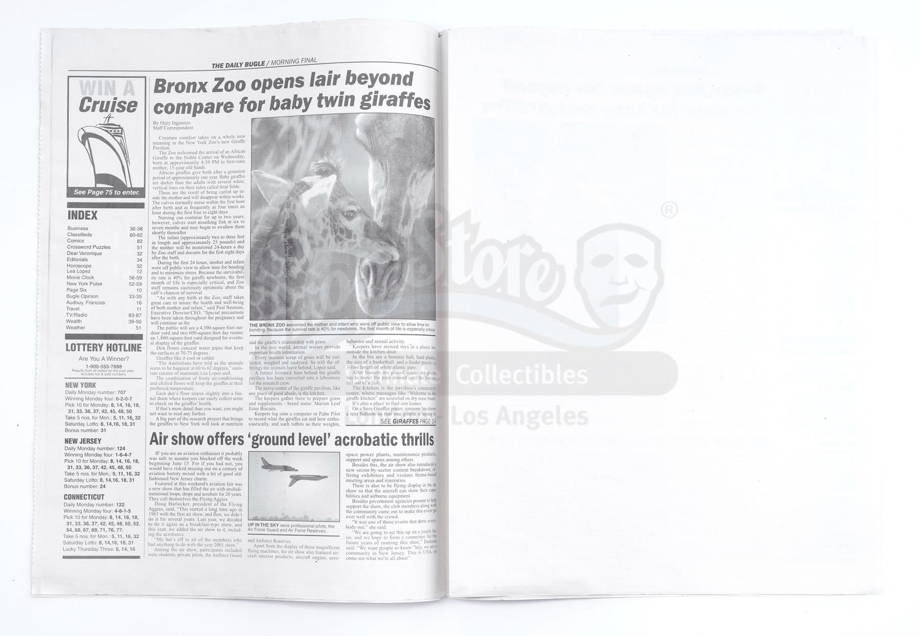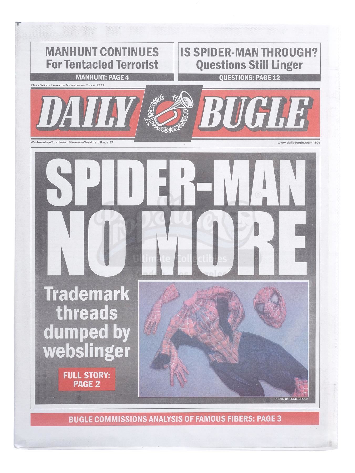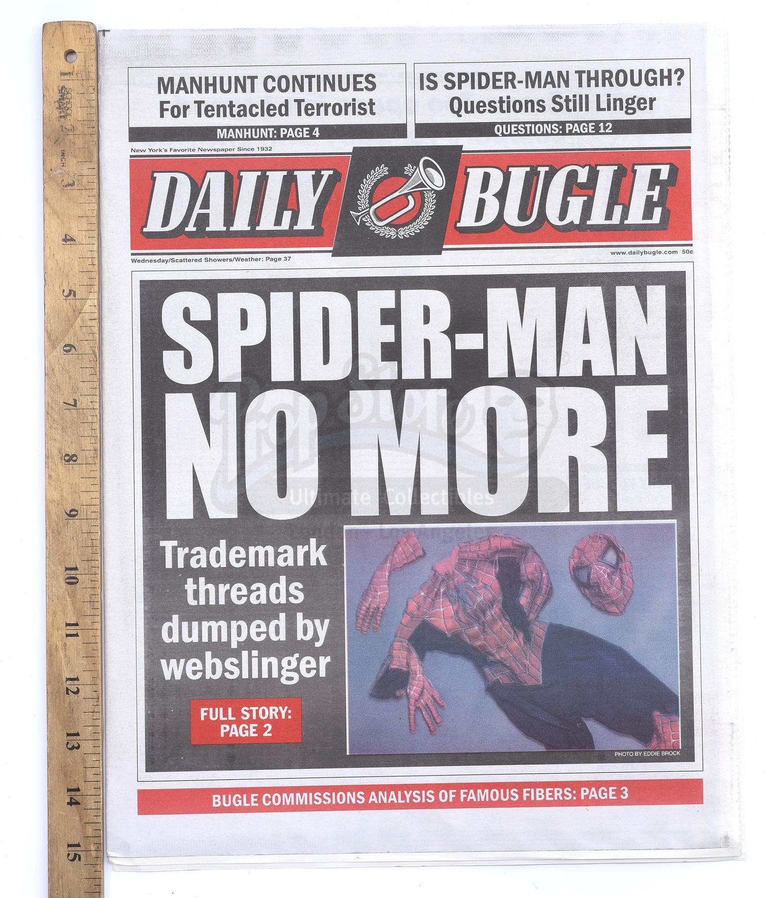 This lot will be auctioned on Thursday, July 1st. The auction will begin at 9:00am PDT and lots are sold sequentially via live auctioneer; tune in to the live streaming broadcast on auction day to follow the pace. Note other lots in the auction may close on June 29th or June 30th. A Daily Bugle full newspaper headlined "Spider-Man No More" from Sam Raimi's superhero sequel Spider-Man 2. J. Jonah Jameson (J.K. Simmons) reported on Spider-Man's trashed costume in his newspaper, the Daily Bugle, after Peter Parker's (Tobey Maguire) quit as Spider-Man. This lot consists of a production-made color-printed newspaper cover headlined "SPIDER-MAN NO MORE" with a color image of Spider-Man's costume applied over a pre-existing newspaper interior. It exhibits signs of wear from age and use, but remains in excellent overall condition. Dimensions: 15" x 11.5" (38.25 cm x 29.25 cm) Estimate: $1,000 - 1,500