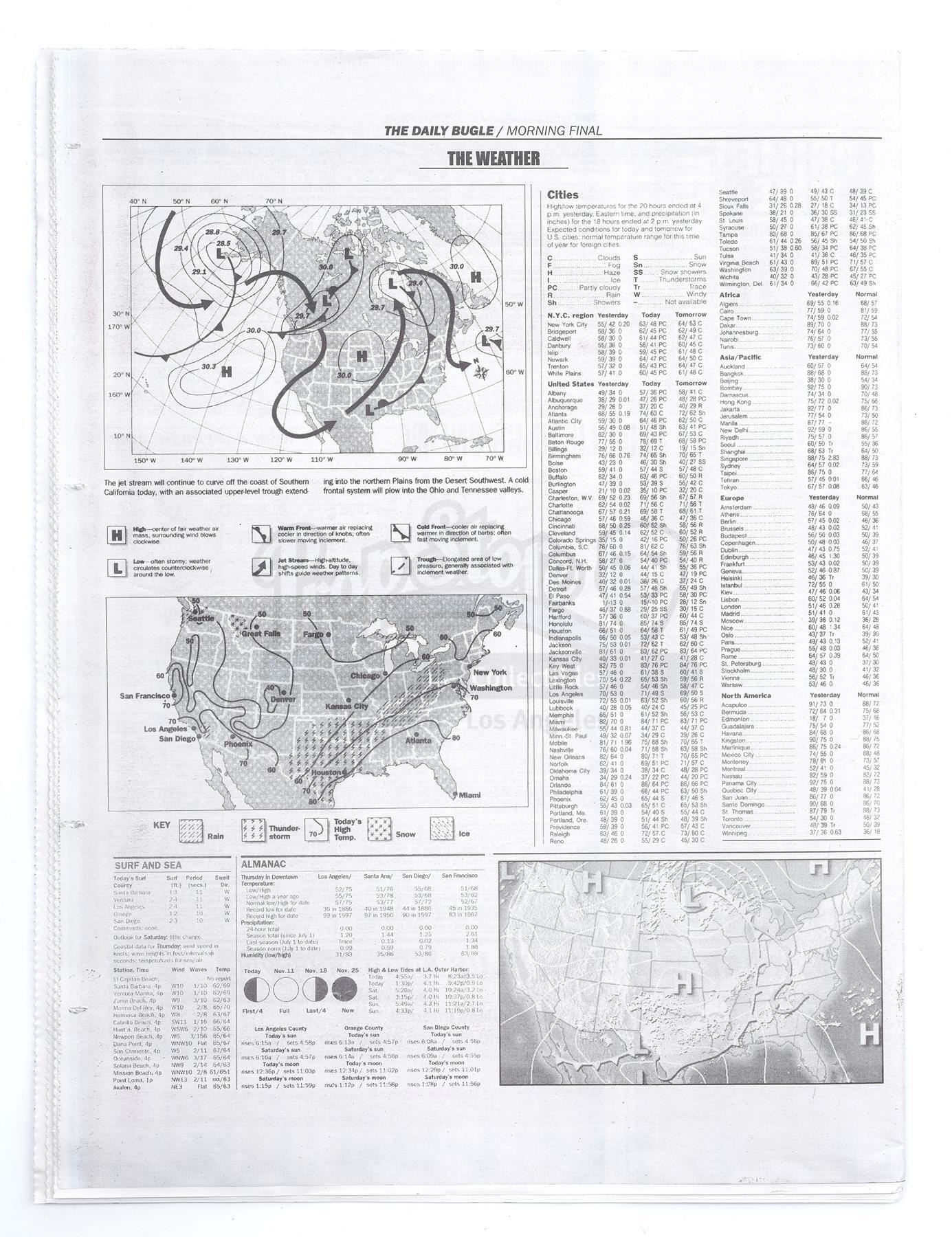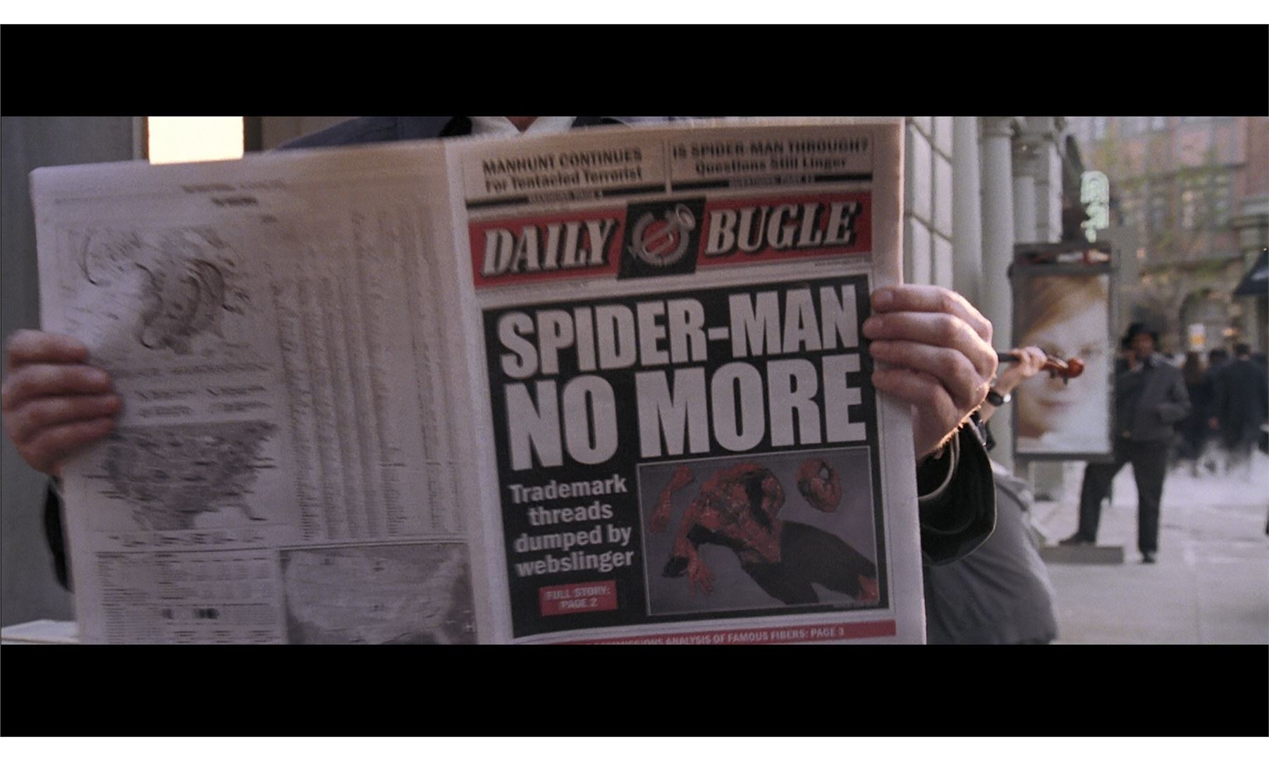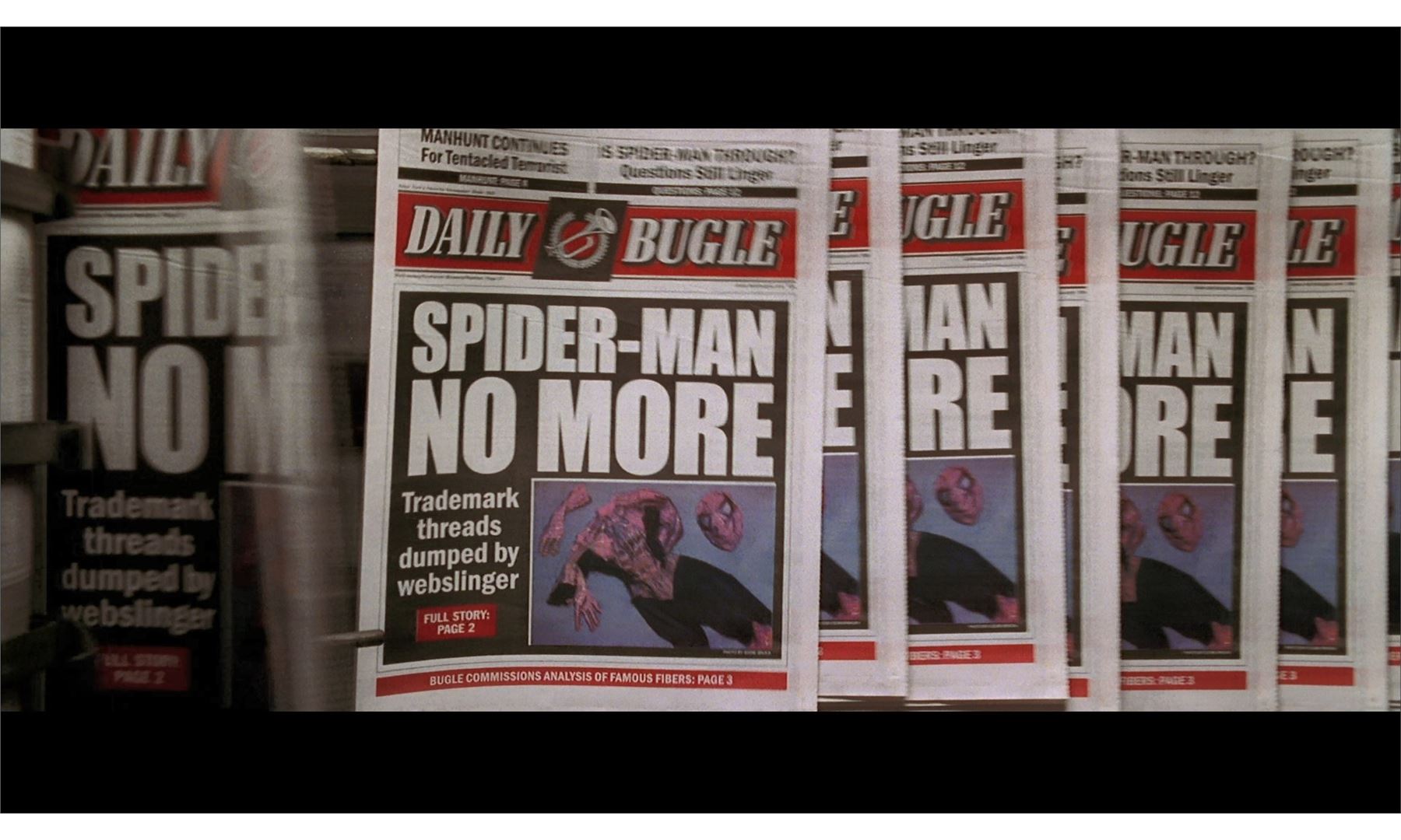 This lot will be auctioned on Thursday, July 1st. The auction will begin at 9:00am PDT and lots are sold sequentially via live auctioneer; tune in to the live streaming broadcast on auction day to follow the pace. Note other lots in the auction may close on June 29th or June 30th. A Daily Bugle full newspaper headlined "Spider-Man No More" from Sam Raimi's superhero sequel Spider-Man 2. J. Jonah Jameson (J.K. Simmons) reported on Spider-Man's trashed costume in his newspaper, the Daily Bugle, after Peter Parker's (Tobey Maguire) quit as Spider-Man. This lot consists of a production-made color-printed newspaper cover headlined "SPIDER-MAN NO MORE" with a color image of Spider-Man's costume applied over a pre-existing newspaper interior. It exhibits signs of wear from age and use, but remains in excellent overall condition. Dimensions: 15" x 11.5" (38.25 cm x 29.25 cm) Estimate: $1,000 - 1,500