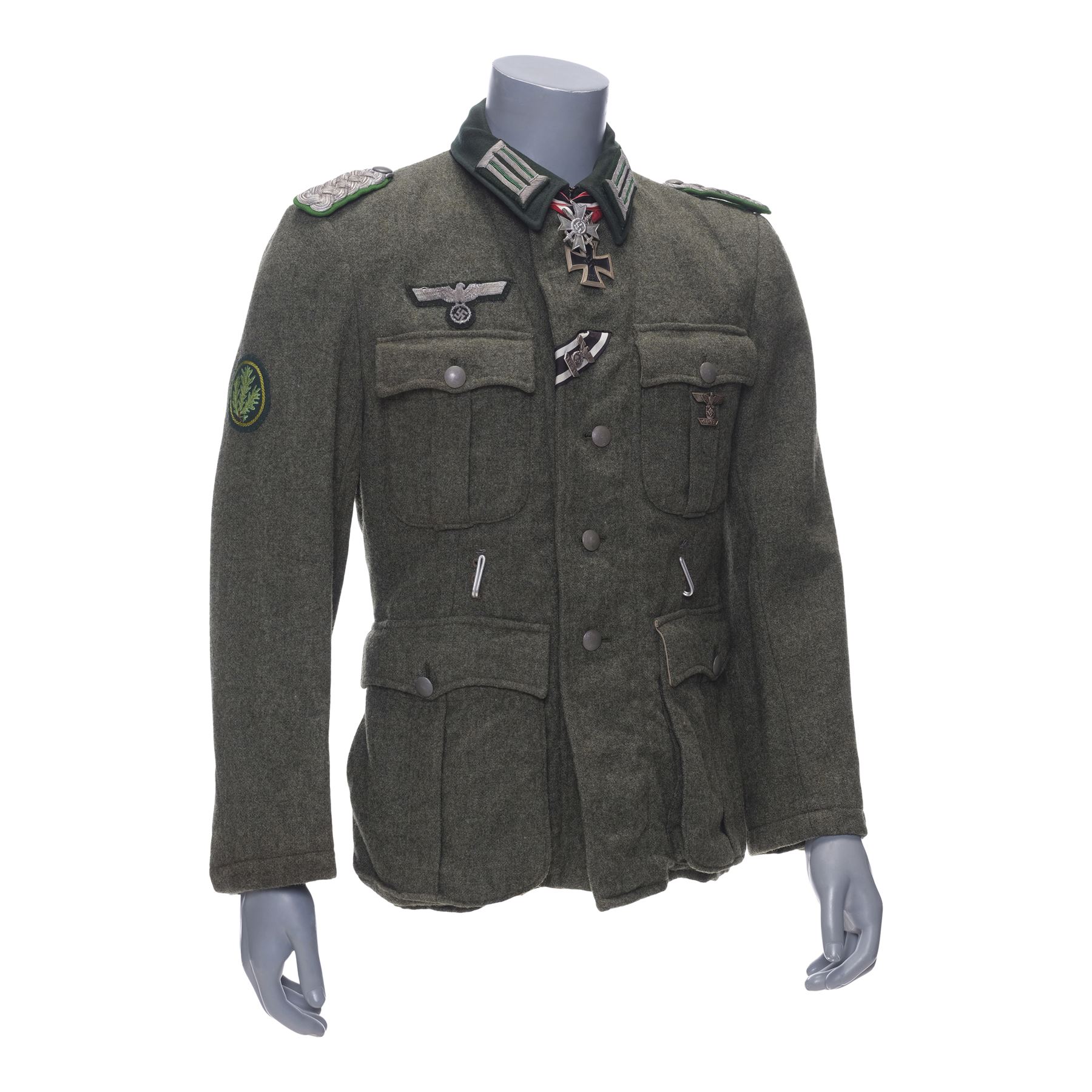 The wool field-grey jacket is adorned with a Jaeger sleeve patch, a single silver-colour and green collar tab, matching shoulder boards, an Iron Cross button ribbon, a Wehrmacht breast patch, a pin and two pleated chest and hip pockets, as well as an internal pocket matching the khaki lining and metal belt hooks. Inside is an Angels Costumiers label reading "Ed Harris 2000." Also included are two prop medals: one Knights Cross of the Iron Cross with Oak Leaves, and a War Merit Cross. This jacket exhibits some wrinkling and snagged threads.