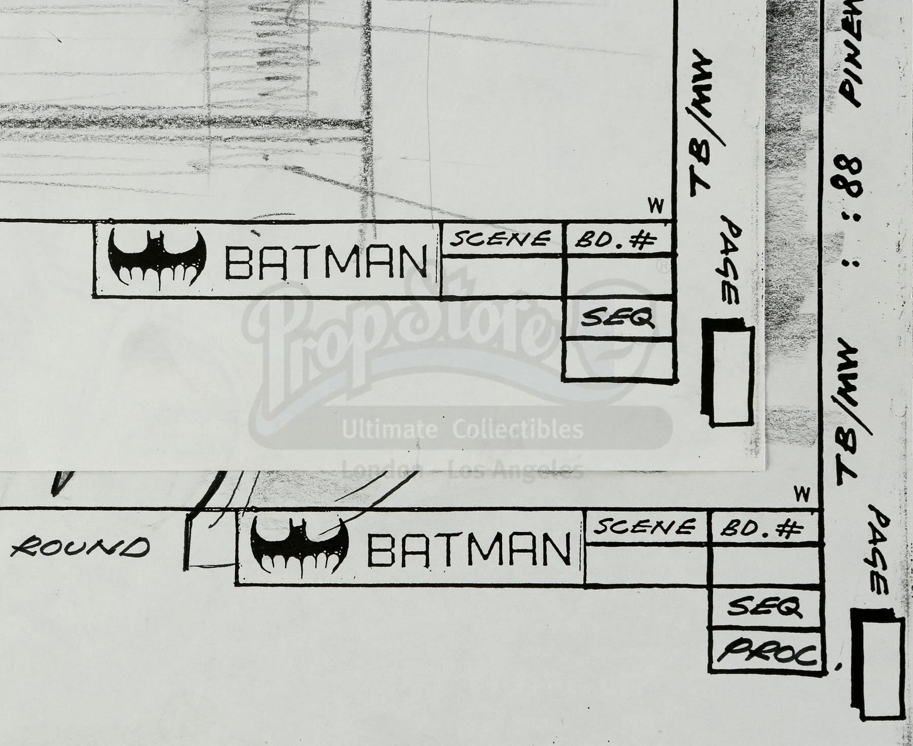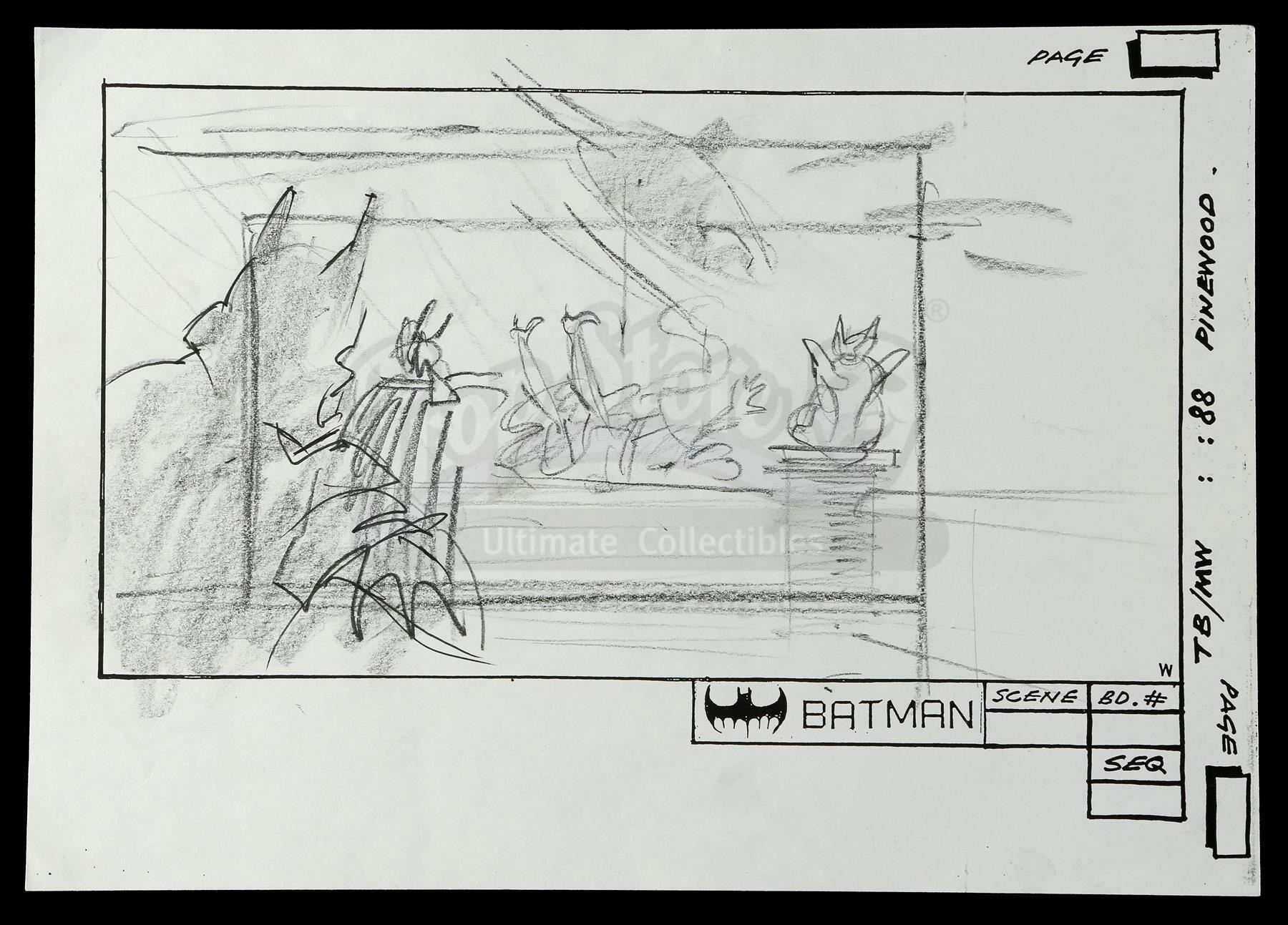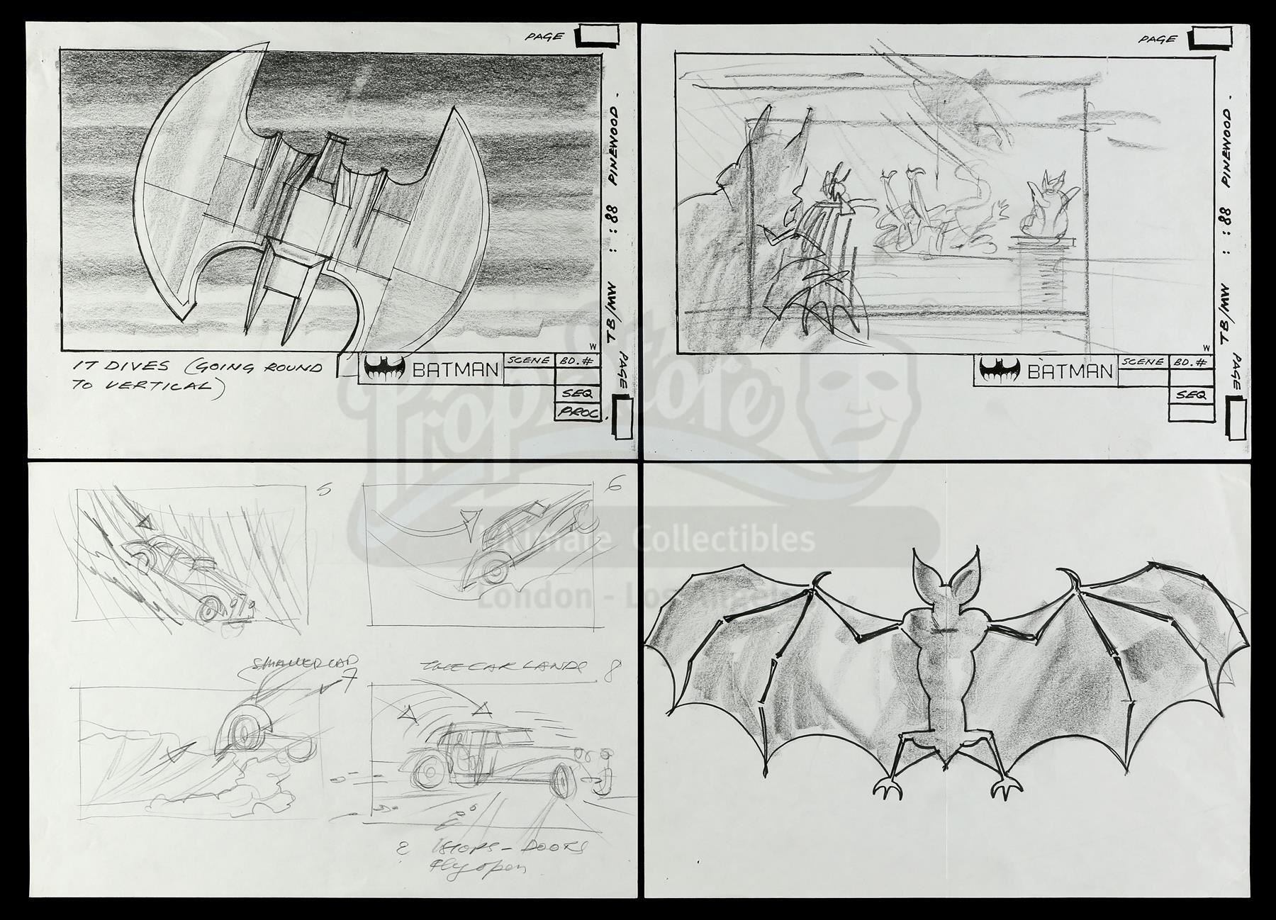 A hand-drawn storyboard set from Tim Burton's superhero film Batman. The set is comprised of four storyboards, two of which are printed with the film title with other spaces for production details, and two drawn on plain paper. Two storyboards are hand-drawn with graphite and ink on storyboard paper, with one page depicting a flying batarang and the other illustrating Batman and Vicki Vale falling off a church roof.