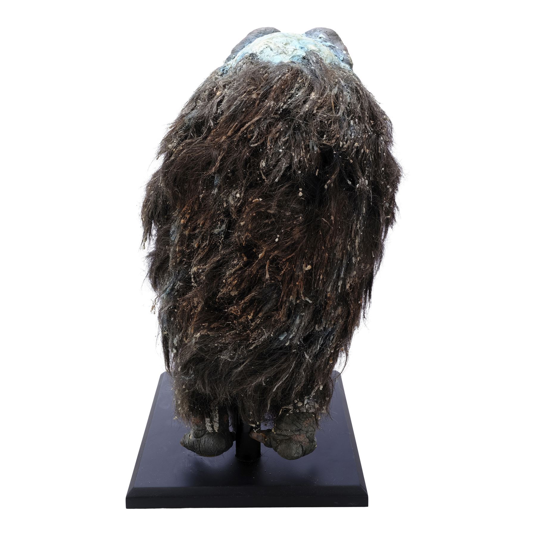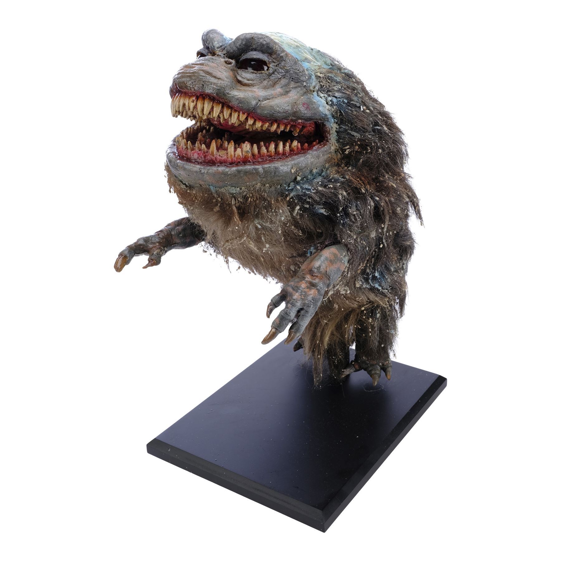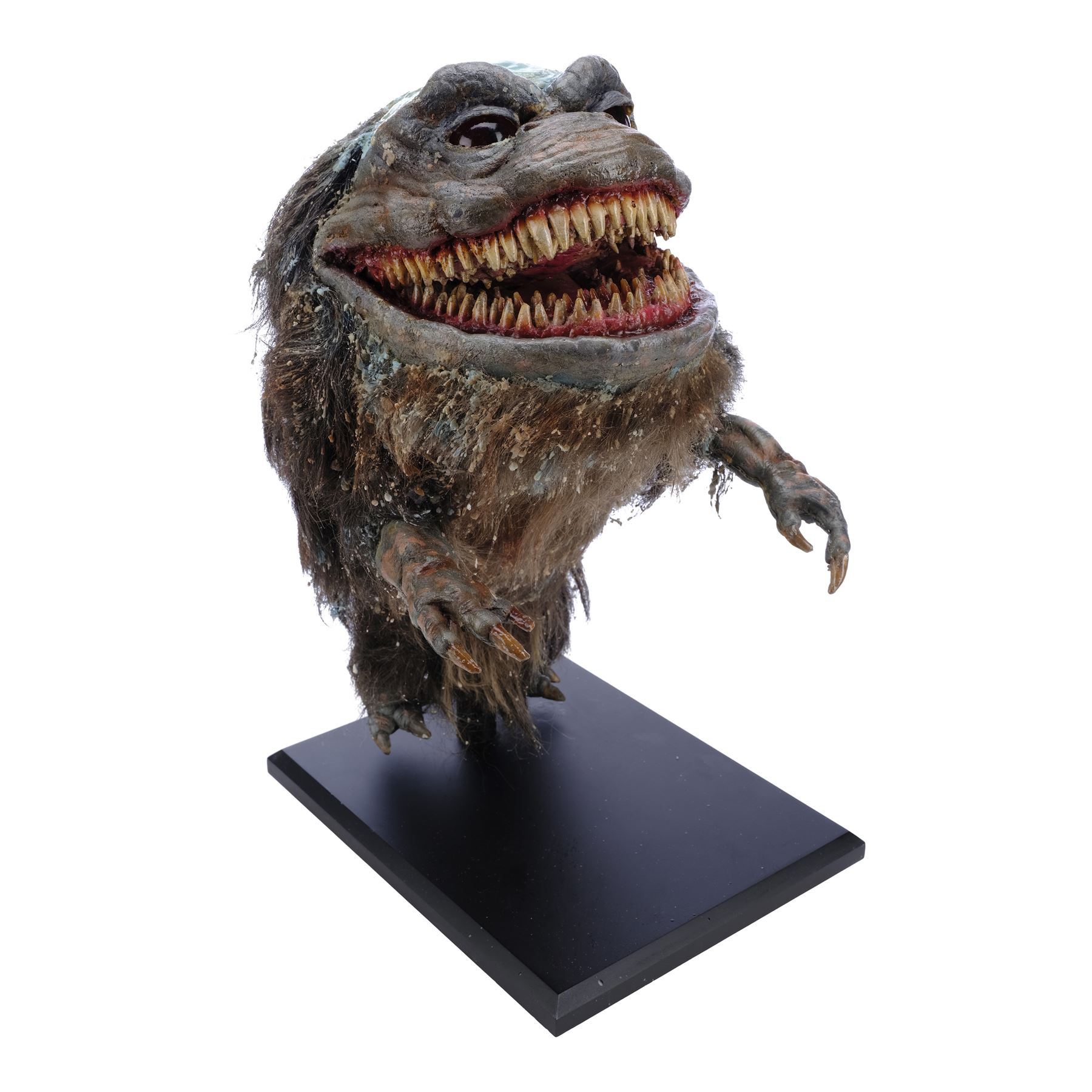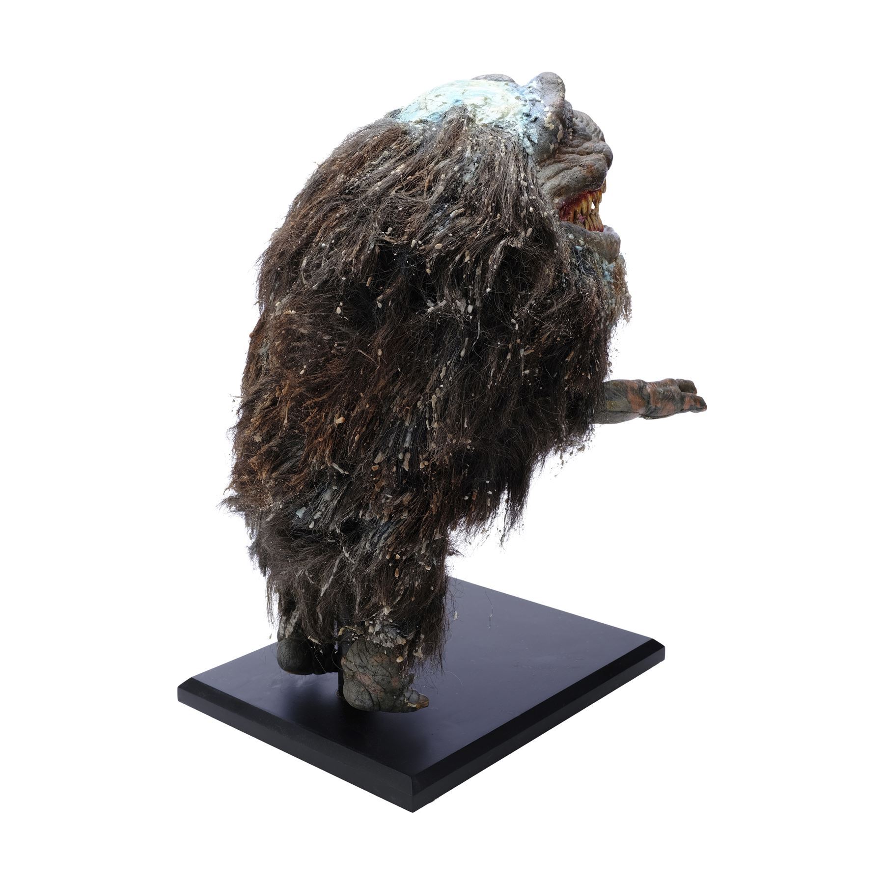 Created for scenes before the flash-frozen Critter shattered, this foam latex puppet features painted blue skin, pink gums, multiple rows of yellowed teeth, hand-punched gray synthetic fur, and red plastic eyes, all mounted to a black wooden display base. The top of its head is smeared with blue flash-freezing "slime," and additional slime residue is scattered throughout the fur. This puppet underwent sympathetic restoration following production, including having its eyes re-opened, and the foam latex exhibits chipping from age. Dimensions: 14" x 11" x 21" (35.75 cm x 28 cm x 53.5 cm)