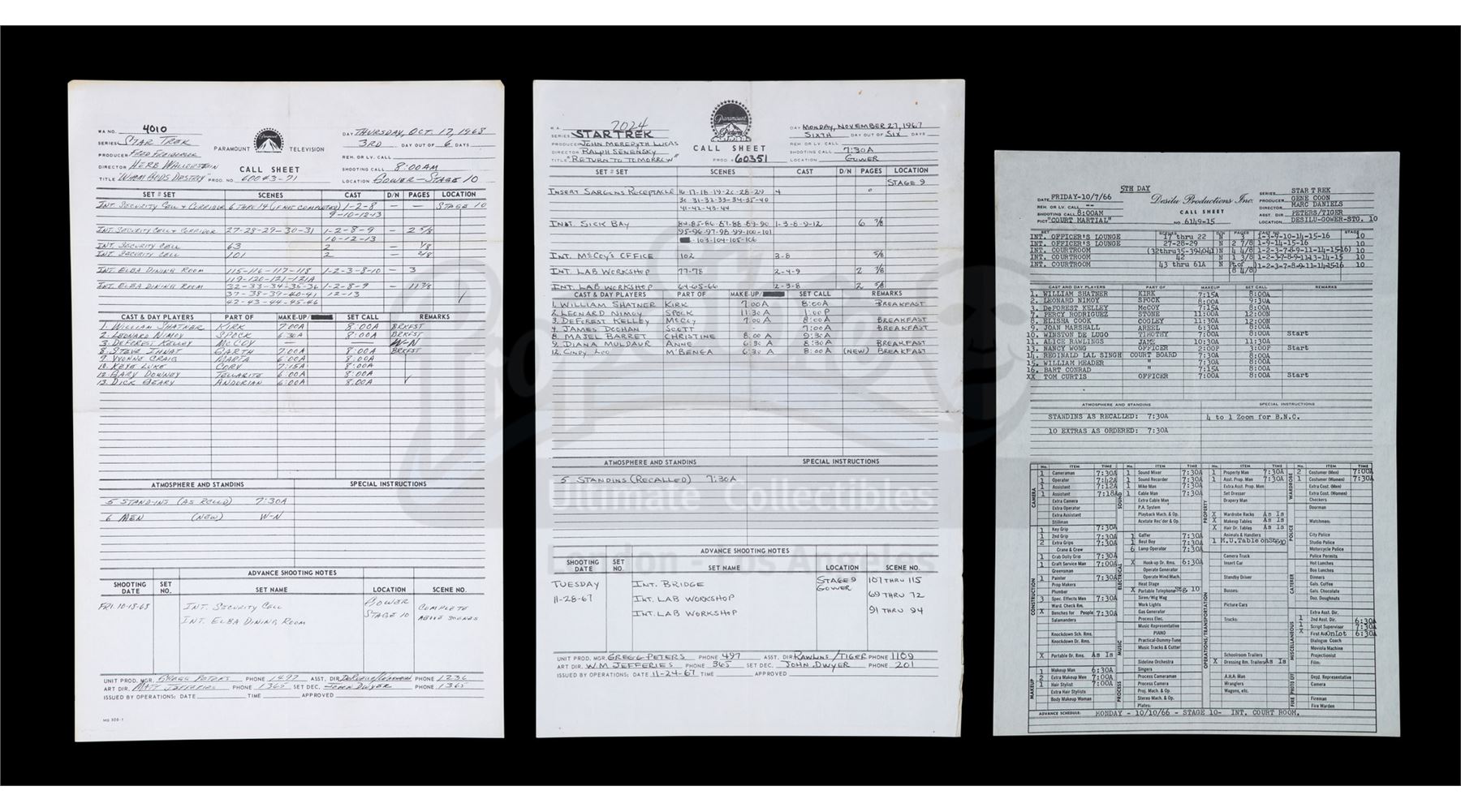 Lot # 1051: STAR TREK: THE ORIGINAL SERIES (T.V. SERIES 1966 - 1969) - Set of Three Call Sheets
