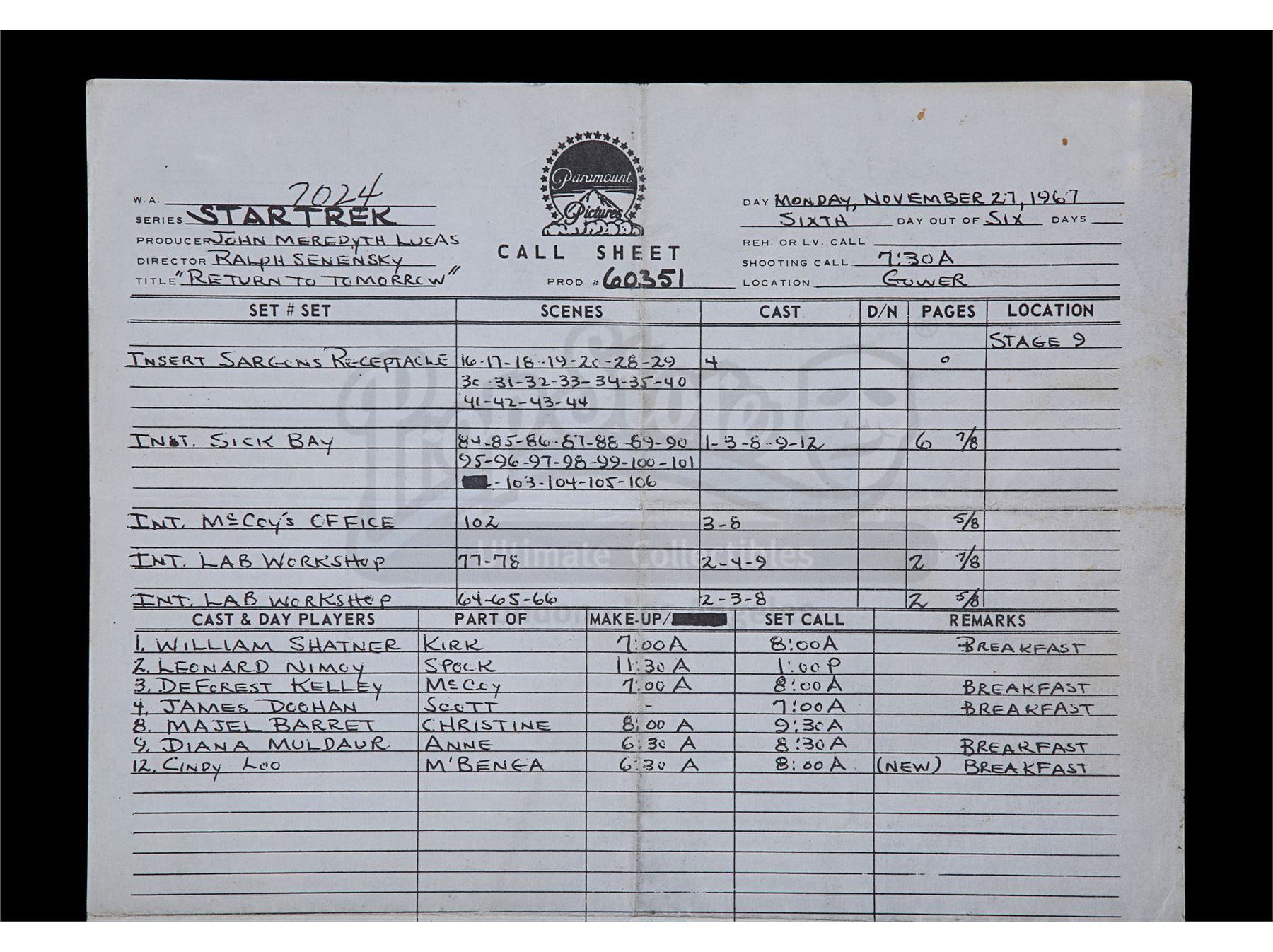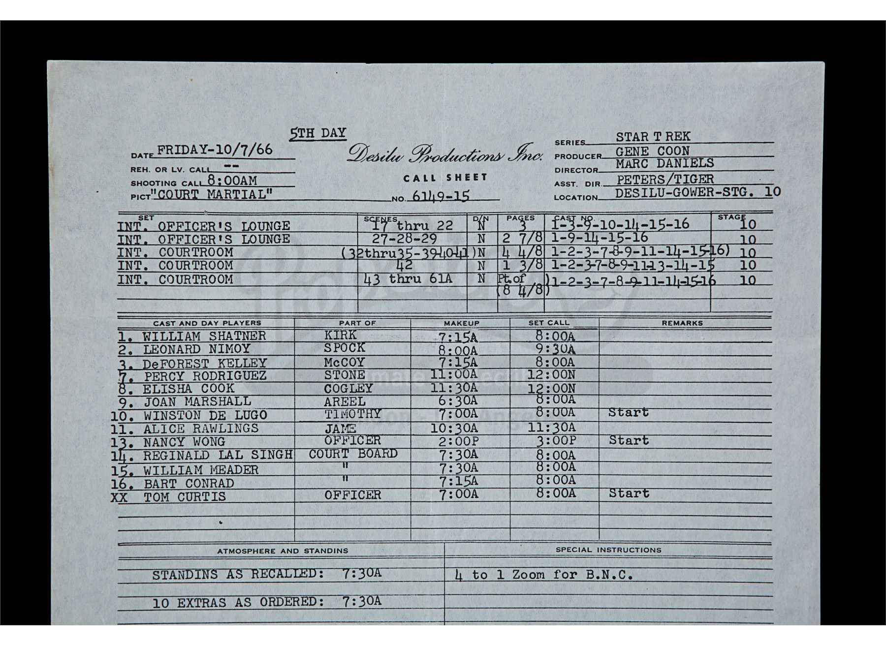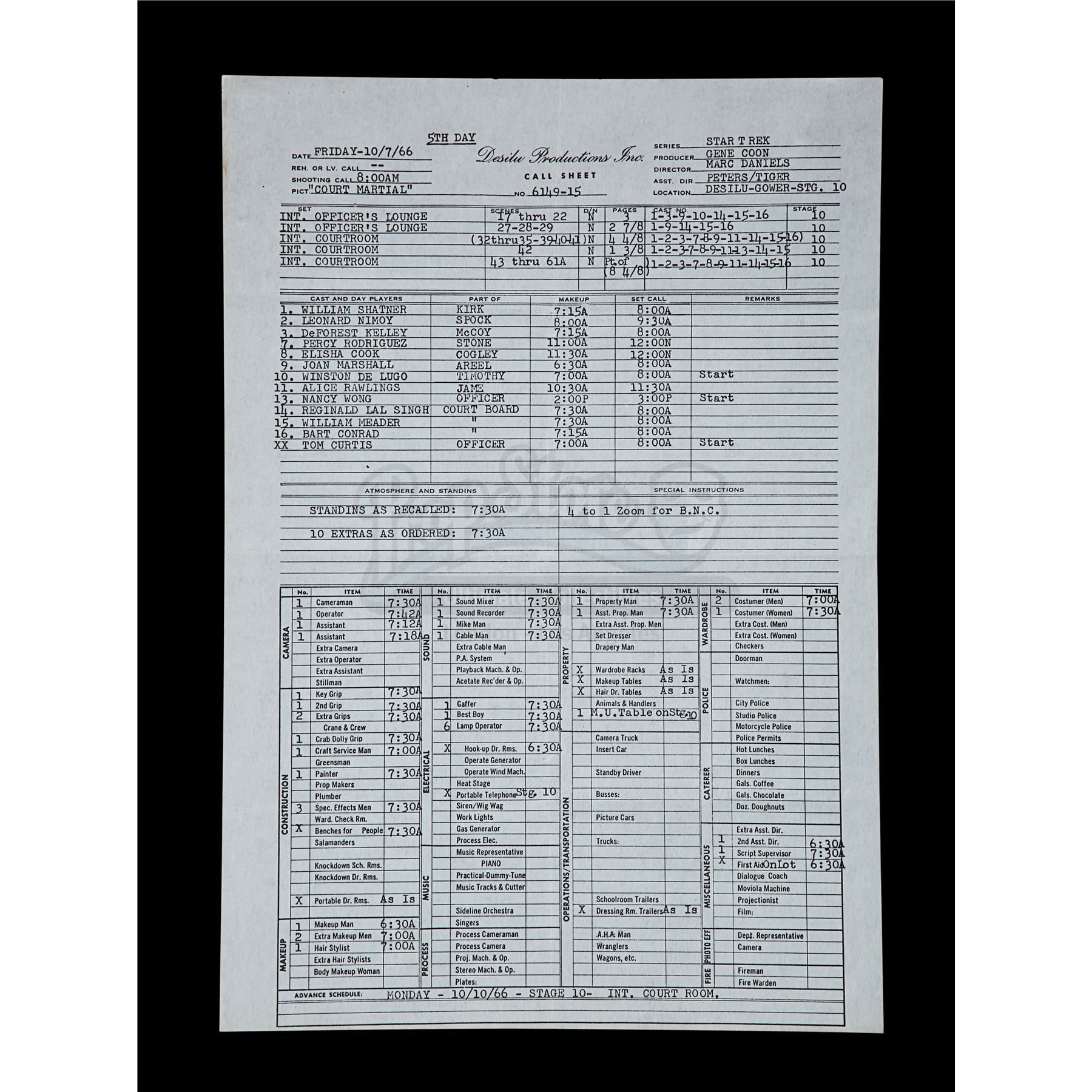 This lot will be auctioned on Thursday, July 1st. The auction will begin at 9:00am PDT and lots are sold sequentially via live auctioneer; tune in to the live streaming broadcast on auction day to follow the pace. Note other lots in the auction may close on June 29th or June 30th. A set of three call sheets from the production of Gene Roddenberry's sci-fi television show Star Trek: The Original Series. The lot consists of one sheet for the Season 1 episode "Court Martial" (dated "Friday - 10/7/66"); one sheet for the Season 2 episode "Return to Tomorrow" (dated "Monday, November 27, 1967"); and the final sheet is for the season 3 episode "Whom Gods Destroy" (dated "Thursday, Oct 17, 1968"). They remain in good overall condition with various creases, fold lines, light edge wear, and signs of discoloration from age. Dimensions: (largest) 13" x 8.5" (33 cm x 21.5 cm) Estimate: $600 - 800