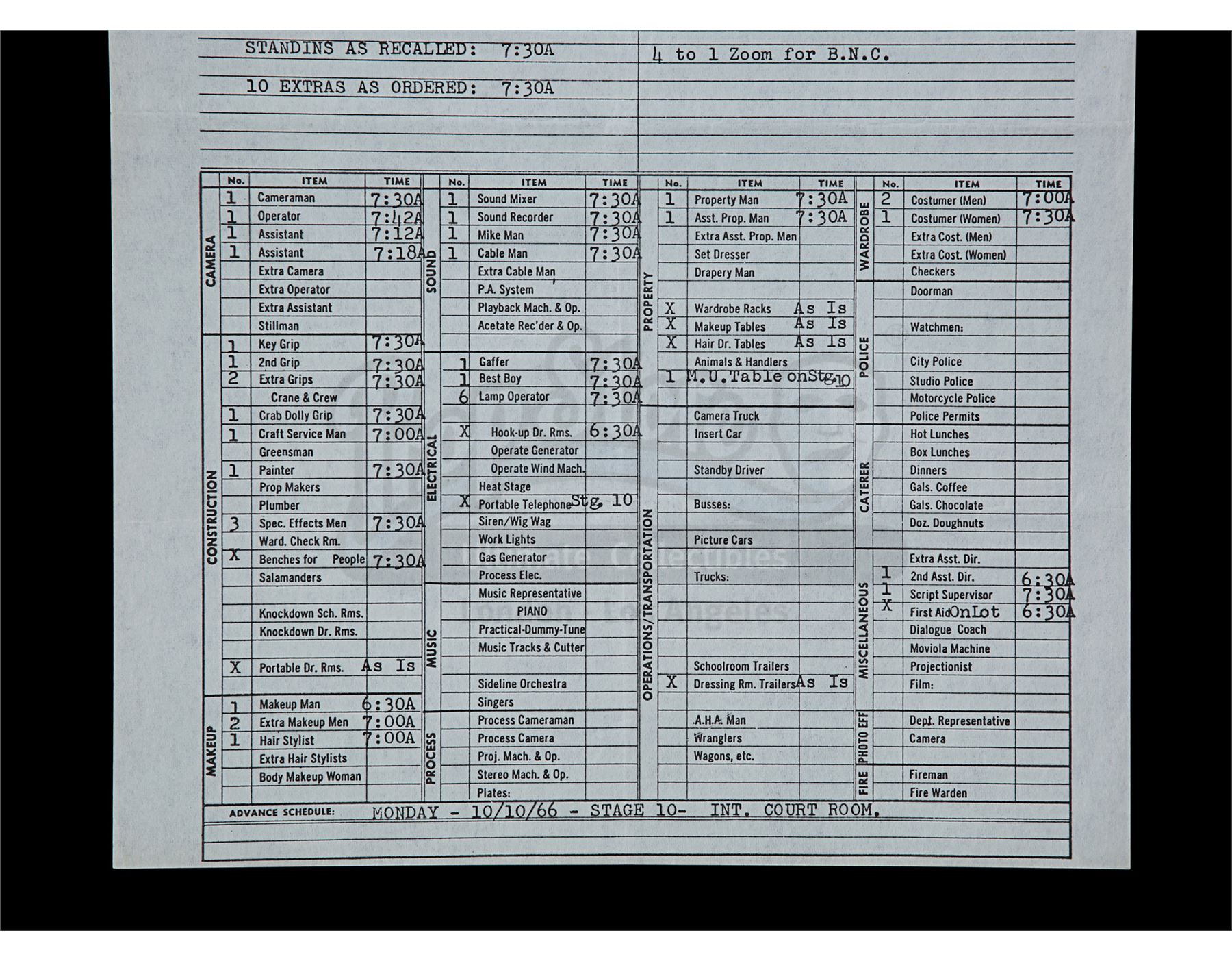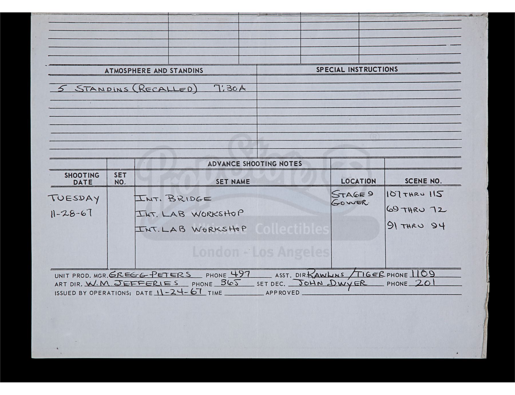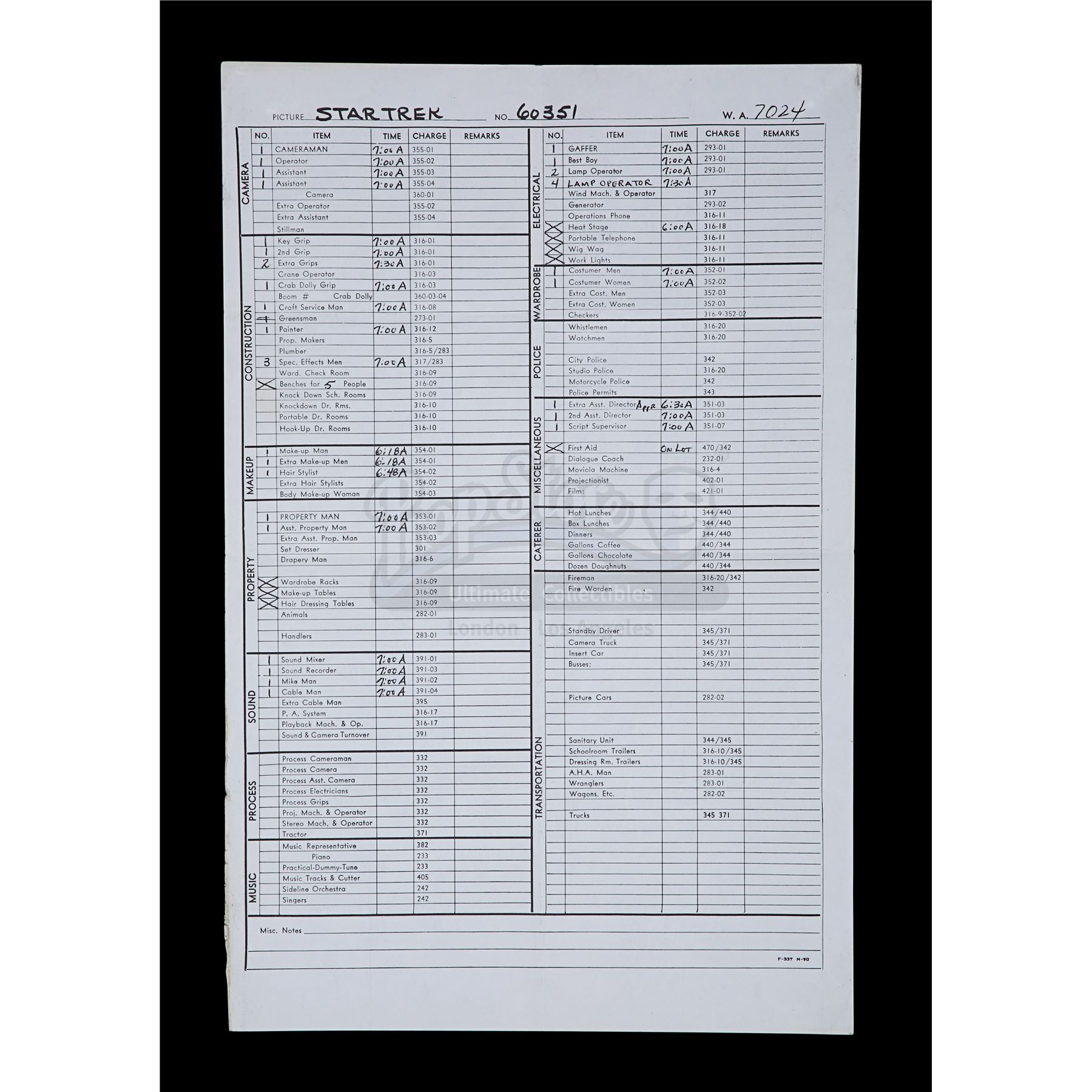 This lot will be auctioned on Thursday, July 1st. The auction will begin at 9:00am PDT and lots are sold sequentially via live auctioneer; tune in to the live streaming broadcast on auction day to follow the pace. Note other lots in the auction may close on June 29th or June 30th. A set of three call sheets from the production of Gene Roddenberry's sci-fi television show Star Trek: The Original Series. The lot consists of one sheet for the Season 1 episode "Court Martial" (dated "Friday - 10/7/66"); one sheet for the Season 2 episode "Return to Tomorrow" (dated "Monday, November 27, 1967"); and the final sheet is for the season 3 episode "Whom Gods Destroy" (dated "Thursday, Oct 17, 1968"). They remain in good overall condition with various creases, fold lines, light edge wear, and signs of discoloration from age. Dimensions: (largest) 13" x 8.5" (33 cm x 21.5 cm) Estimate: $600 - 800