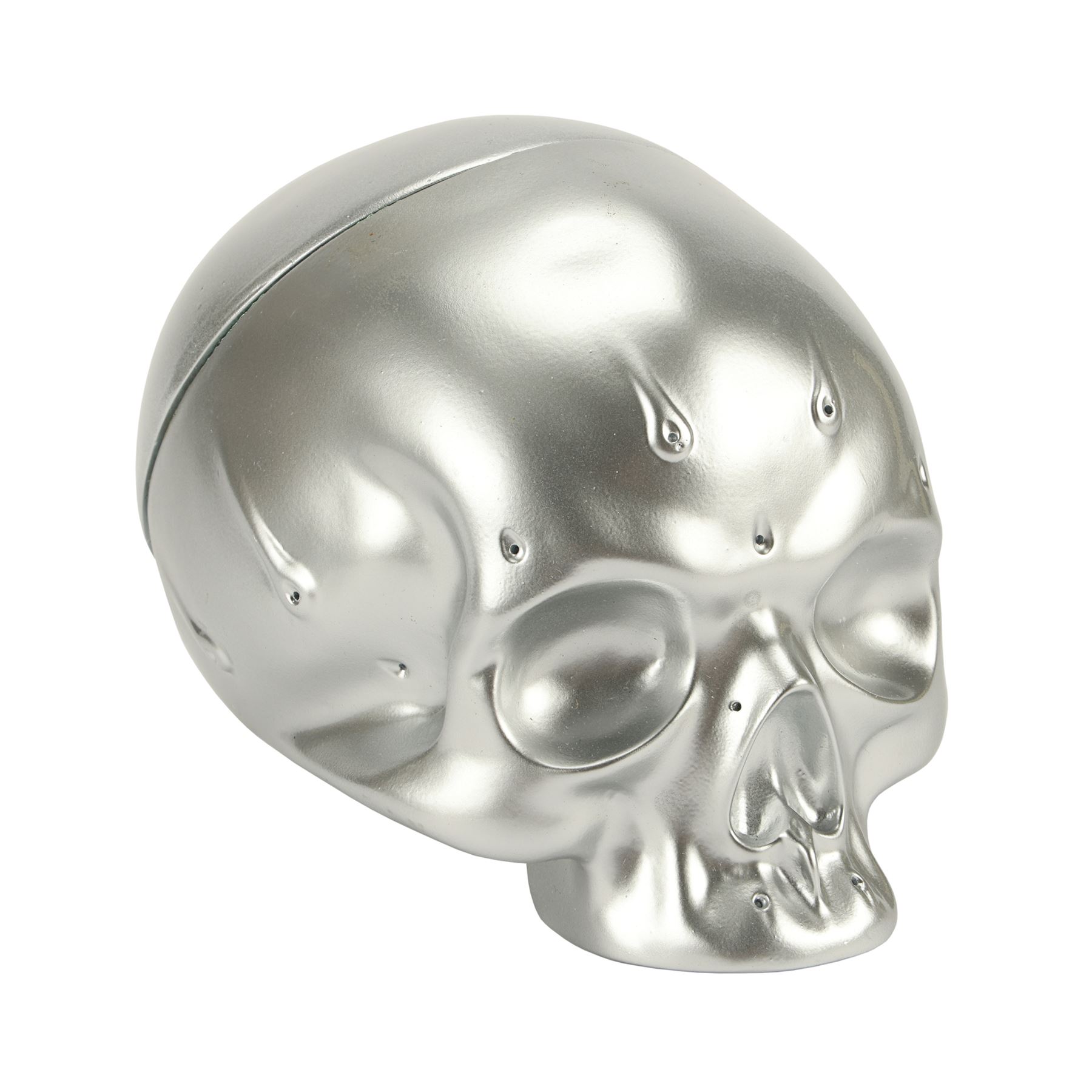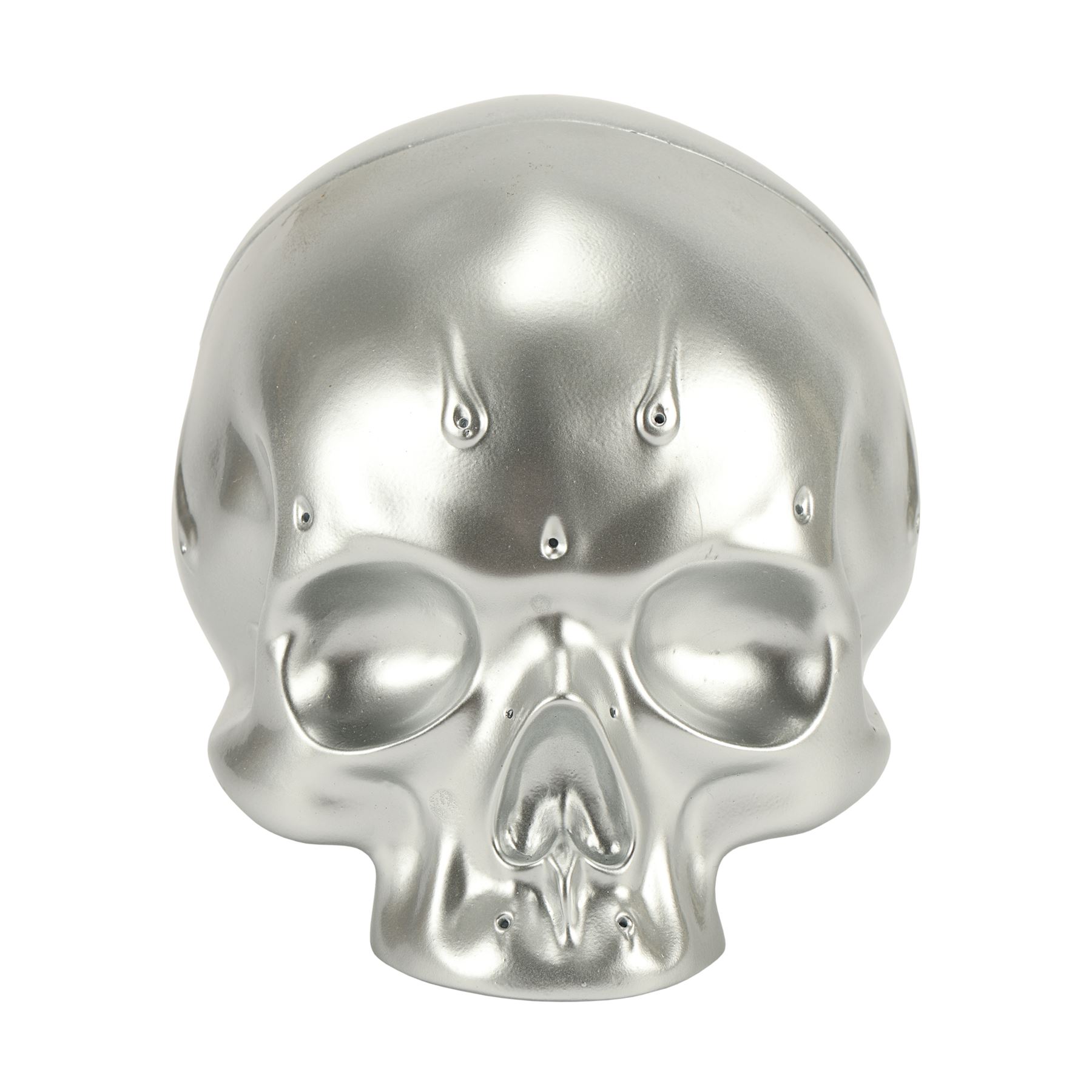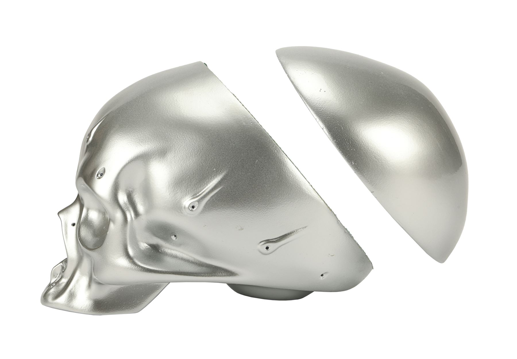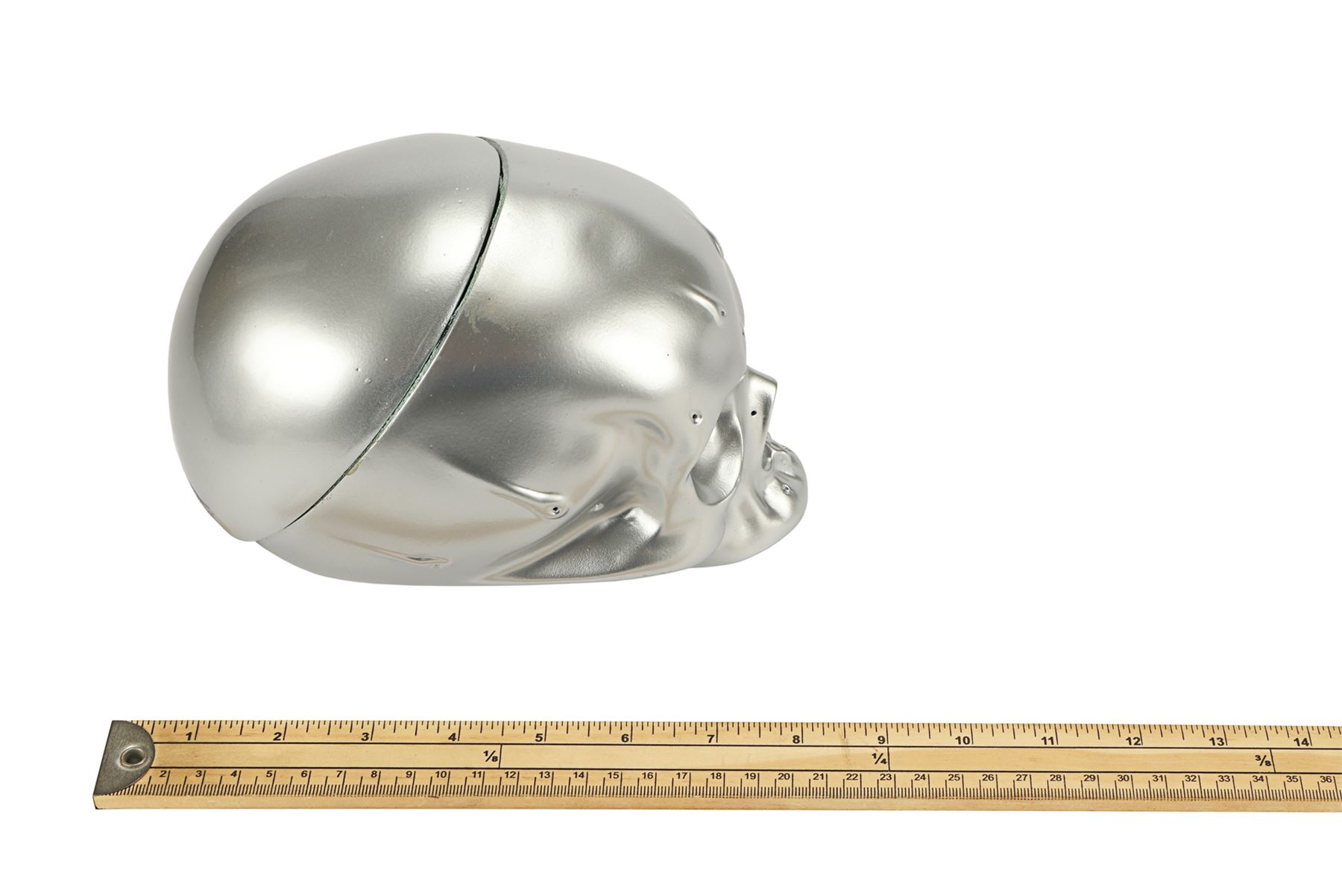 The silver-coloured matte skull is made of resin and displays a separate cap. A strip of metallic green netting is adhered to the top edge, where the cap should attach. Both components are unfinished inside, and glue remnants are present inside the skull and cap. Dimensions (with cap attached): 19 cm x 14 cm x 14 cm (7 1/2" x 5 1/2" x 5 1/2")
