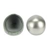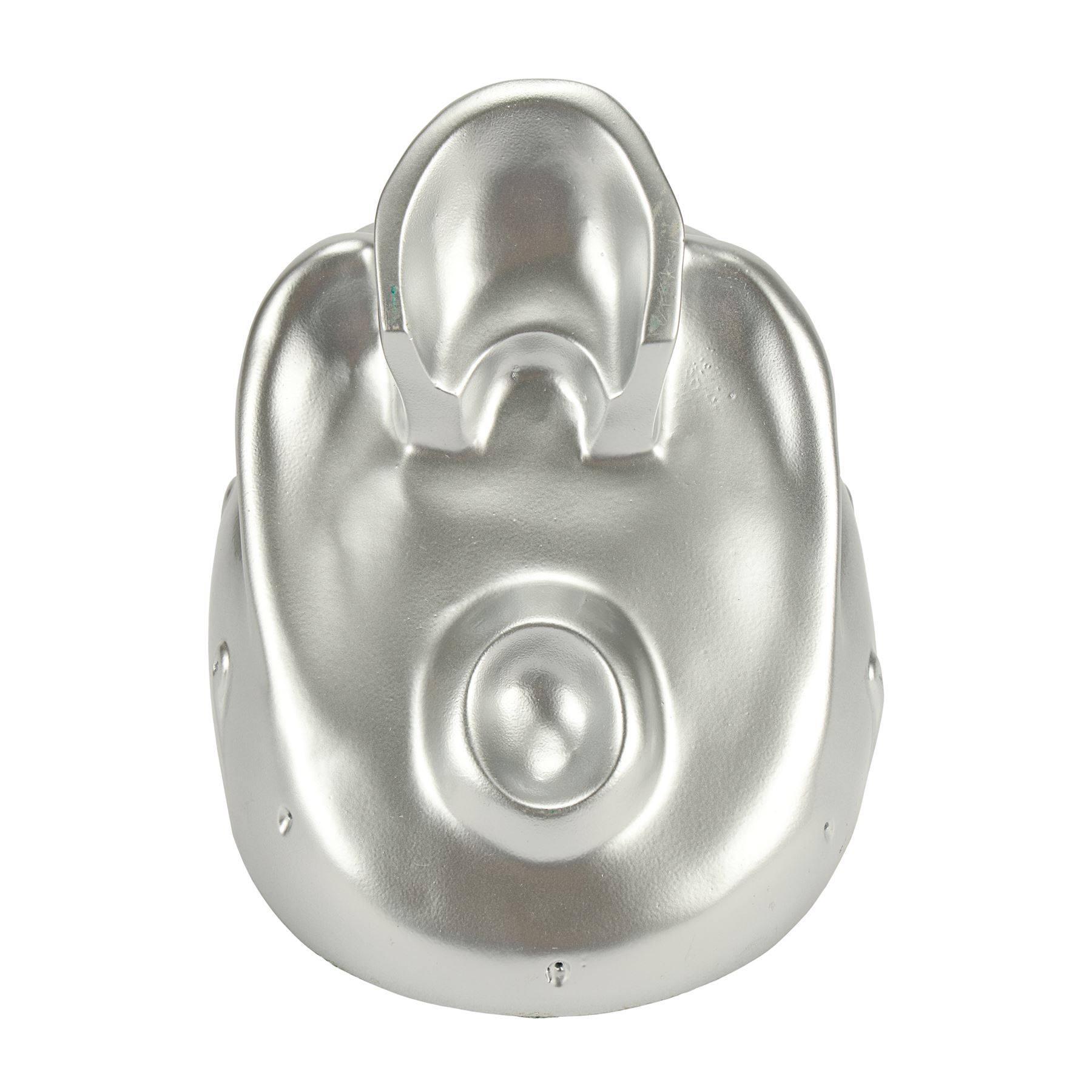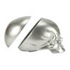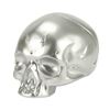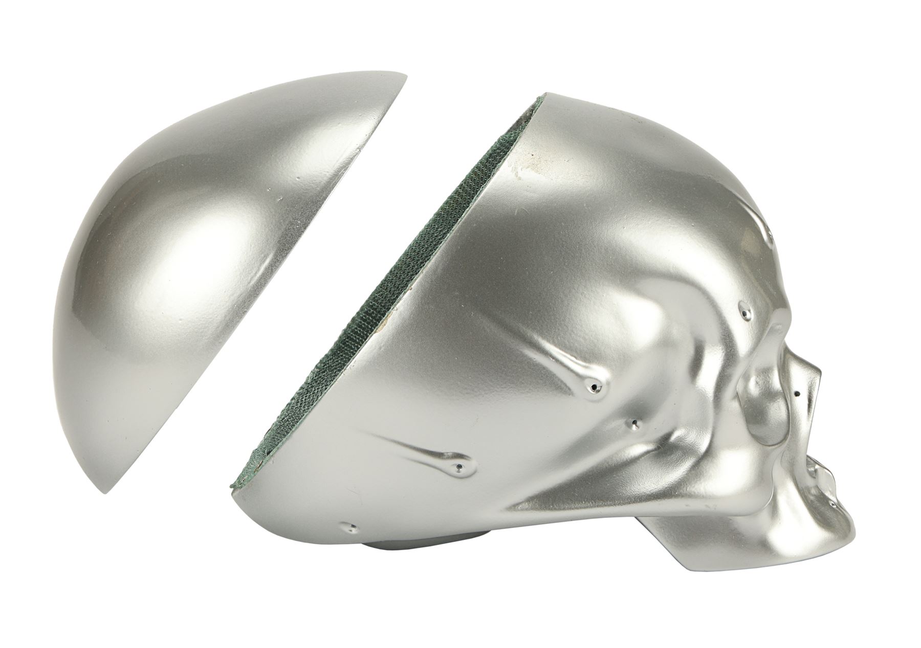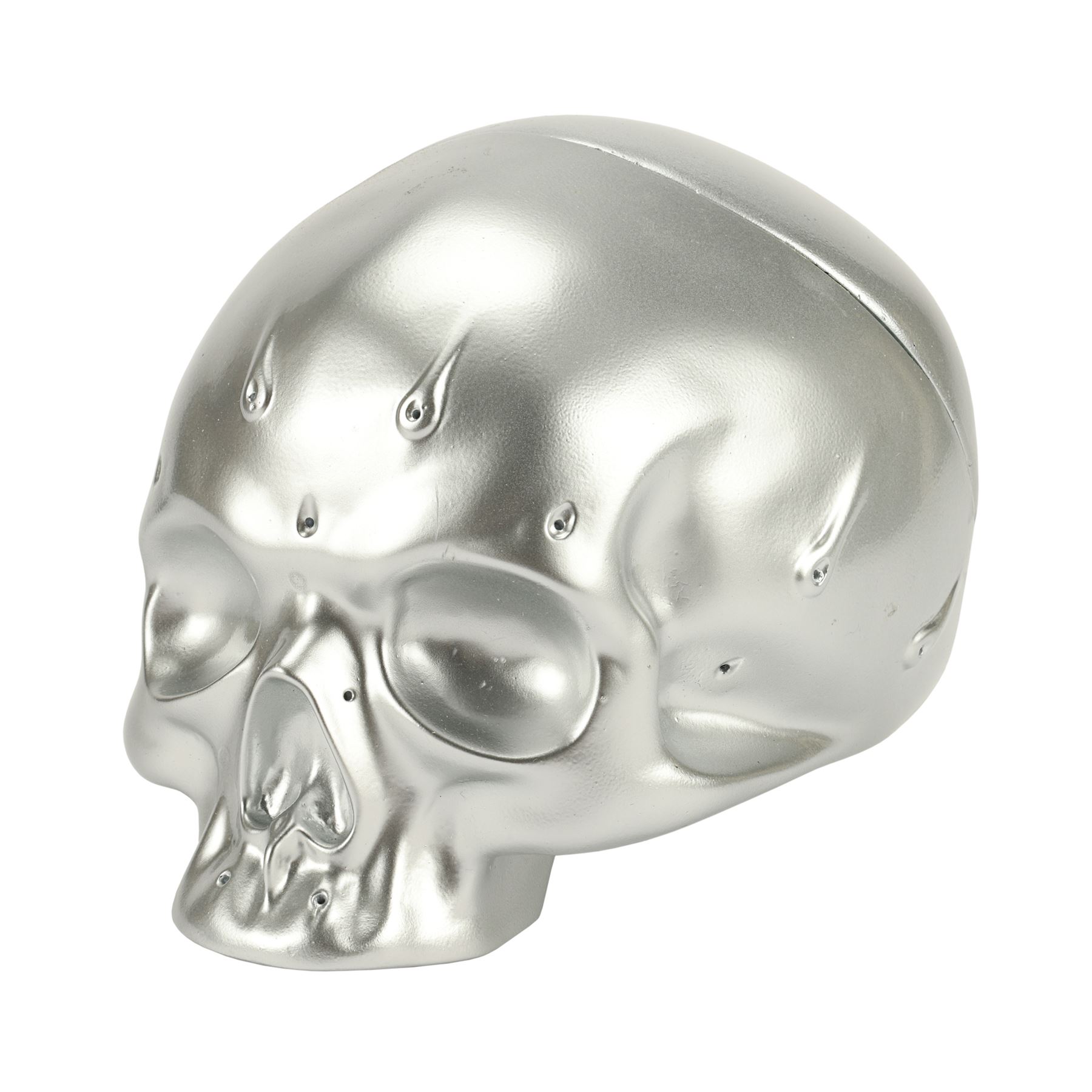 The silver-coloured matte skull is made of resin and displays a separate cap. A strip of metallic green netting is adhered to the top edge, where the cap should attach. Both components are unfinished inside, and glue remnants are present inside the skull and cap. Dimensions (with cap attached): 19 cm x 14 cm x 14 cm (7 1/2" x 5 1/2" x 5 1/2")