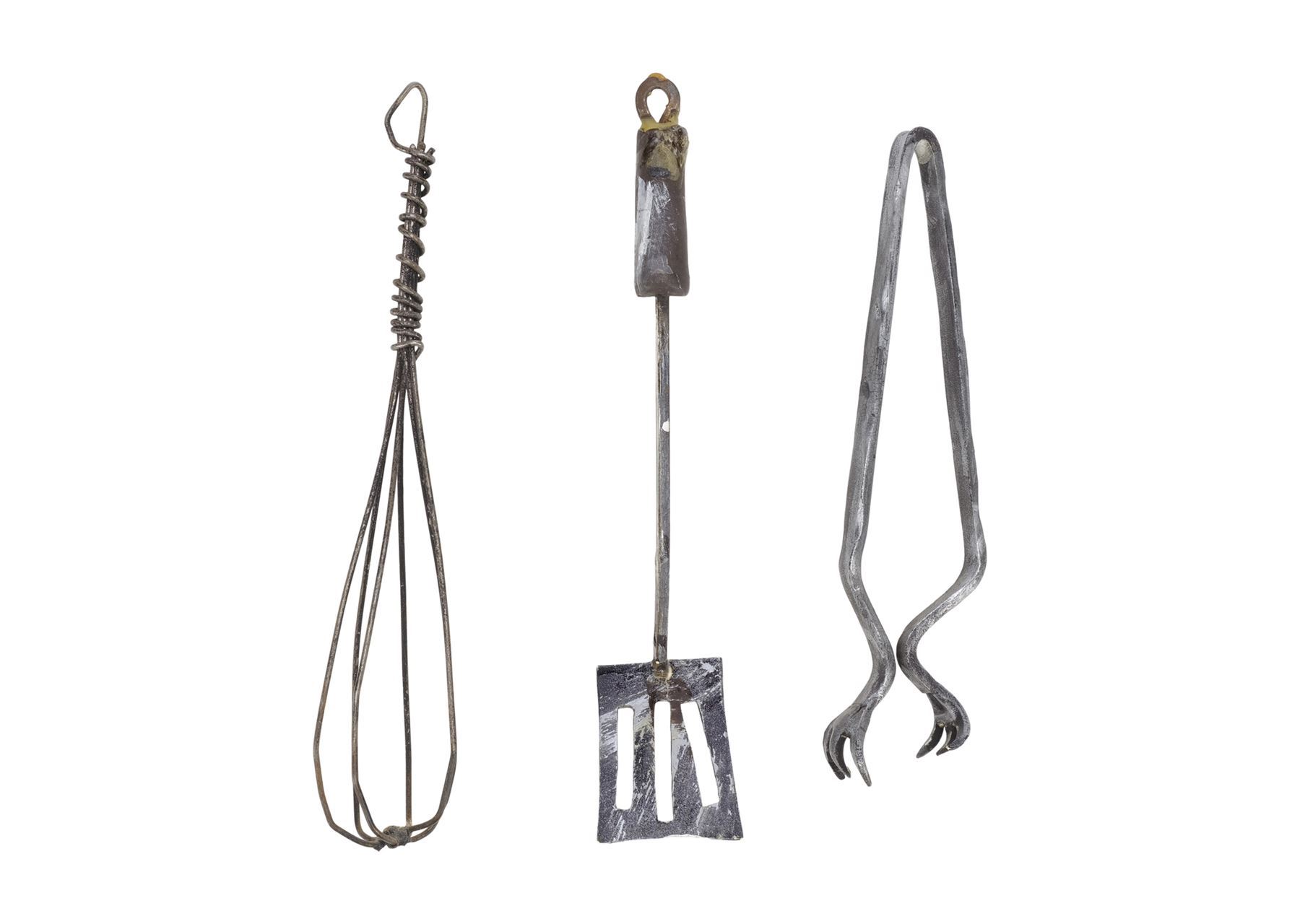 This lot consists of a black painted metal whisk twisted and molded together; a gray- and white-painted spatula with a metal shaft and handle; and a pair of gray- and white-painted three-prong tongs. This lot exhibits chipping paint, glue residue, and rust from age. Dimensions: 8" x 1.5" x 0.5" (20.5 cm x 4 cm x 1.5 cm)