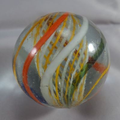 Rare Swirl. Orange and White Alternating Latticinio Core. Six outer bands. Very hard to find in these larger sizes. Two subsurface moons and a small subsurface moon. Still views very well. Germany, circa 1860-1920. 1-3/8". Near Mint (8.3).
