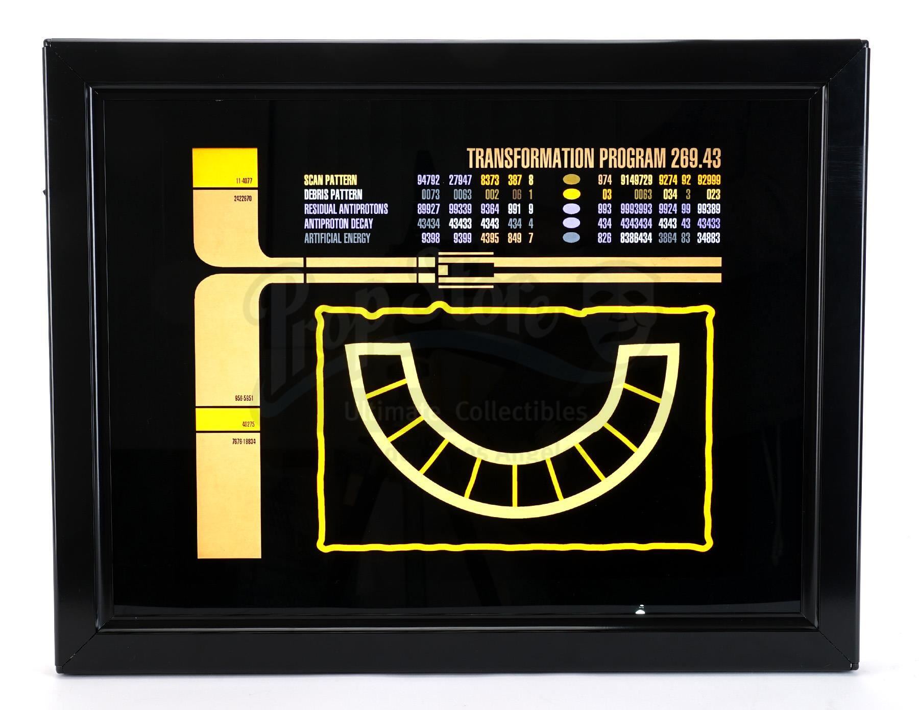 This lot will be auctioned on Thursday, July 1st. The auction will begin at 9:00am PDT and lots are sold sequentially via live auctioneer; tune in to the live streaming broadcast on auction day to follow the pace. Note other lots in the auction may close on June 29th or June 30th. A framed, light-up transformation program LCARS panel from the sci-fi television series Star Trek: The Next Generation. In the Season 7 episode "Masks," Geordi LaForge (LeVar Burton) used a LCARS terminal to access a program that was transforming the Enterprise into an ancient temple. This black plastic-framed, illuminating panel features orange, yellow, and blue graphics reading "Transformation Program 269.43" with ancient symbols and a power switch on the side. It is in excellent overall condition with minor scuffing and scratches from handling. Dimensions: 21.5" x 16.75" x 1" (54.75 cm x 42.75 cm x 2.75 cm) Contains electronic components; see notice in the Buyer's Guide. Estimate: $1,000 - 1,500
