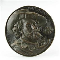Lot # 1067: INTERESTING BRASS BARREL TOP. Relief decorated with a William Shakespeare type bust. Outside “Petrvs Pavlvs Rvbens”. SIZE: 23-1/2” dia. CONDITION: Very good. 9-97149