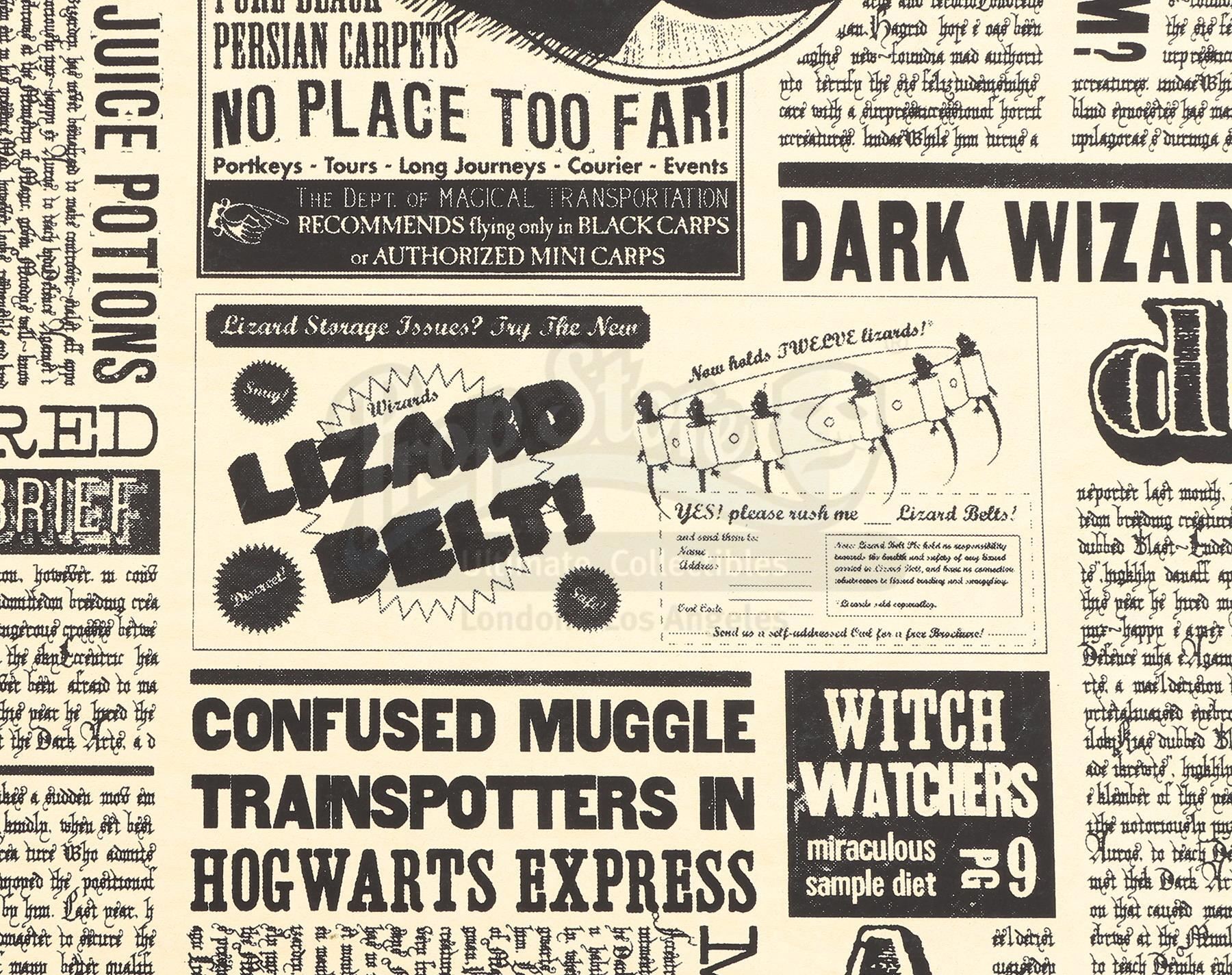 This lot will be auctioned on Tuesday, June 29th. The auction will begin at 9:00am PDT and lots are sold sequentially via live auctioneer; tune in to the live streaming broadcast on auction day to follow the pace. Note other lots in the auction may close on June 30th or July 1st. A Daily Prophet headlined "Dumbledore: Daft or Dangerous" from David Yates' fantasy-adventure sequel Harry Potter and the Order of the Phoenix. Cornelius Fudge's (Robert Hardy) wizarding world newspaper, the Daily Prophet, ran stories discrediting Dumbledore (Michael Gambon) over Voldemort's (Ralph Fiennes) return. Static versions of the newspapers were created for visual effects inserts of the characters moving on the page. This lot was originally won in a charity auction held at Providence St. Joseph Medical Center in Burbank, CA. This Prophet edition features black text printed on yellow newsprint stock headlined "Dumbledore: Daft or Dangerous?" with the story below it headlined "Fudge Voted Stylish Wizard" and seven additional pages of magic-related stories. Also included is a Warner Brothers Certificate of Authenticity. The paper is in good overall condition with some signs of handling from production. Dimensions: 17.5" x 15" x 3" (44.5 cm x 38.25 cm x 7.75 cm) Estimate: $4,000 - 6,000