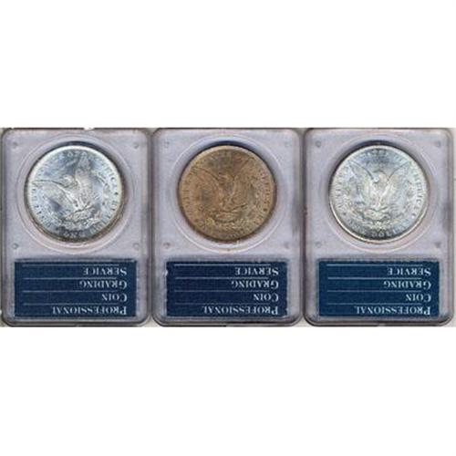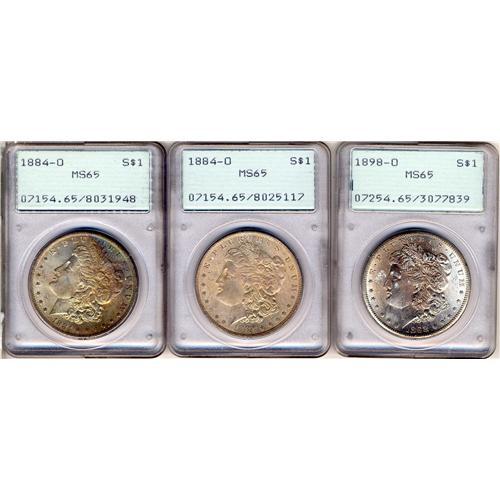 Lot of Three 1884-O Morgan Dollars Mixed Grades PCGS. Original toning on these. (#7154)