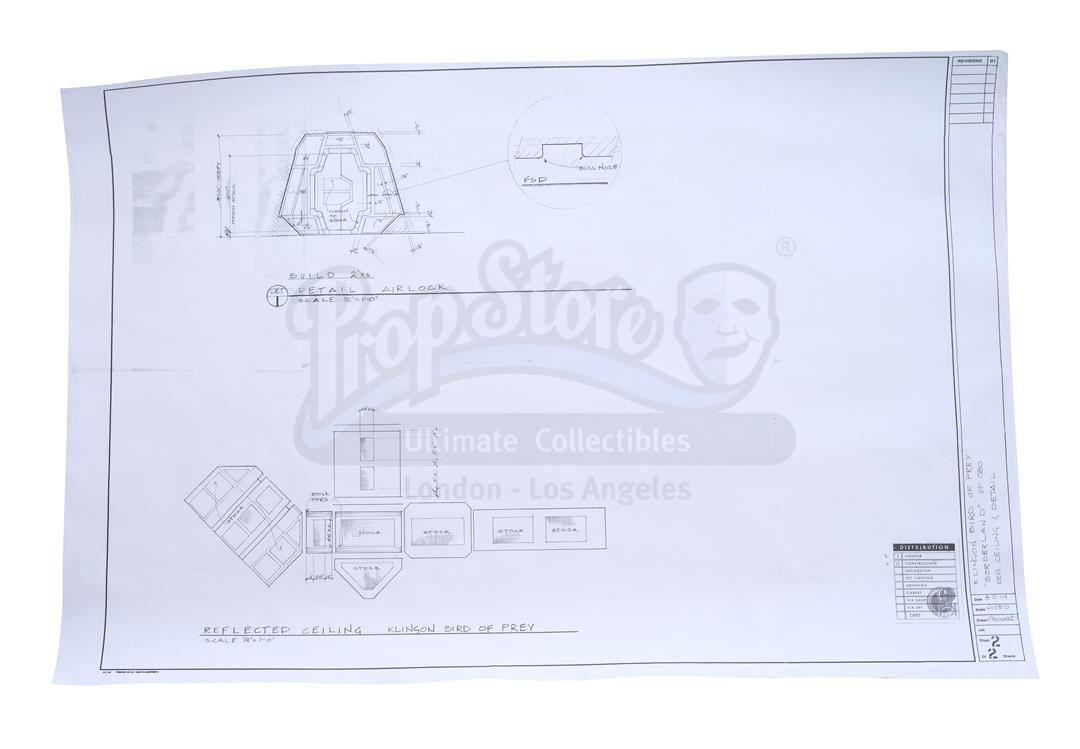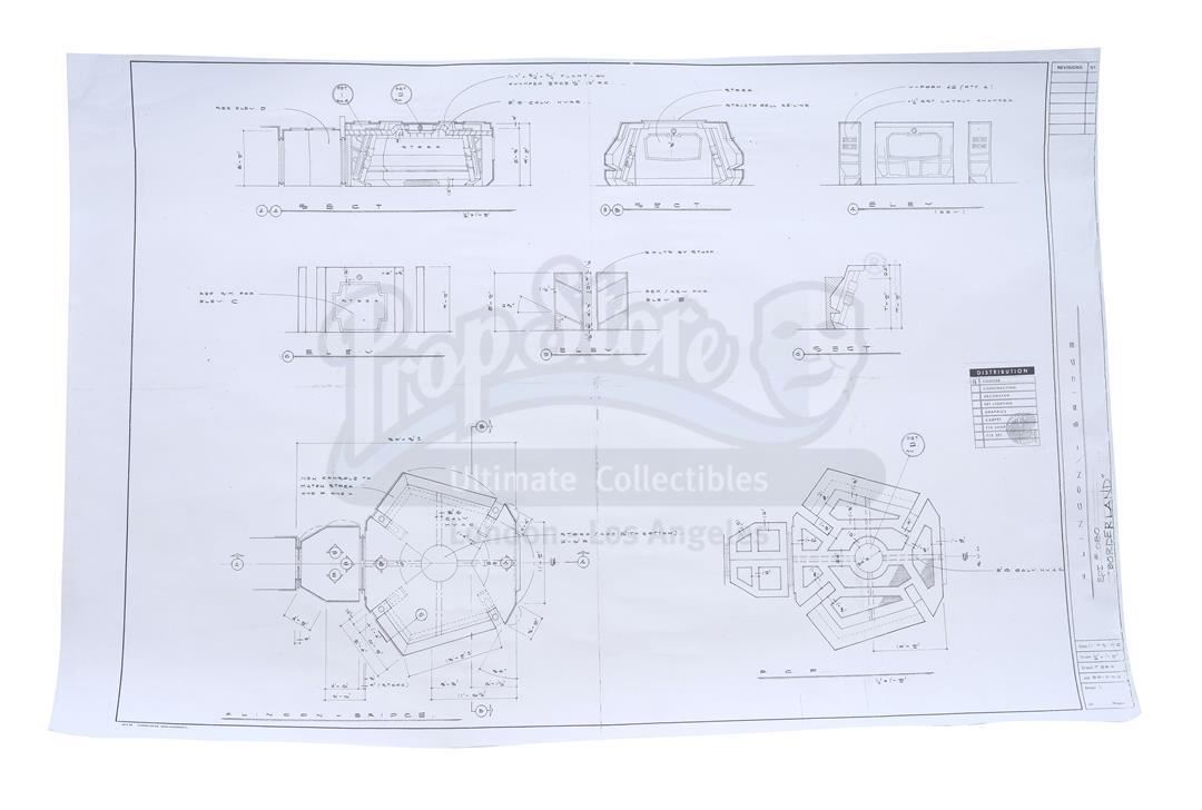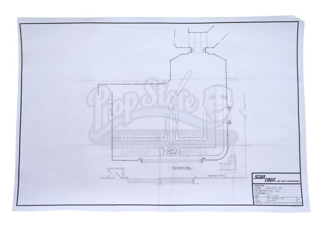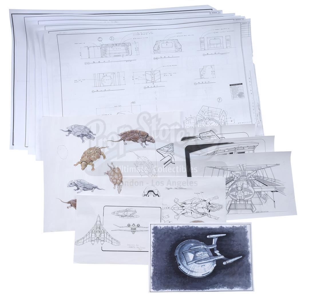 This lot will be auctioned on Thursday, July 1st. The auction will begin at 9:00am PDT and lots are sold sequentially via live auctioneer; tune in to the live streaming broadcast on auction day to follow the pace. Note other lots in the auction may close on June 29th or June 30th. An isolinear chip transparency, blueprints, and concept art from the sci-fi series Star Trek: The Next Generation and Star Trek: Enterprise. The isolinear chip transparency and shuttle bay blueprint come from the iconic sci-fi series Star Trek: The Next Generation. Isolinear chips were an advanced computer chip used for both information storage and operational control throughout Captain Picard's (Patrick Stewart) Starship Enterprise and other vessels of the era. The Enterprise had multiple shuttle bays used for both the storage of its own fleet of shuttlecraft as well as the shuttles of visitors to the Federation flagship. Additional blueprints and concept art prints come from Star Trek: Enterprise and include five Klingon set concept art prints; two Enterprise NX-01 concept prints; two Enterprise bridge concept prints; an engine room concept print; an Enterprise painting print; and two Novan Digger concept prints. The lot is in good overall condition with production wear throughout, including scuffing and scratching to the panel. Dimensions (largest): 37.25" x 2.5" x 2.5" (94.75 cm x 6.5 cm x 6.5 cm); (smallest): 18" x 10" (45.75 cm x 25.5 cm) Sold without copyright; see notice in the Buyer's Guide. Estimate: $400 - 600